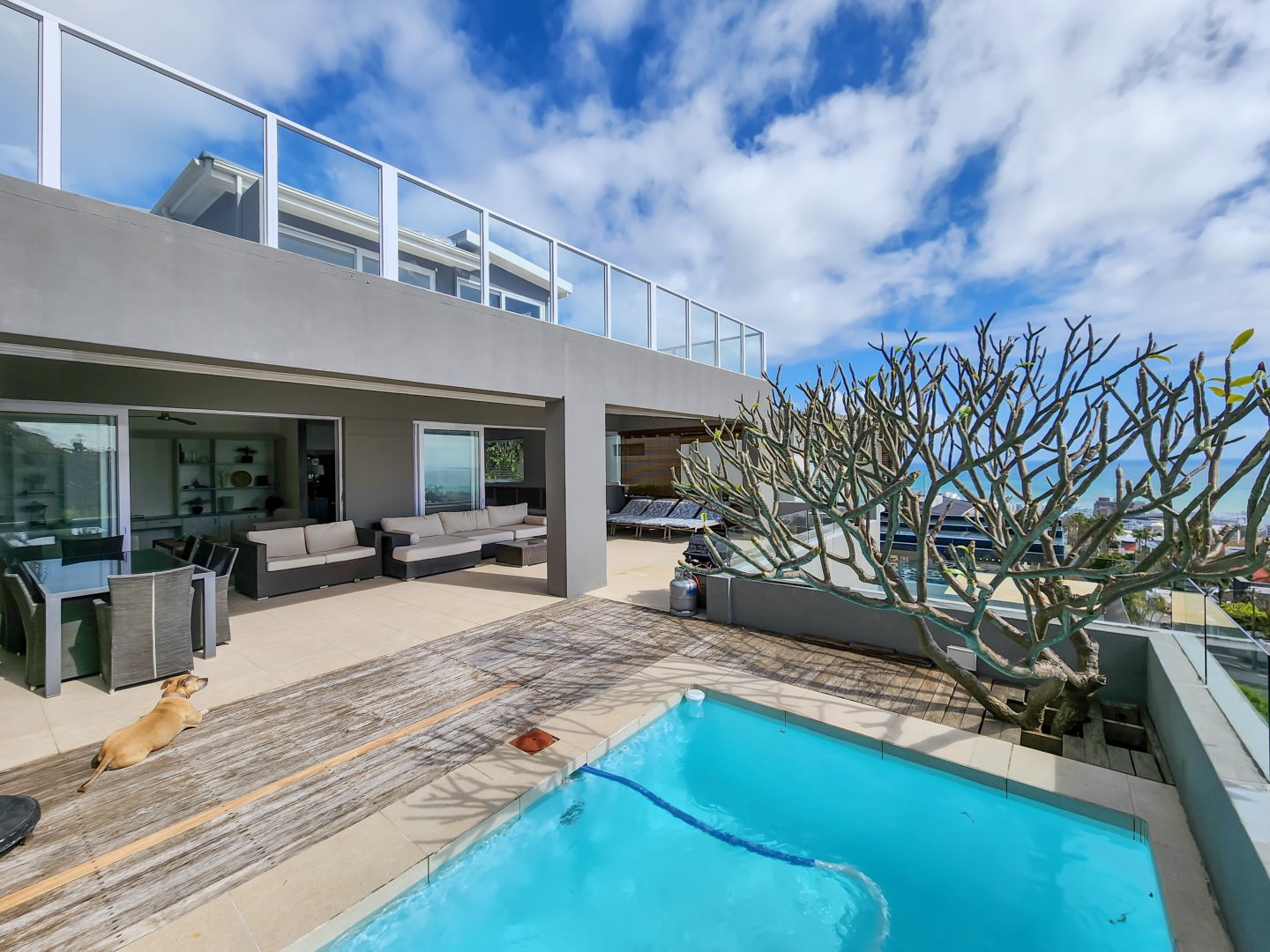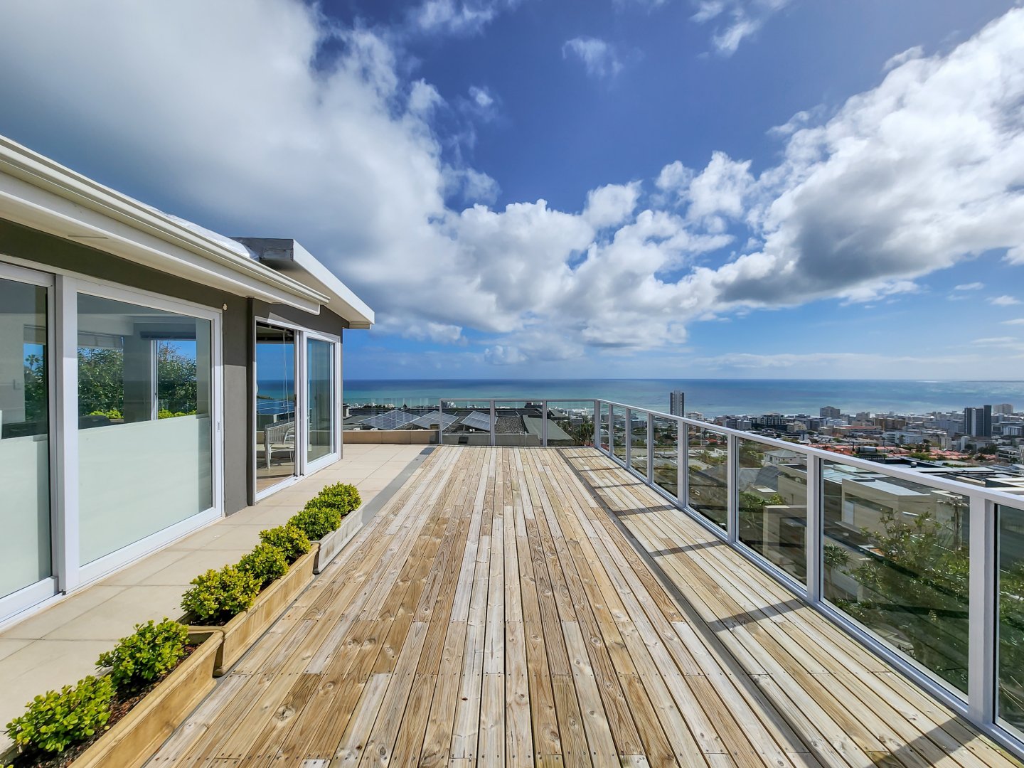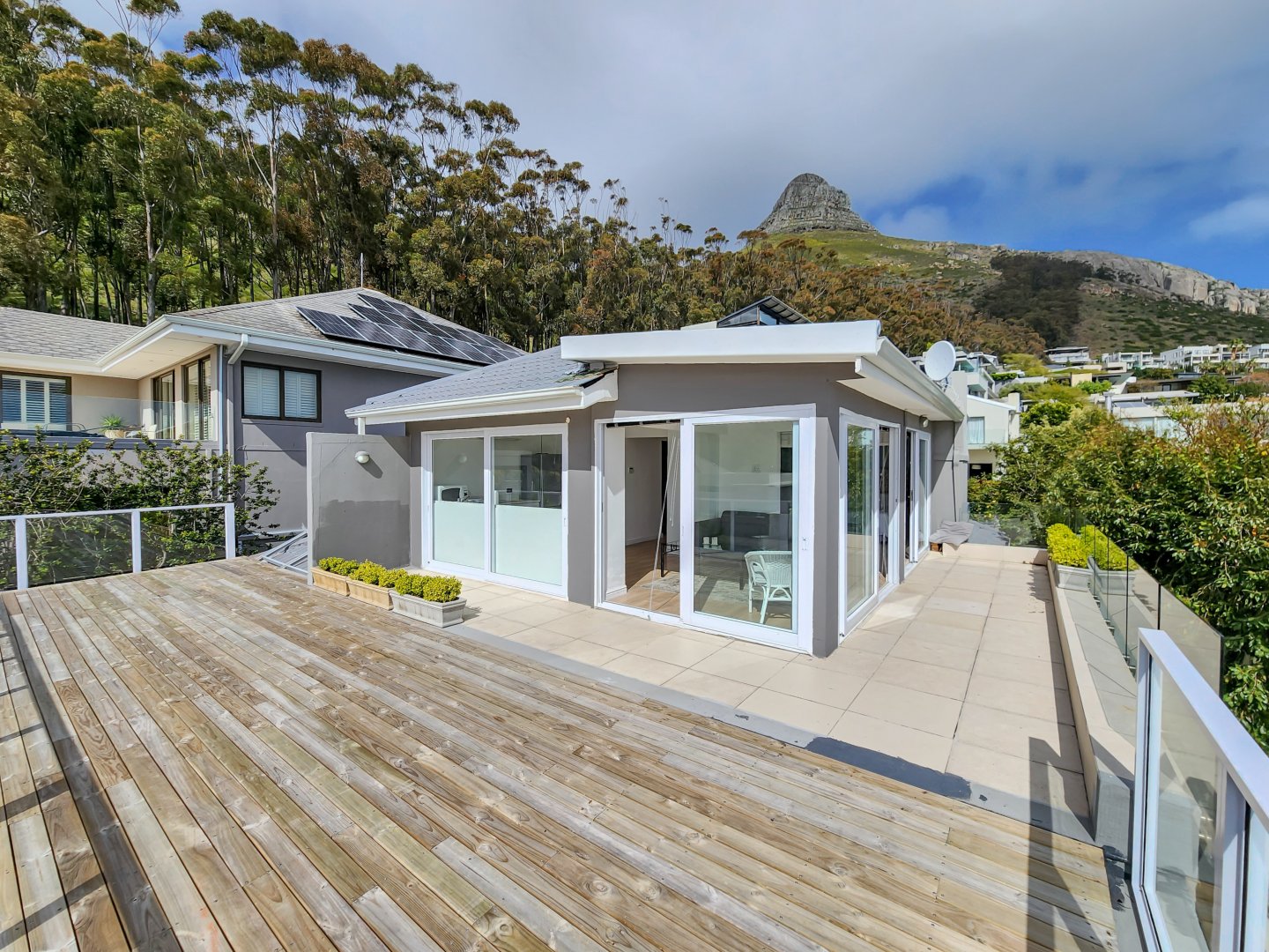Perched high on the slopes of Lion’s Head in one of Cape Town’s most desirable suburbs and situated in an almost wind-free zone, this elegant and contemporary home offers panoramic ocean views extending to the horizon, as well as close-up vistas of Lion’s Head at the rear.
