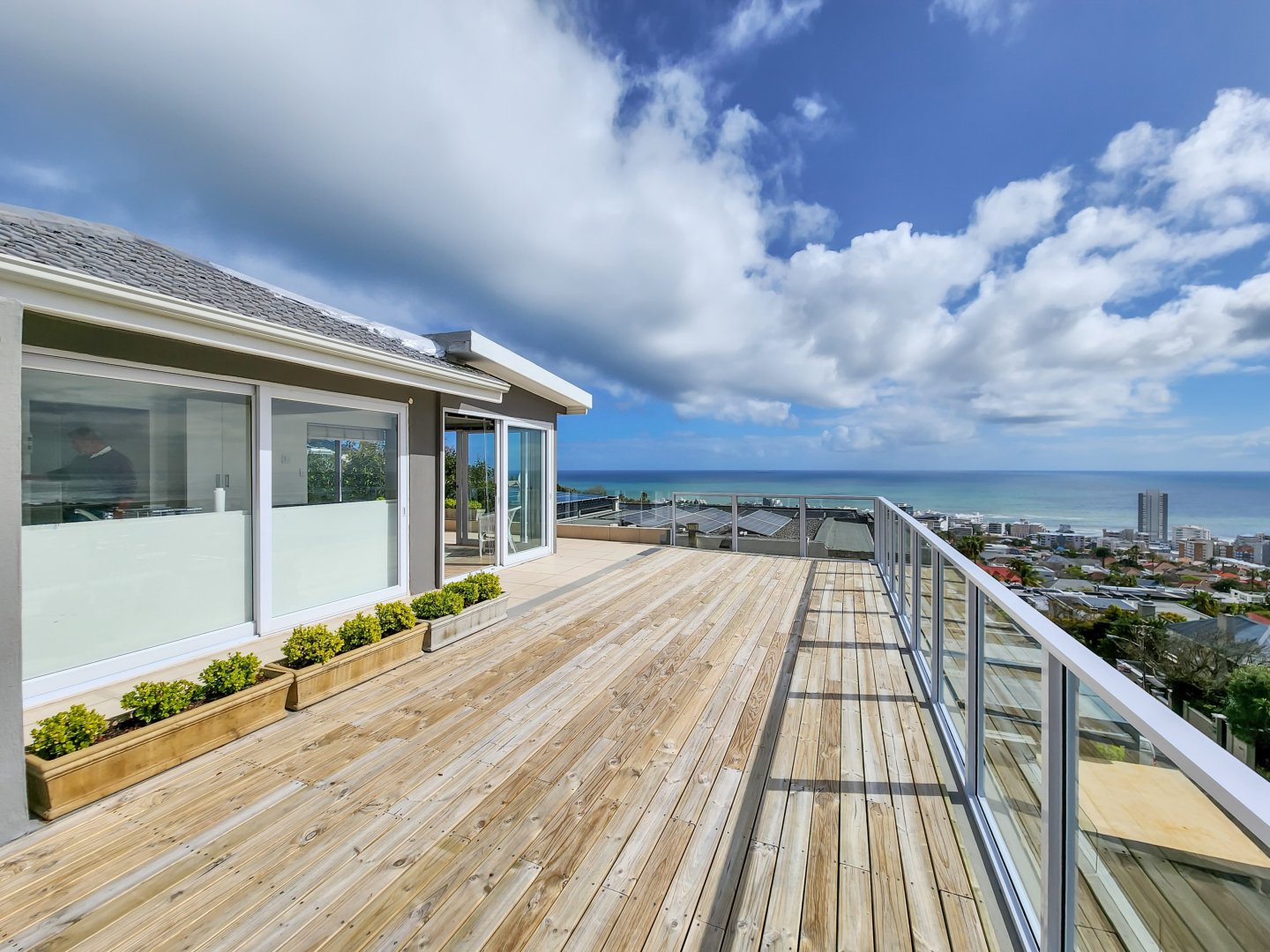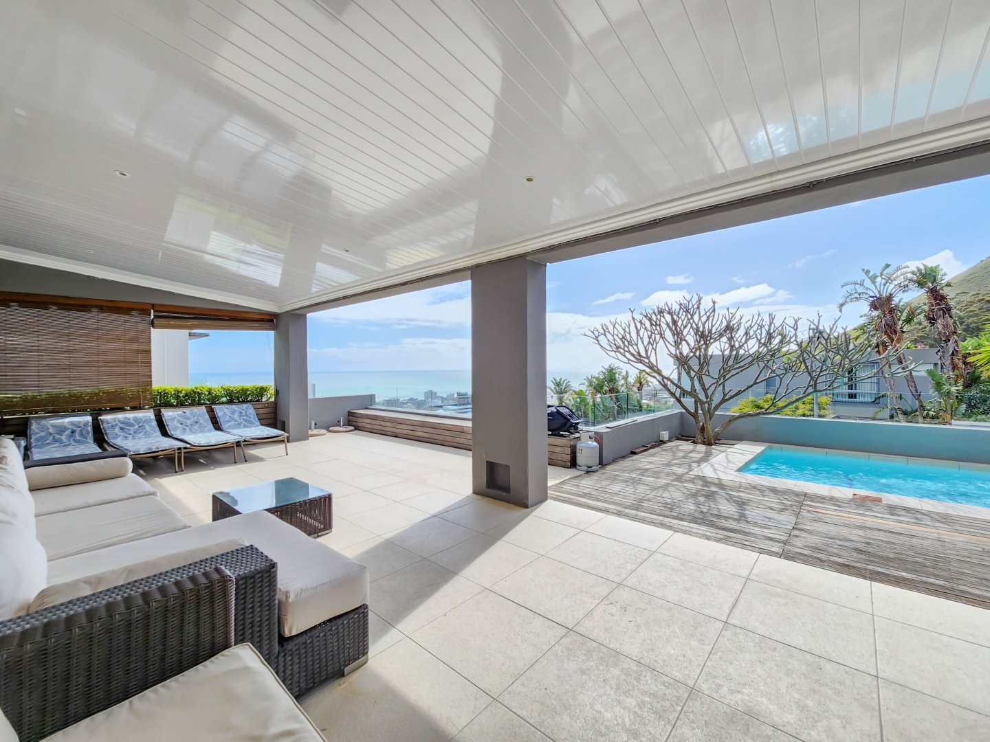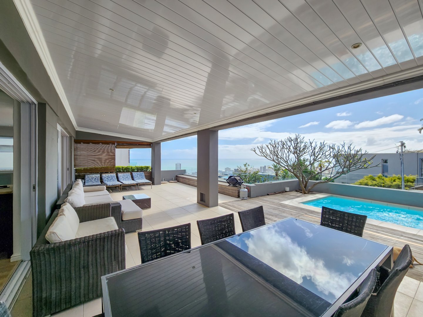 Perched high on the slopes of Lion’s Head in one of Cape Town’s most desirable suburbs and situated in an almost wind-free zone, this elegant and contemporary home offers panoramic ocean views extending to the horizon, as well as close-up vistas of Lion’s Head at the rear.