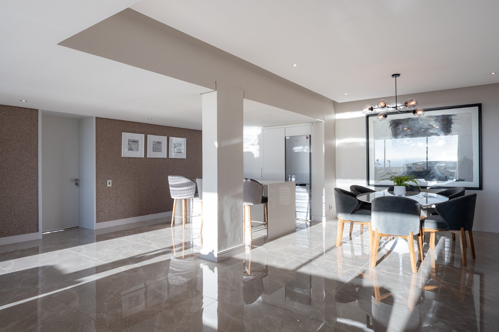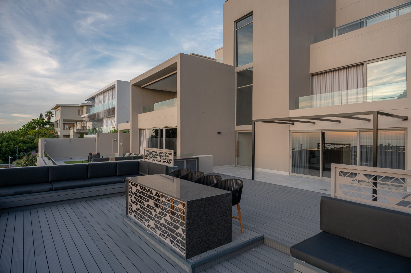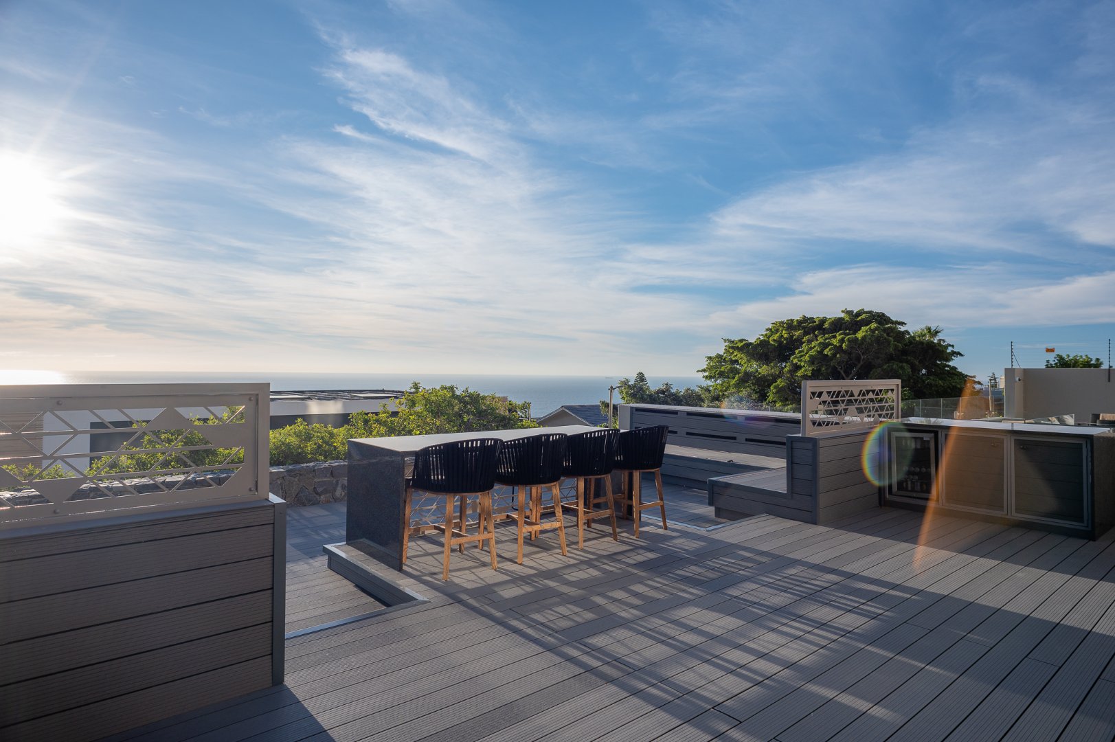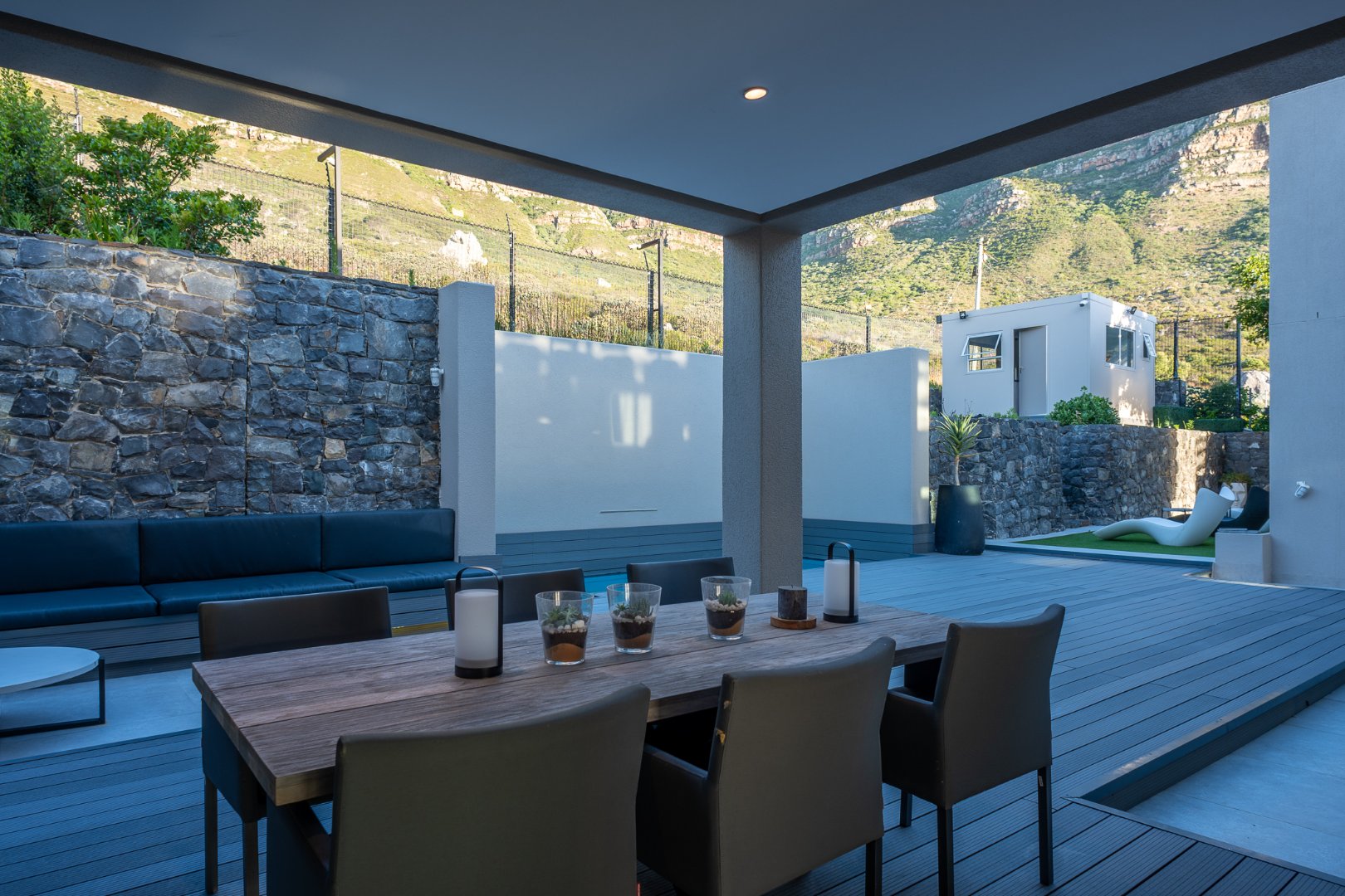 One level down you will find the main living area which has a beautiful open plan kitchen, dining room and boasts 2 lounges. There is a covered lounging terrace which offers ocean views and on the mountain side you have another entertainment terrace with gas braai and pool deck. On this level you also have 2 ensuite bedrooms each connecting to an outdoor area.