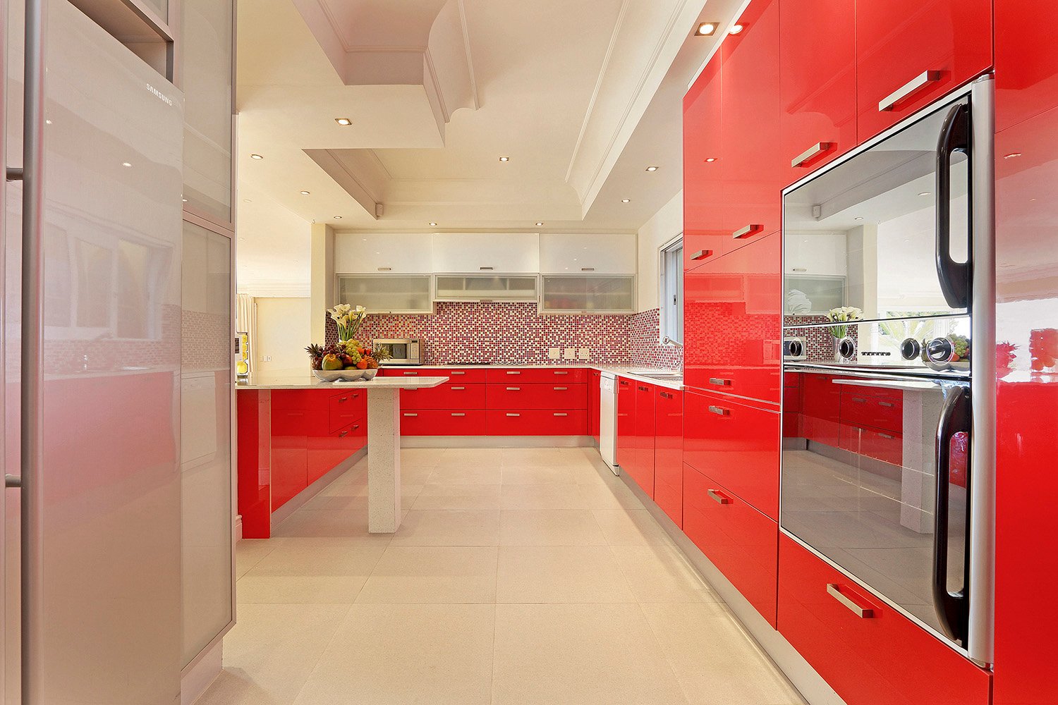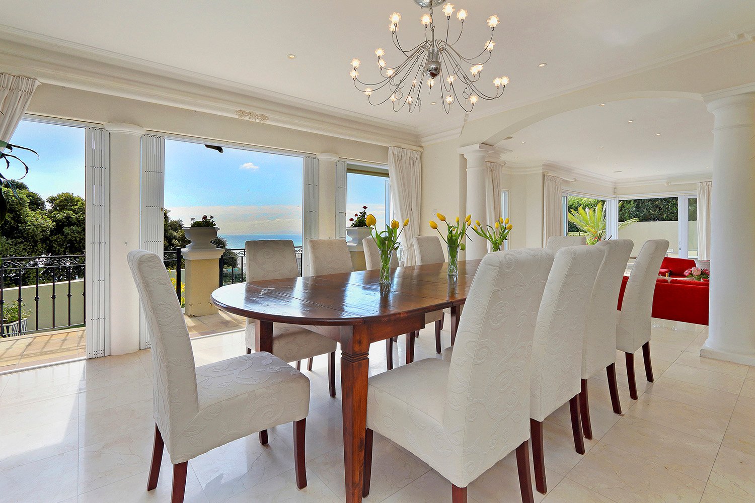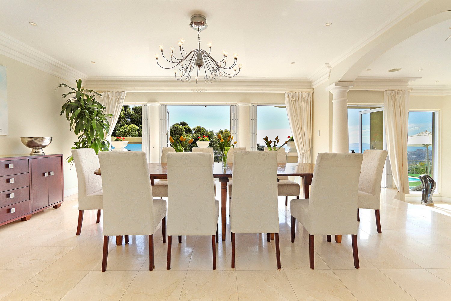 The entrance leads onto an open-plan dining room that seats 14, a fully equipped modern kitchen, and an enormous lounge that leads onto the swimming pool entertainment area providing panoramic views of the ocean and city below.