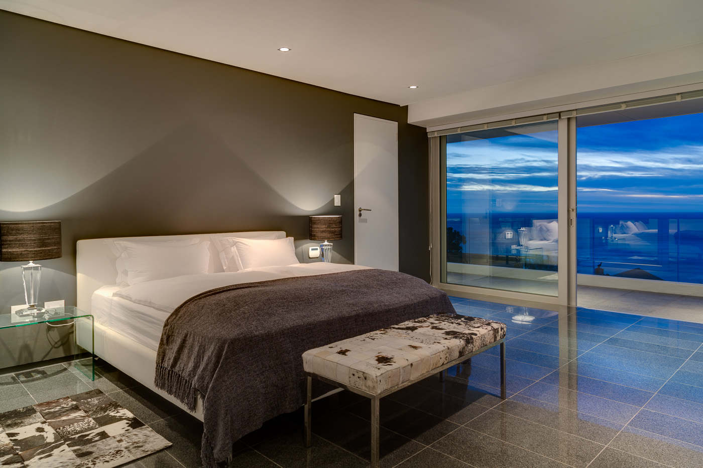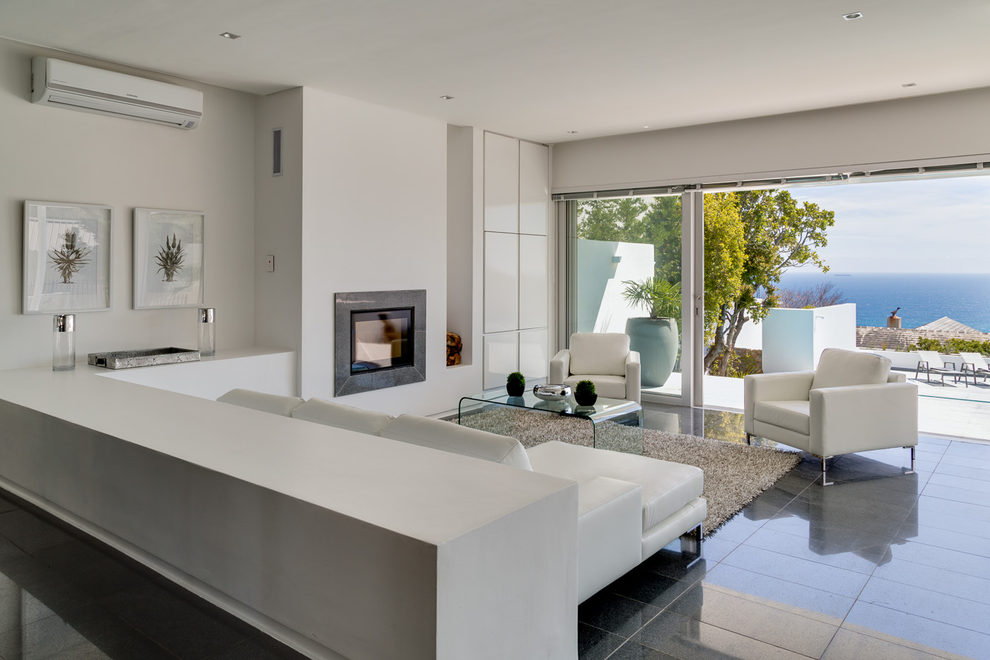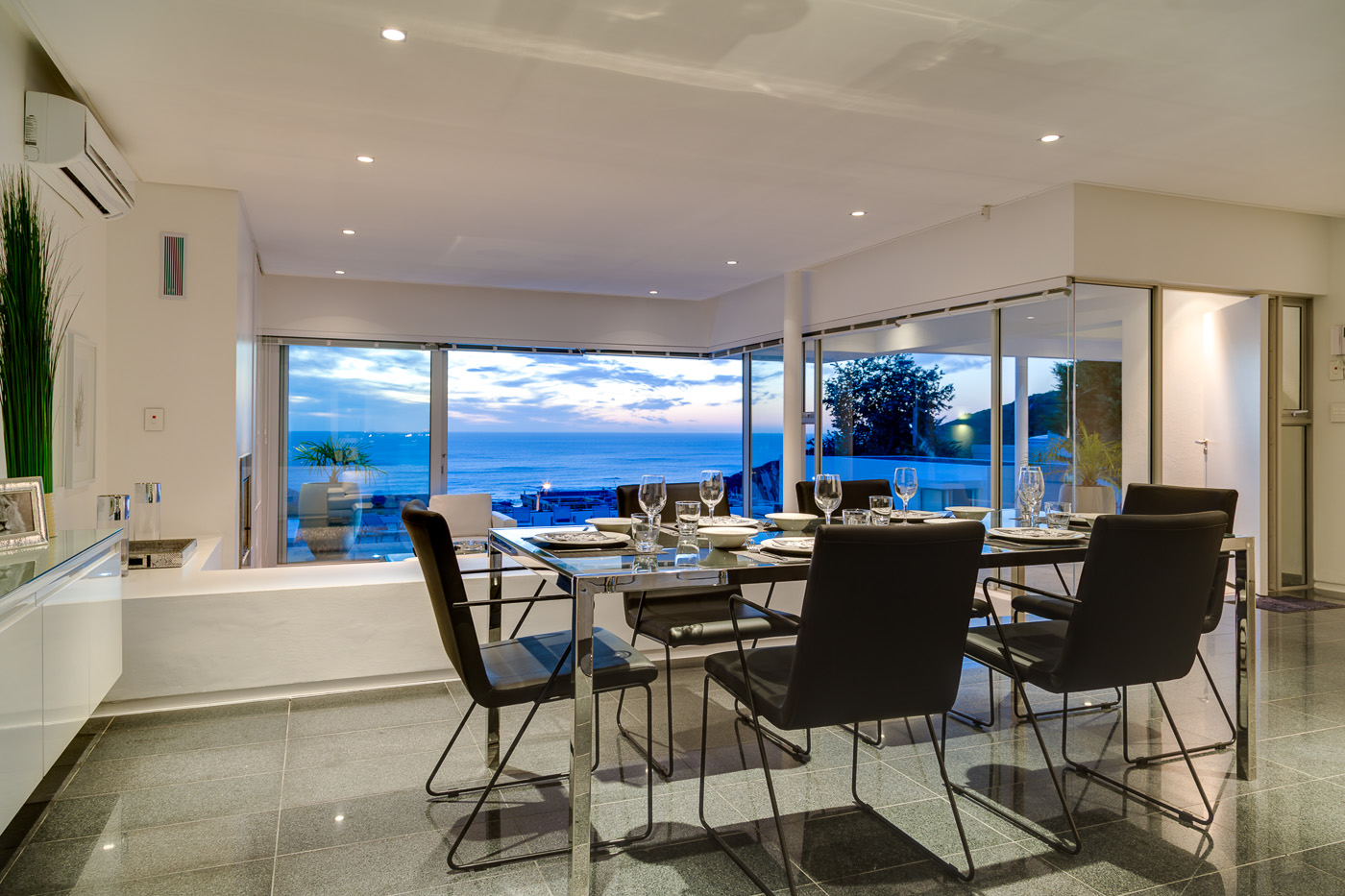 Maximum views, maximum space. This stylish luxury villa in Camps Bay is ideally located in a quiet cul-de-sac in the wind-sheltered Glen area, offering spectacular sea views from both levels. The architecture and interior design are sleek and modern, with cool, subtle tones. A generous terrace leads to the large 9.5 X 4.5 meter swimming pool and garden. The pool terrace is comfortably furnished with loungers and sofas where guests can enjoy 180 degree sea and mountain views.