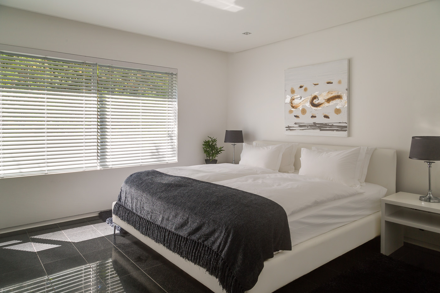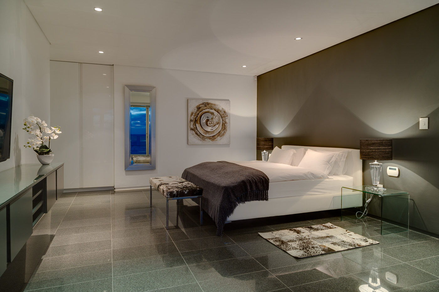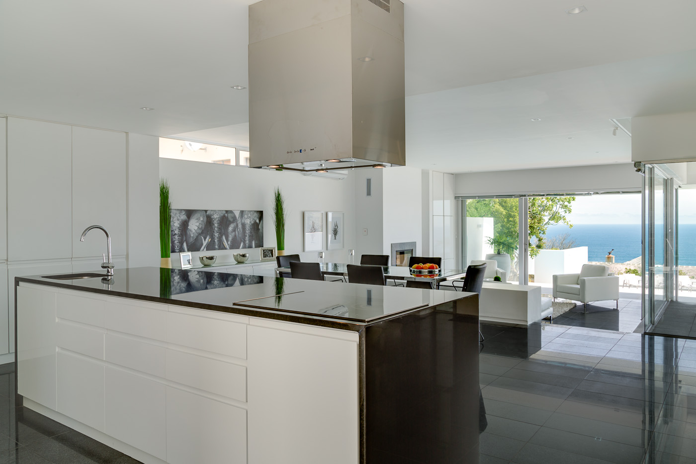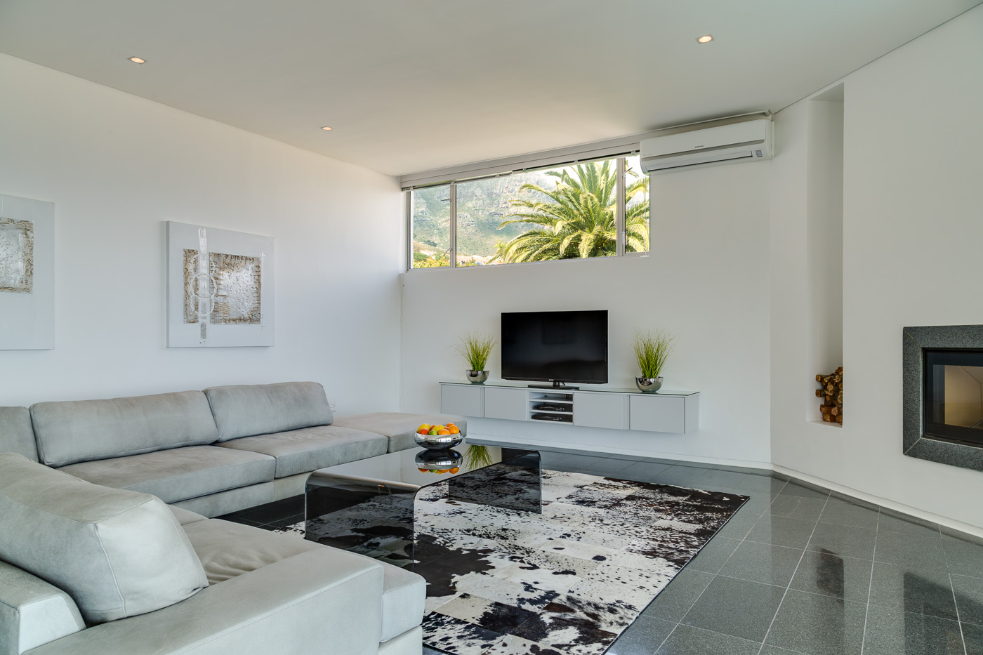Maximum views, maximum space. This stylish luxury villa in Camps Bay is ideally located in a quiet cul-de-sac in the wind-sheltered Glen area, offering spectacular sea views from both levels. The architecture and interior design are sleek and modern, with cool, subtle tones. A generous terrace leads to the large 9.5 X 4.5 meter swimming pool and garden. The pool terrace is comfortably furnished with loungers and sofas where guests can enjoy 180 degree sea and mountain views.