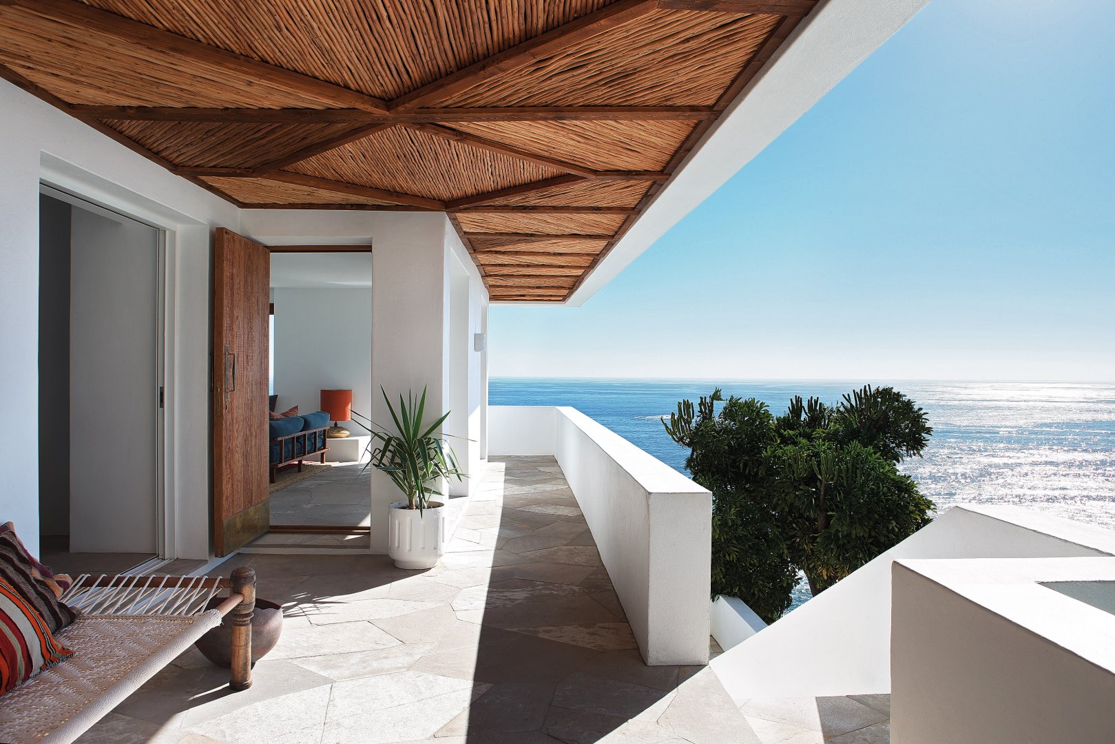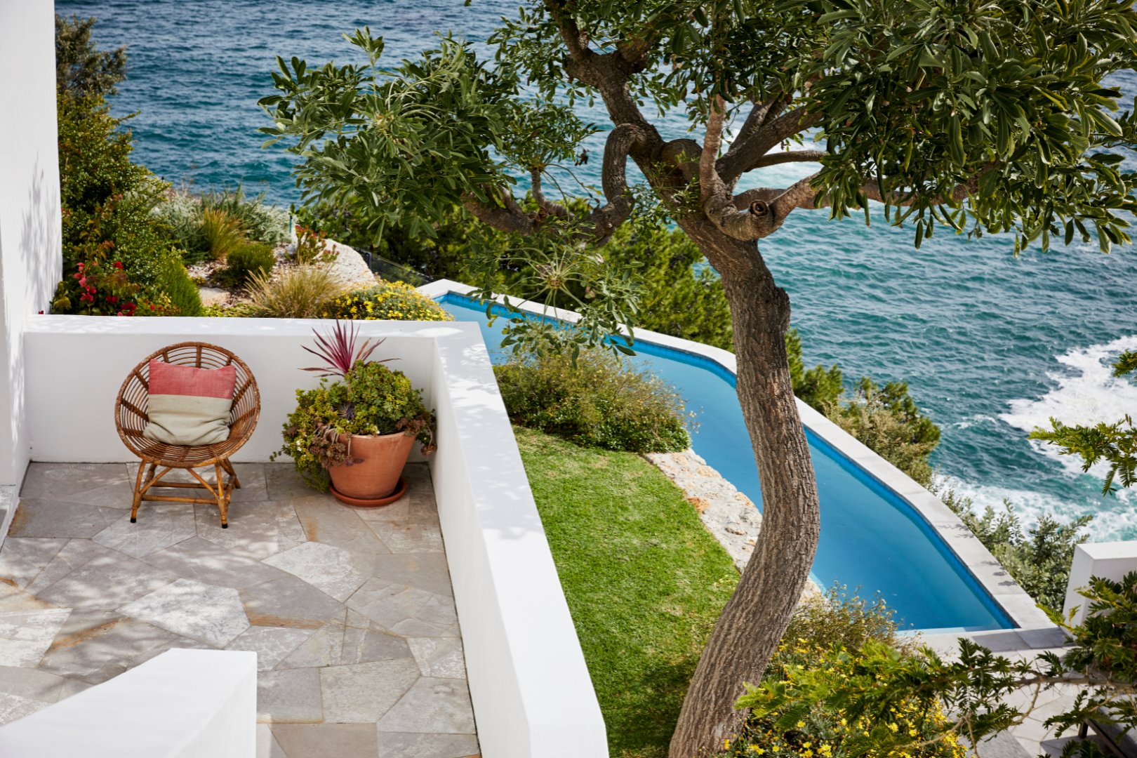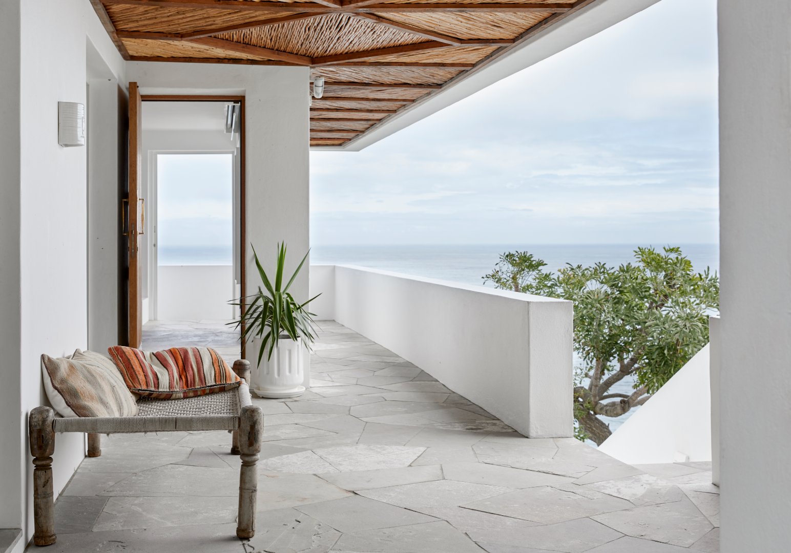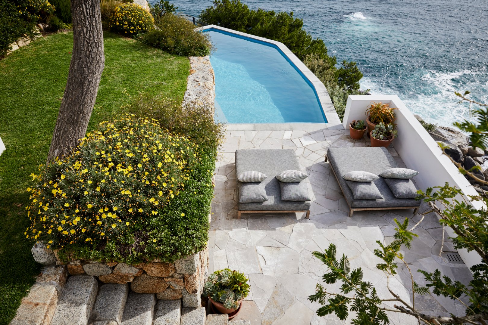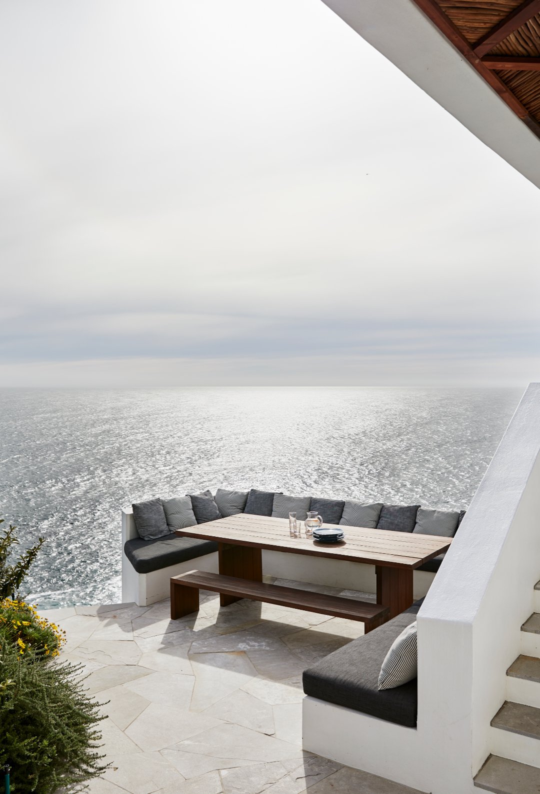 Suspended above the cliff, the outdoor terrace encourages comfortable entertaining with seating up to 16 guests.