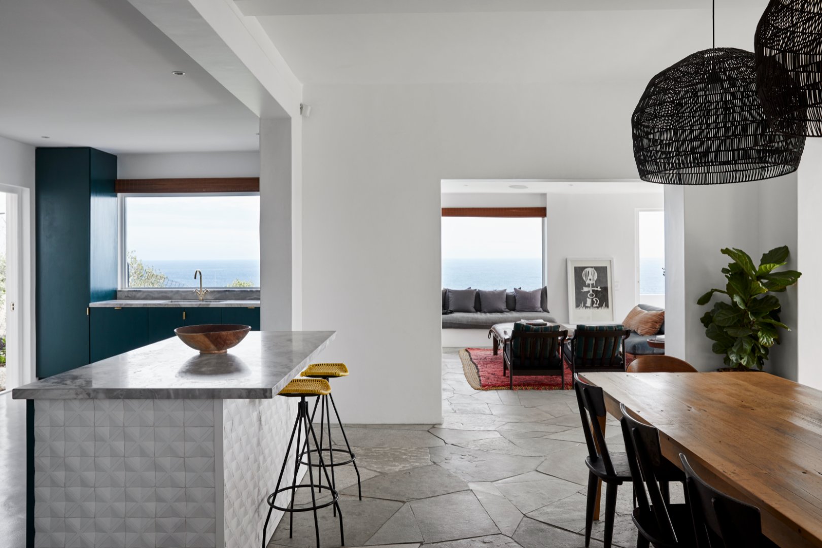 The open-plan kitchen, lounge and dining room have a warm and luminous ambience mirroring the outside views and making the most of the abundant natural light.