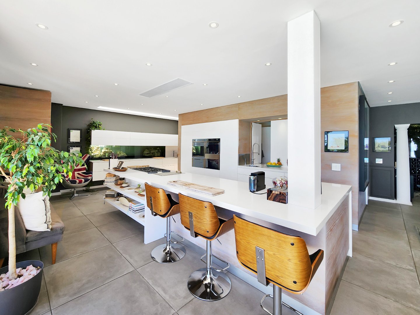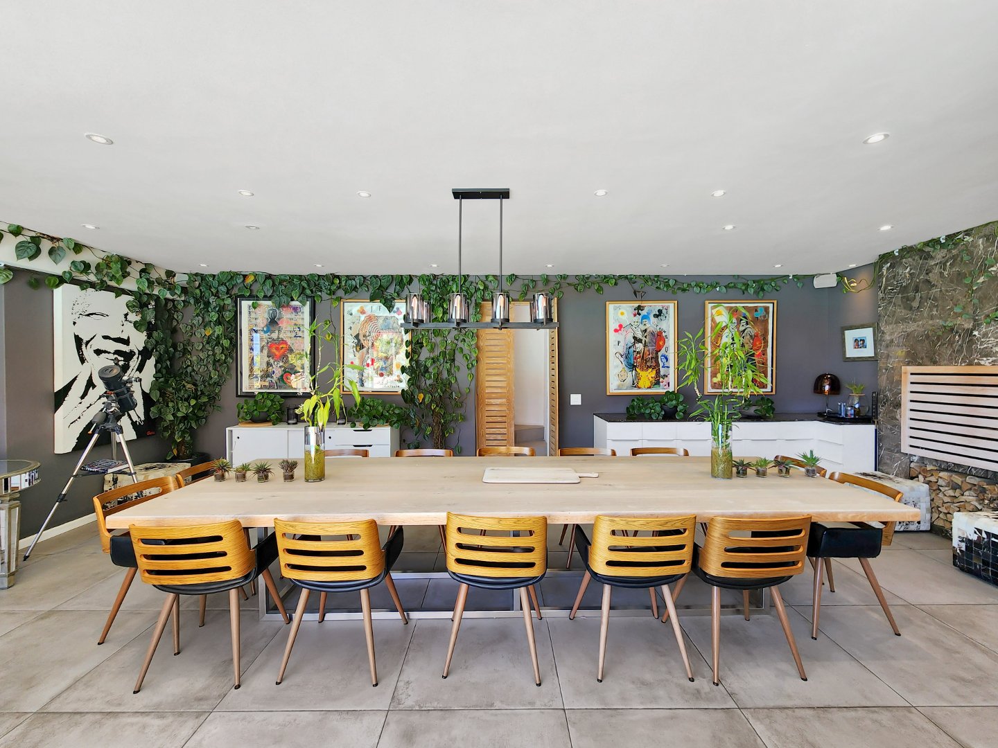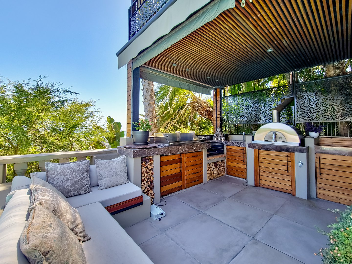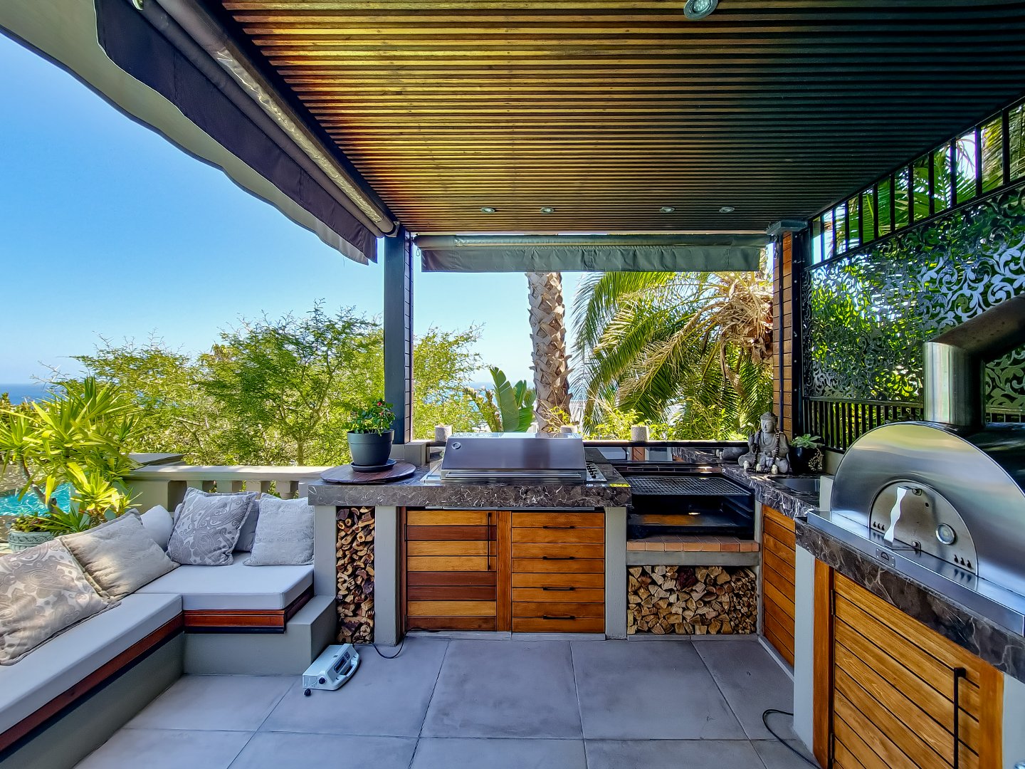 At the heart of the home lies a magnificent entertainer’s kitchen, where culinary creations come to life. From the indoor dining space, step outside to a perfectly curated entertainment area featuring a state-of-the-art outdoor braai, a traditional pizza oven, and a sparkling swimming pool that invites you to cool off or lounge in luxury. Surrounded by lush greenery, the outdoor spaces provide a serene backdrop for al fresco dining, sunset cocktails, or simply soaking in the tranquility of your surroundings.