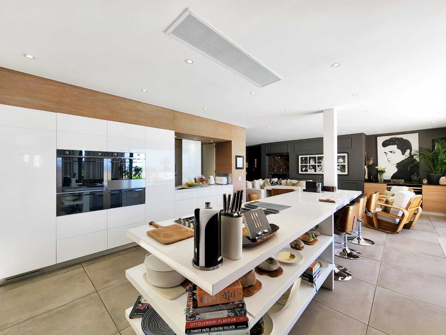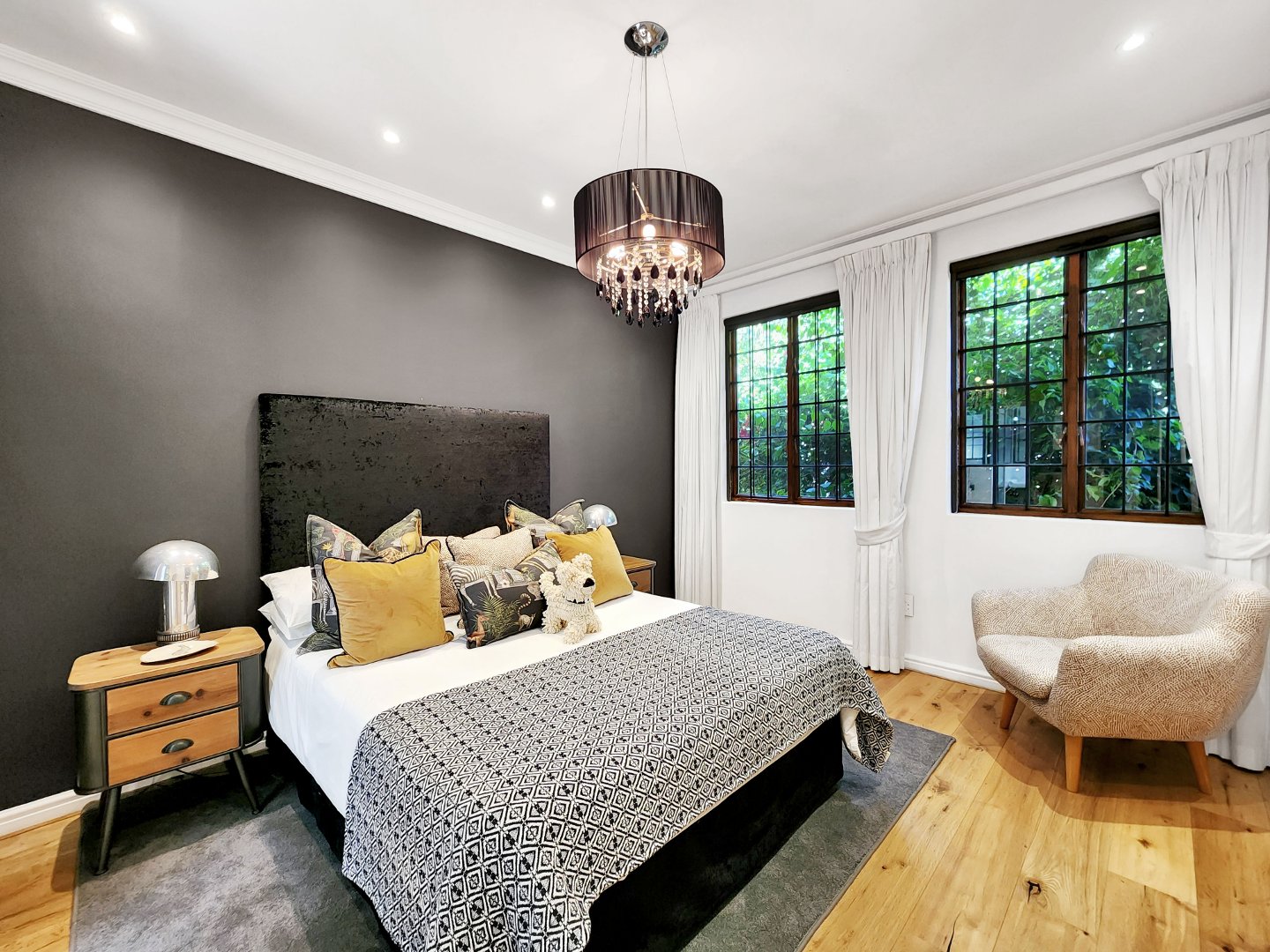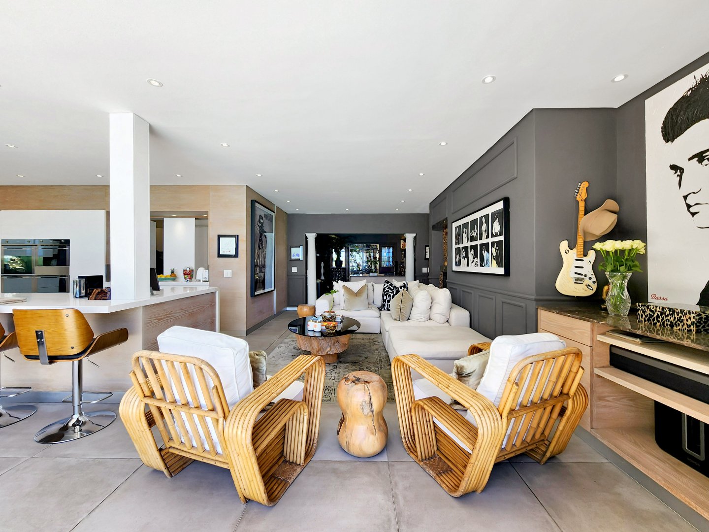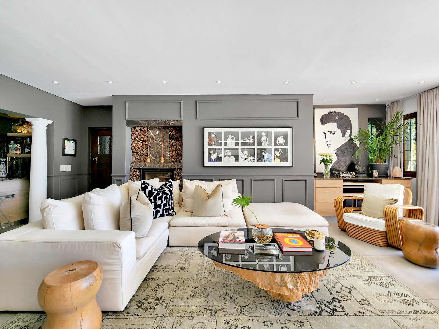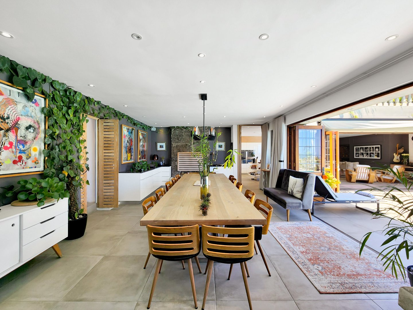At the heart of the home lies a magnificent entertainer’s kitchen, where culinary creations come to life. From the indoor dining space, step outside to a perfectly curated entertainment area featuring a state-of-the-art outdoor braai, a traditional pizza oven, and a sparkling swimming pool that invites you to cool off or lounge in luxury. Surrounded by lush greenery, the outdoor spaces provide a serene backdrop for al fresco dining, sunset cocktails, or simply soaking in the tranquility of your surroundings.