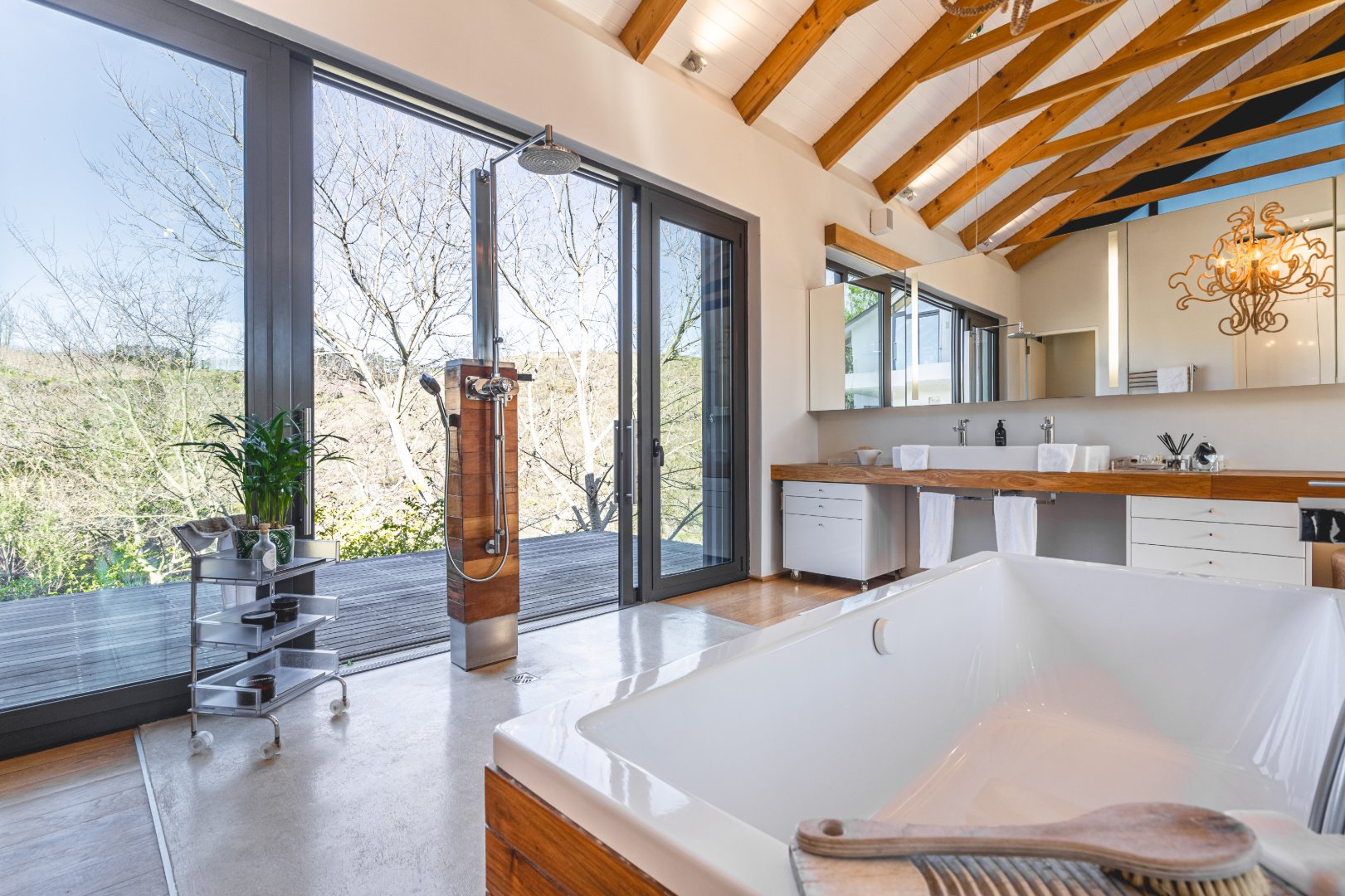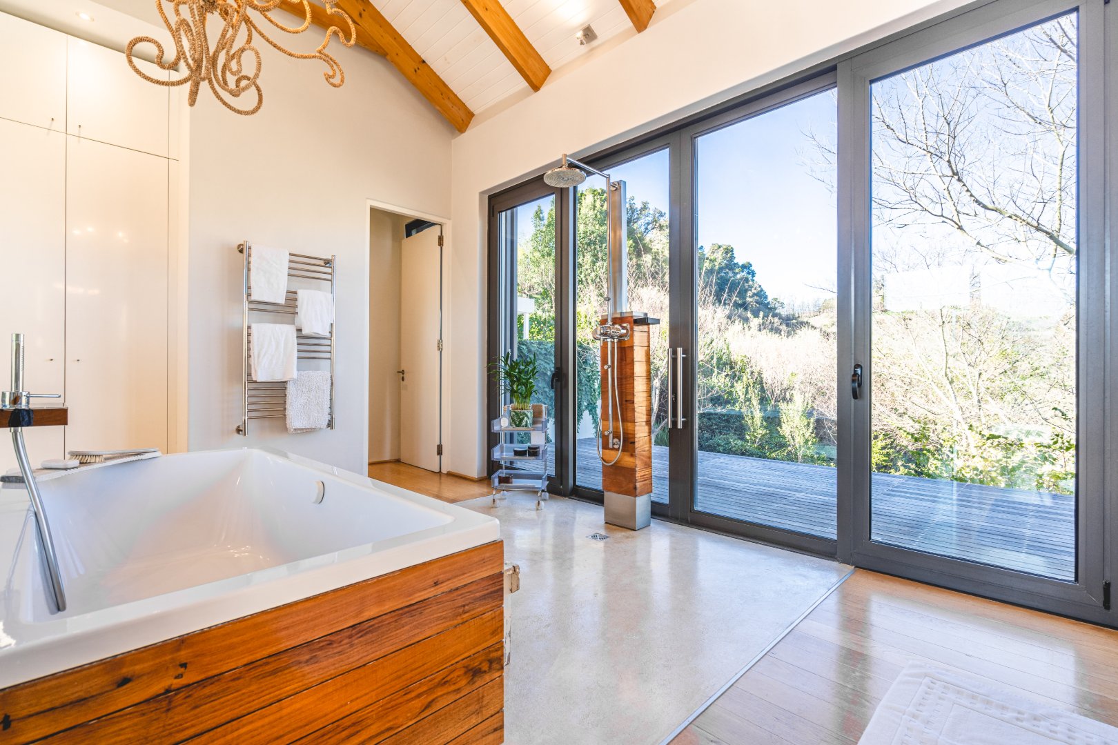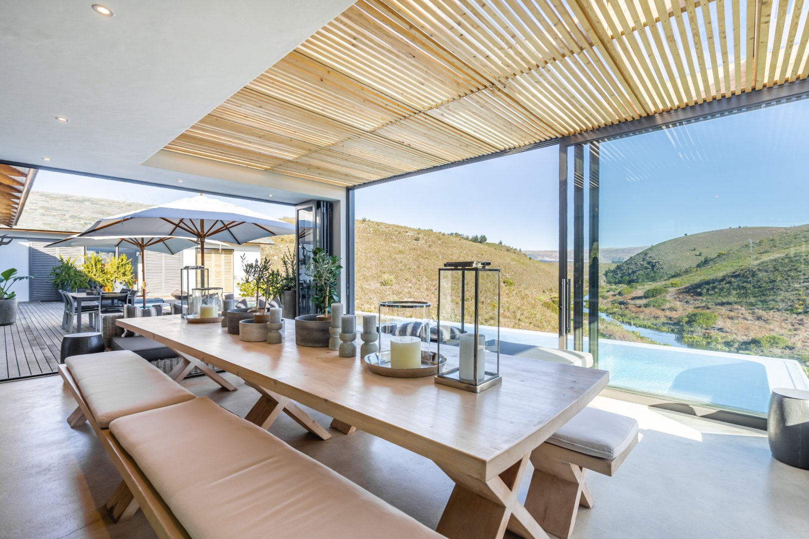 The outdoor living experience is simply spectacular. A striking pool and hot tub terrace overlook the winding Palmiet River, creating an idyllic setting for sunset gatherings, alfresco dining, or quiet moments immersed in the serenity of the surrounding landscape.