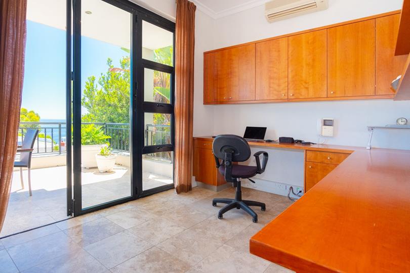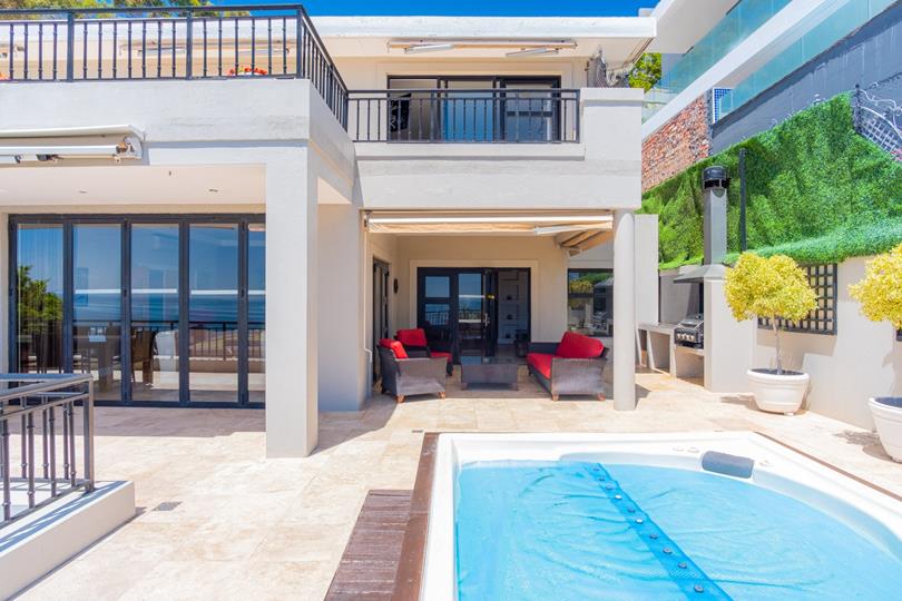 The main living area offers a large kitchen & scullery, with dining room, a TV room and separate formal lounge that connects to a spacious terrace with outdoor dining and lounging area, jacuzzi, a gas braai and beautiful ocean views. This level also has an office connecting to the terrace which offers the perfect work from home space.
