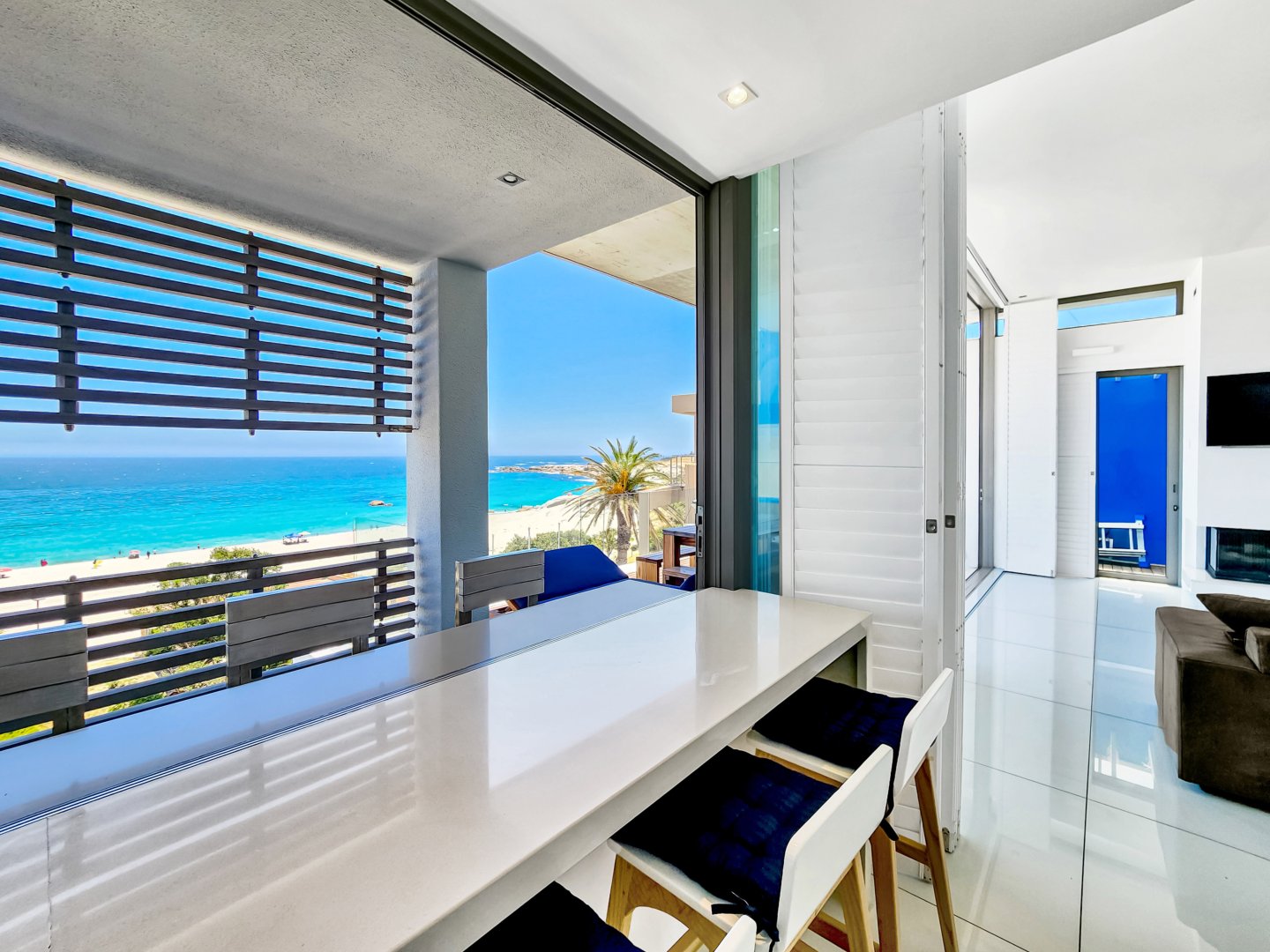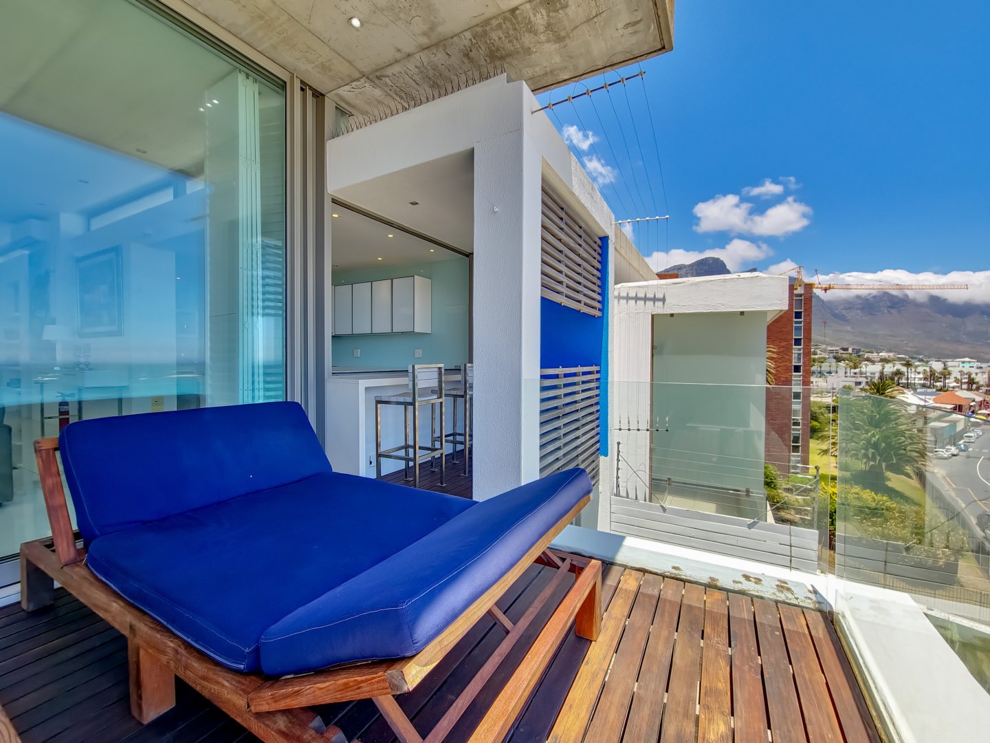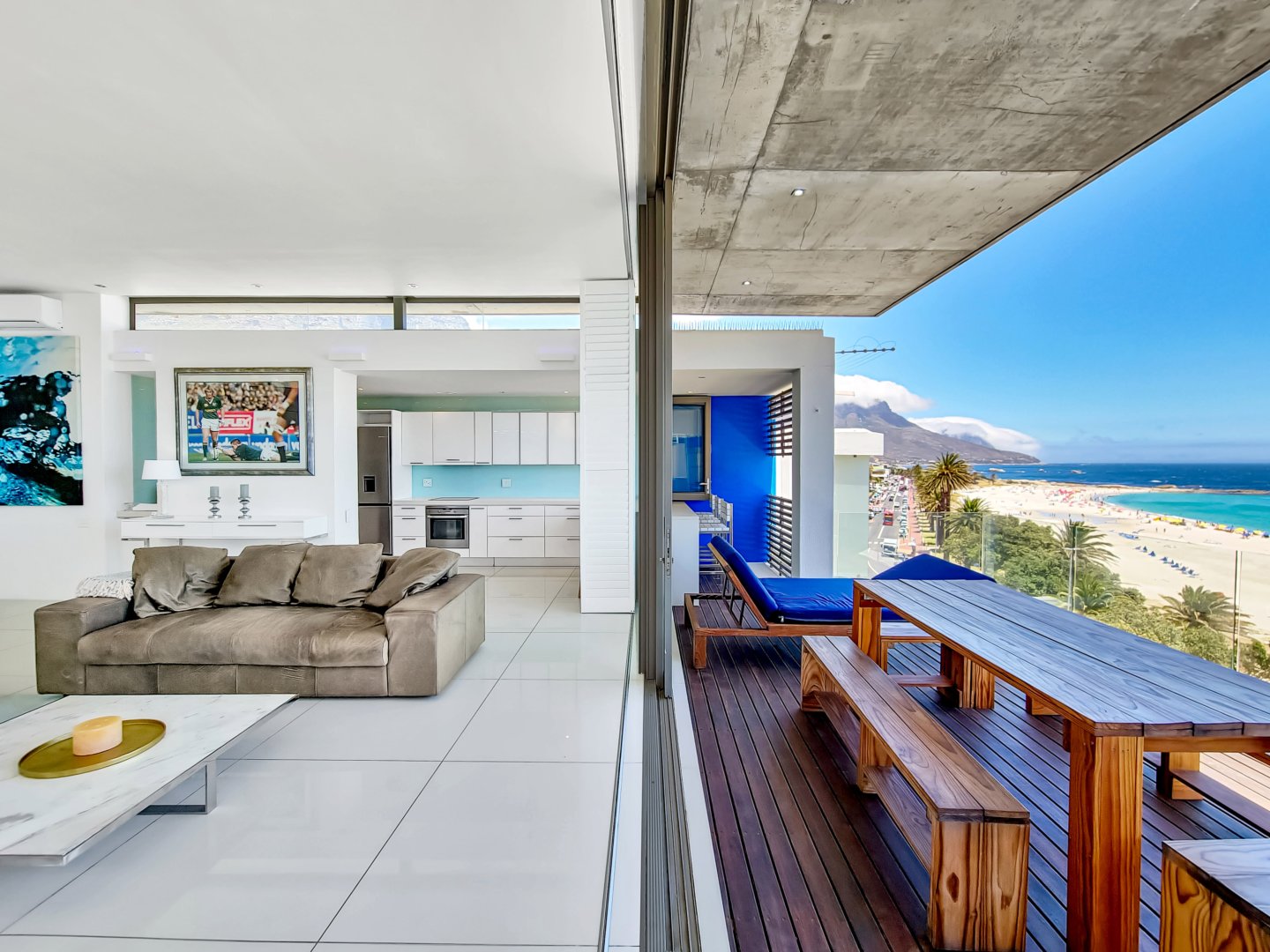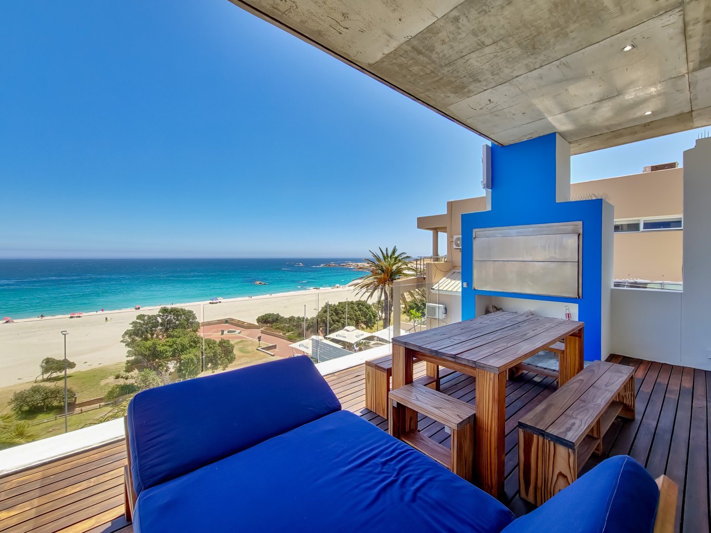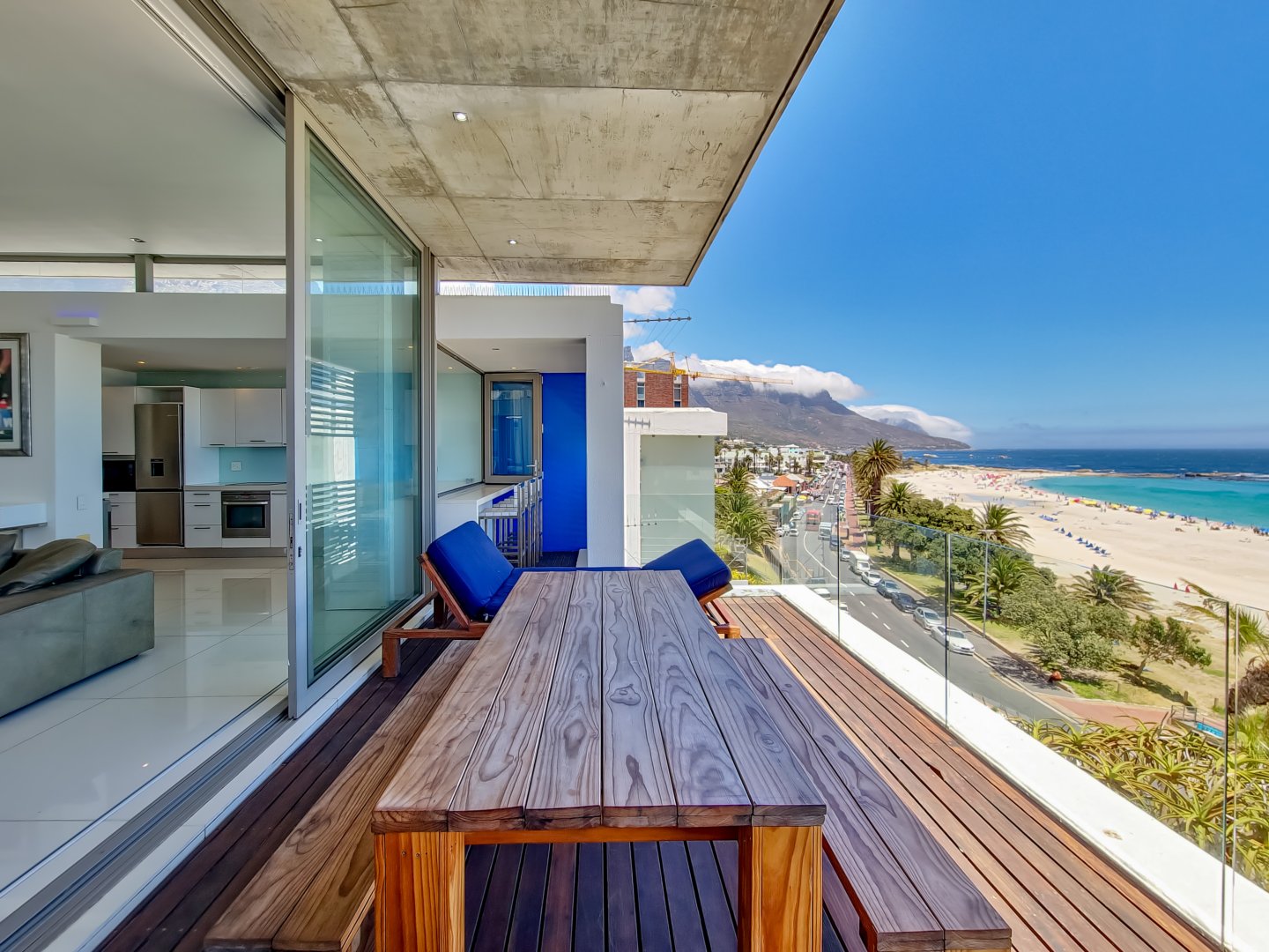 Situated directly across from Camps Bay beach and a short walk from the strip, it features a private deck with a sun lounger and barbecue area, providing an expansive view of Camps Bay.
