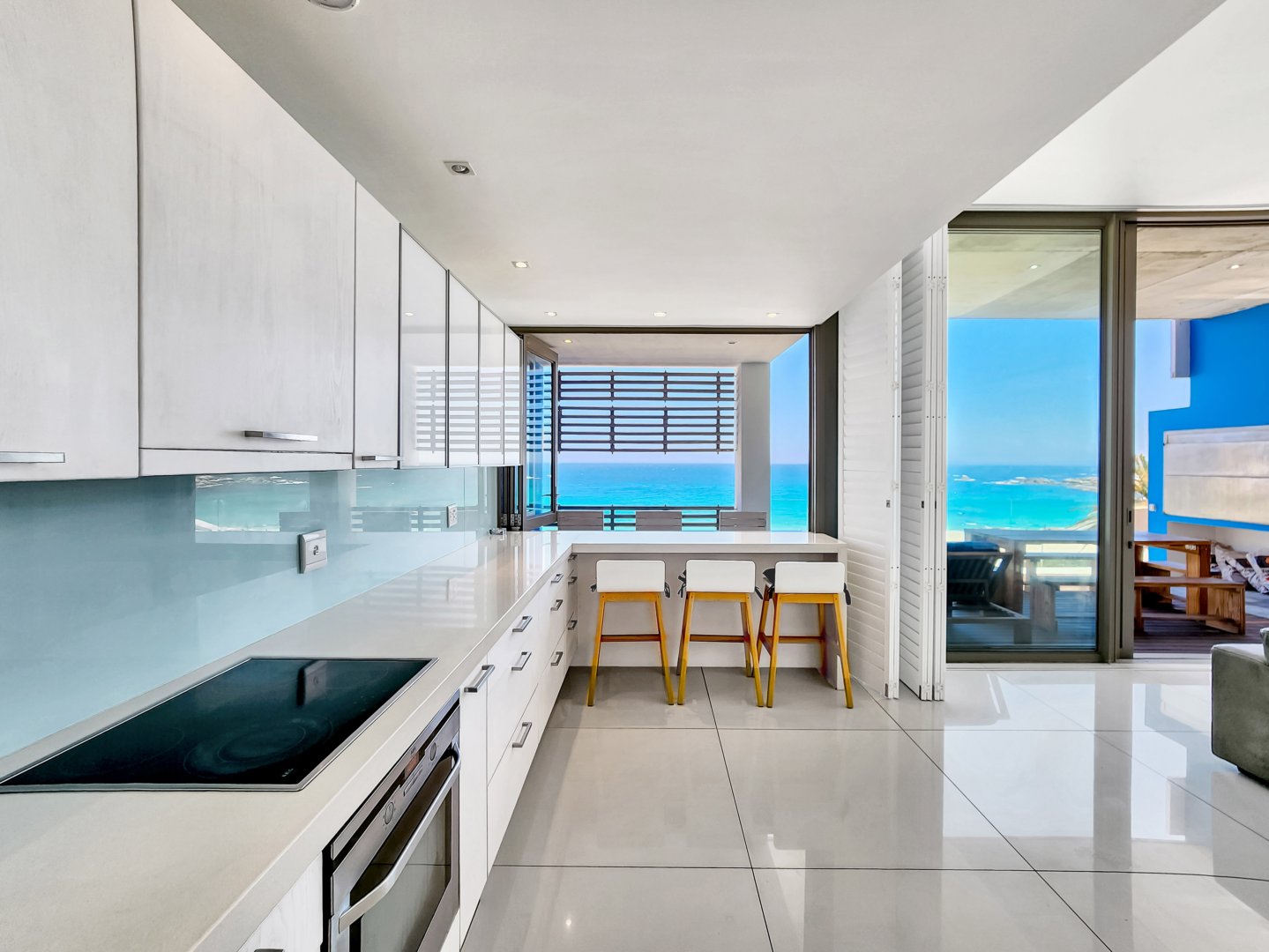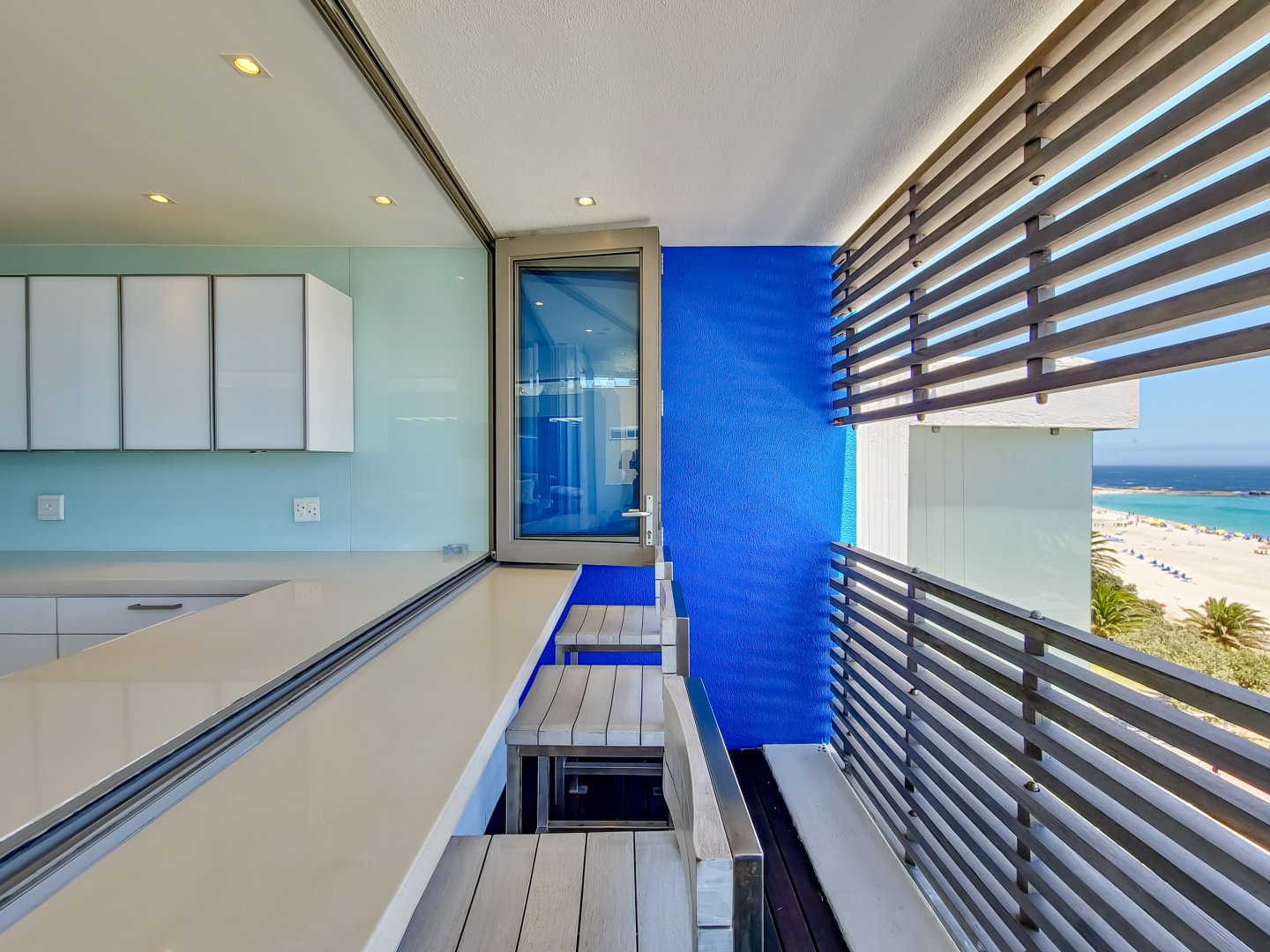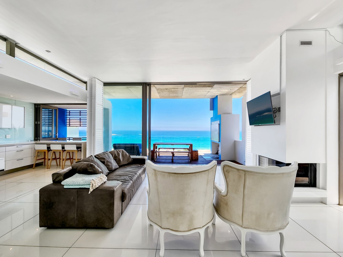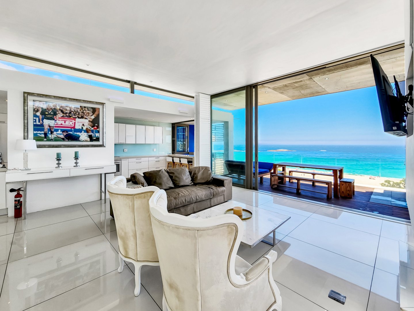Situated directly across from Camps Bay beach and a short walk from the strip, it features a private deck with a sun lounger and barbecue area, providing an expansive view of Camps Bay.
