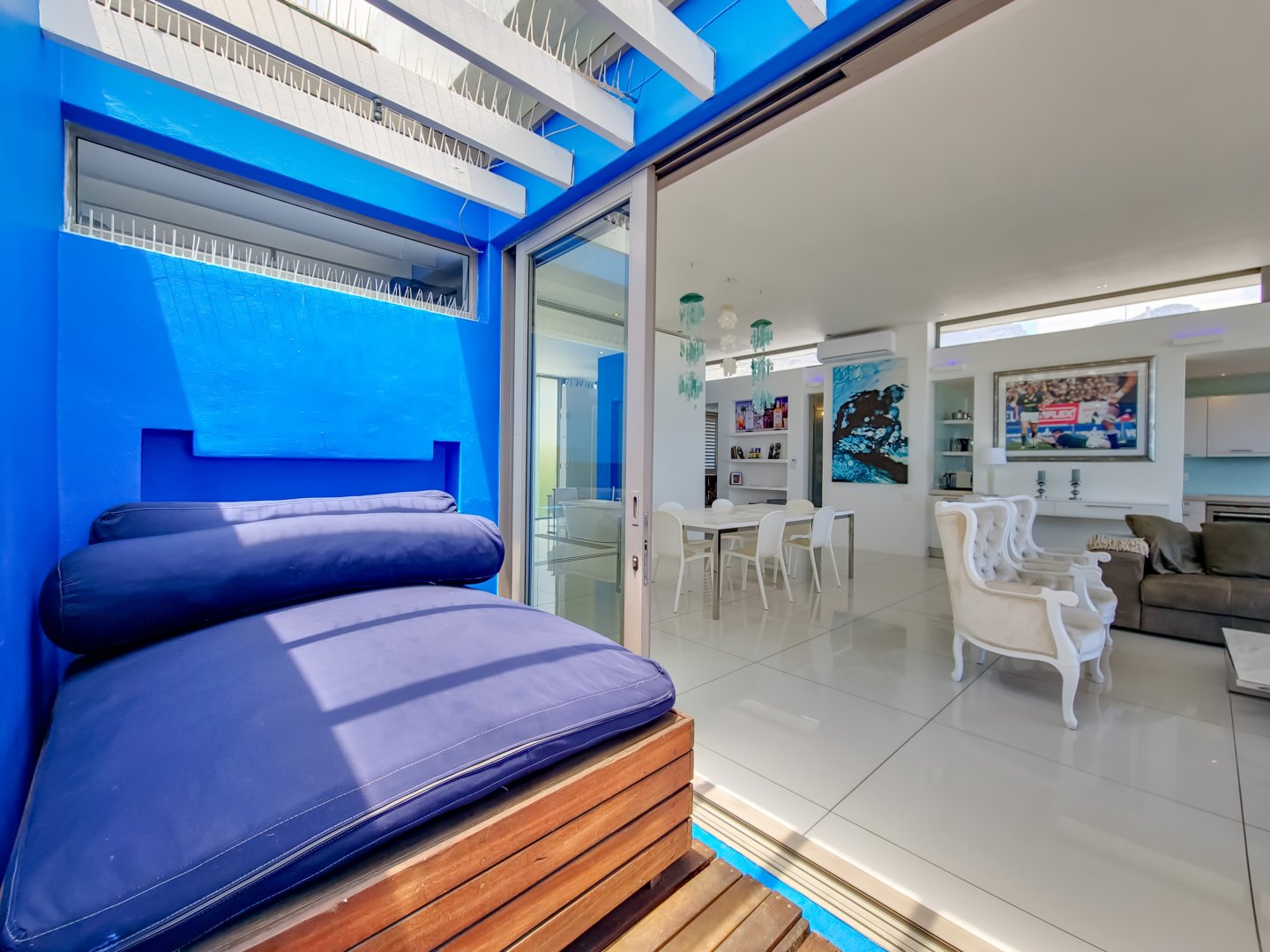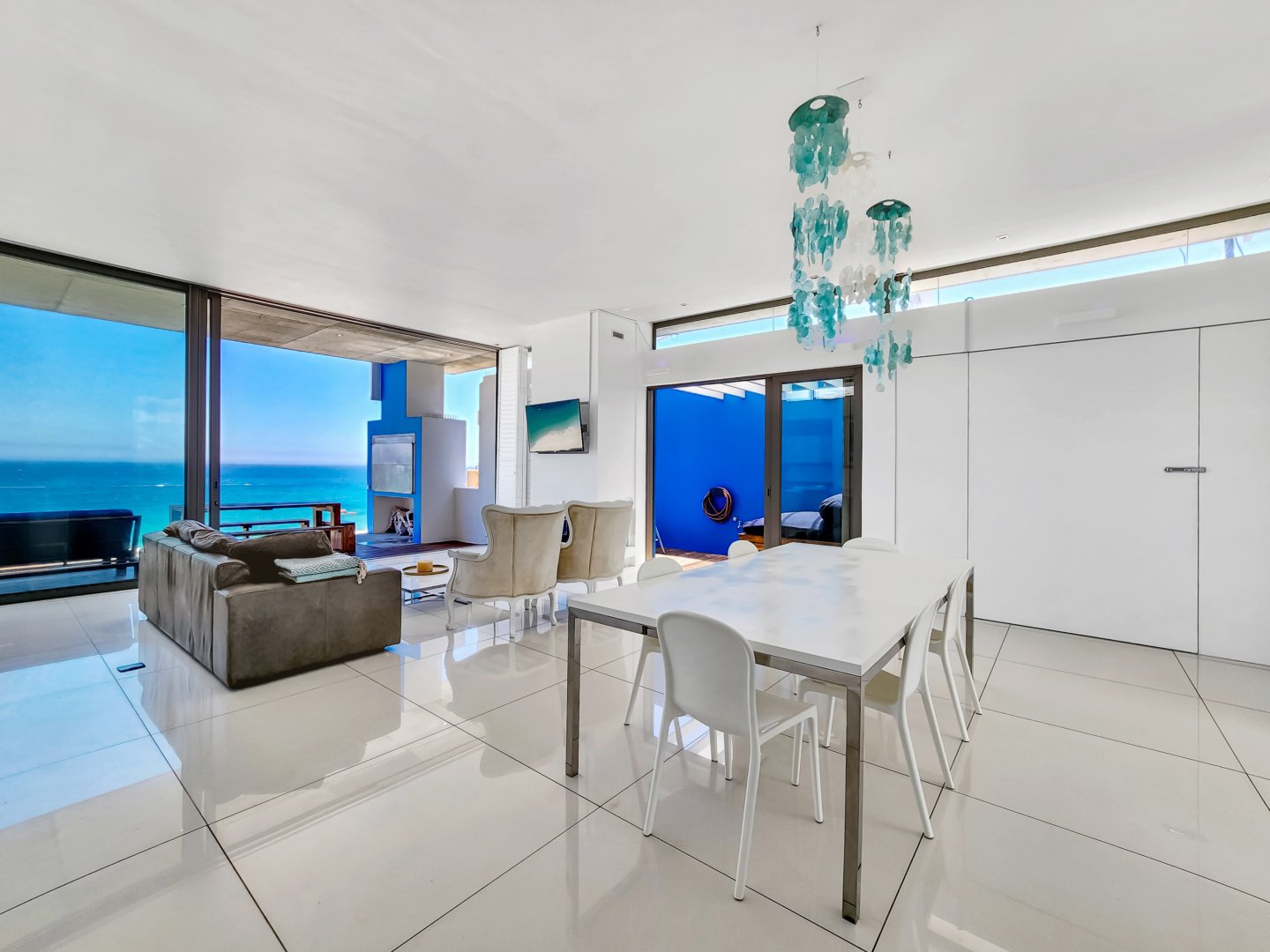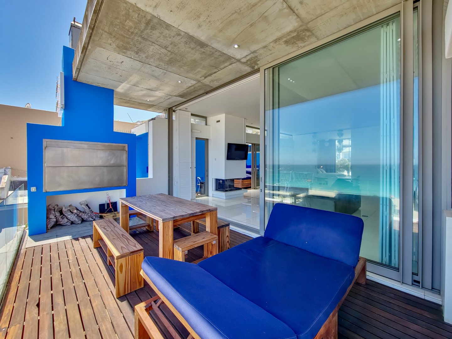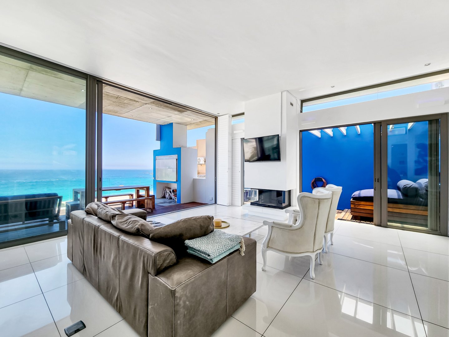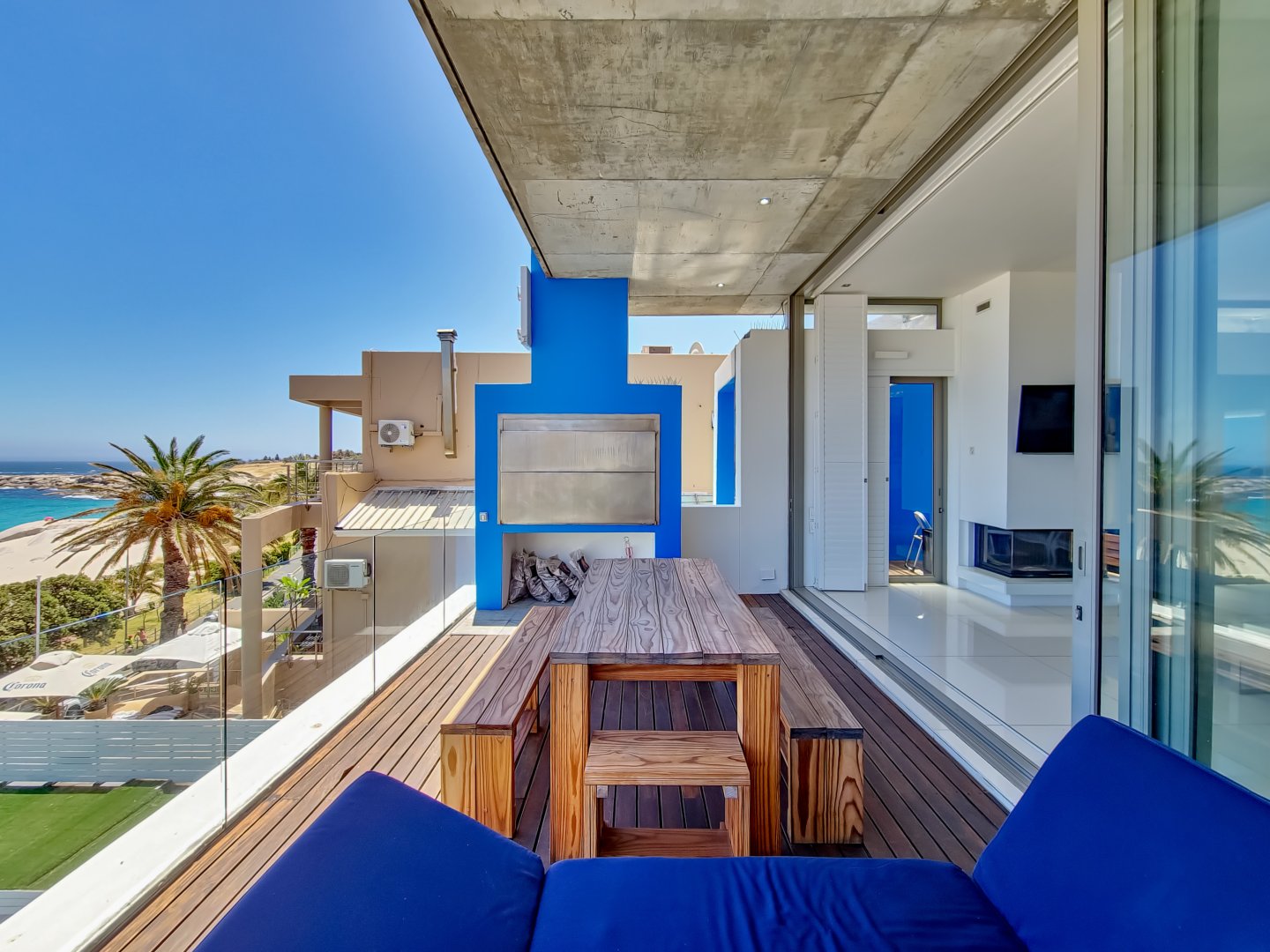Situated directly across from Camps Bay beach and a short walk from the strip, it features a private deck with a sun lounger and barbecue area, providing an expansive view of Camps Bay.