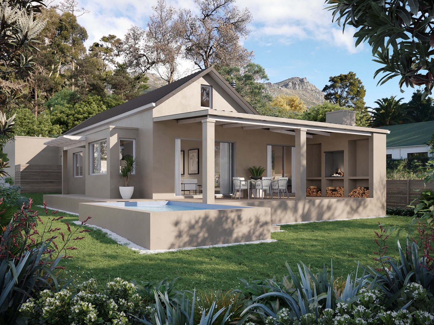 This architecturally designed home will be North facing and nestled amongst magnificent mature trees and fynbos. It features 4 bedrooms, three bathrooms open high-ceiling living spaces in the beautiful new Security estate near Constantia Nek.