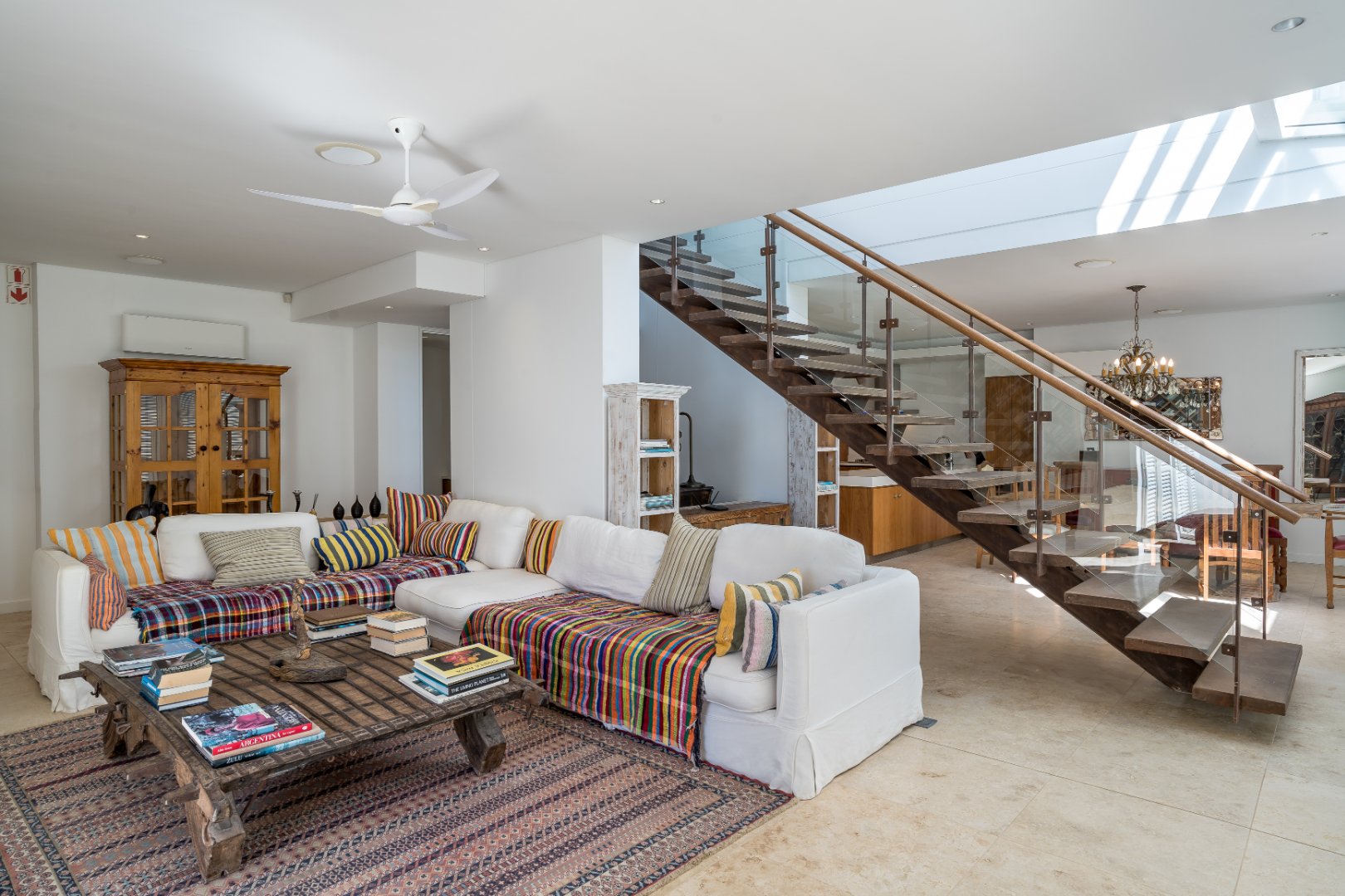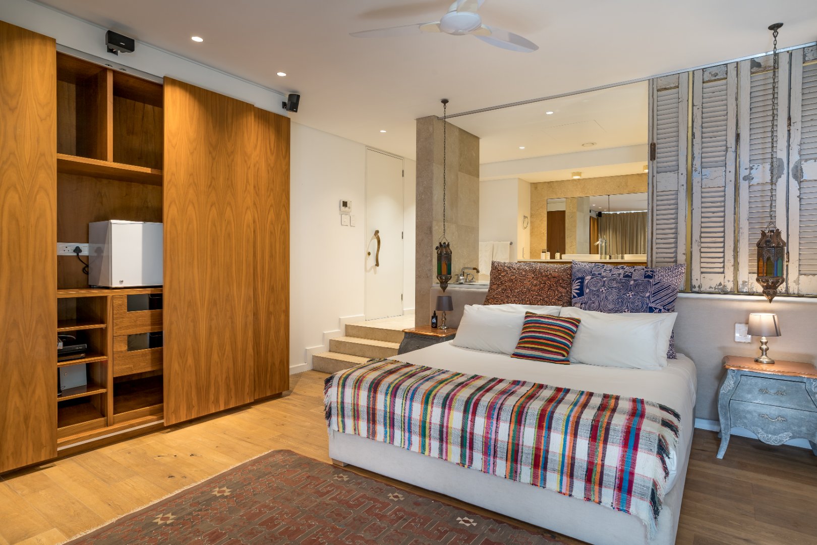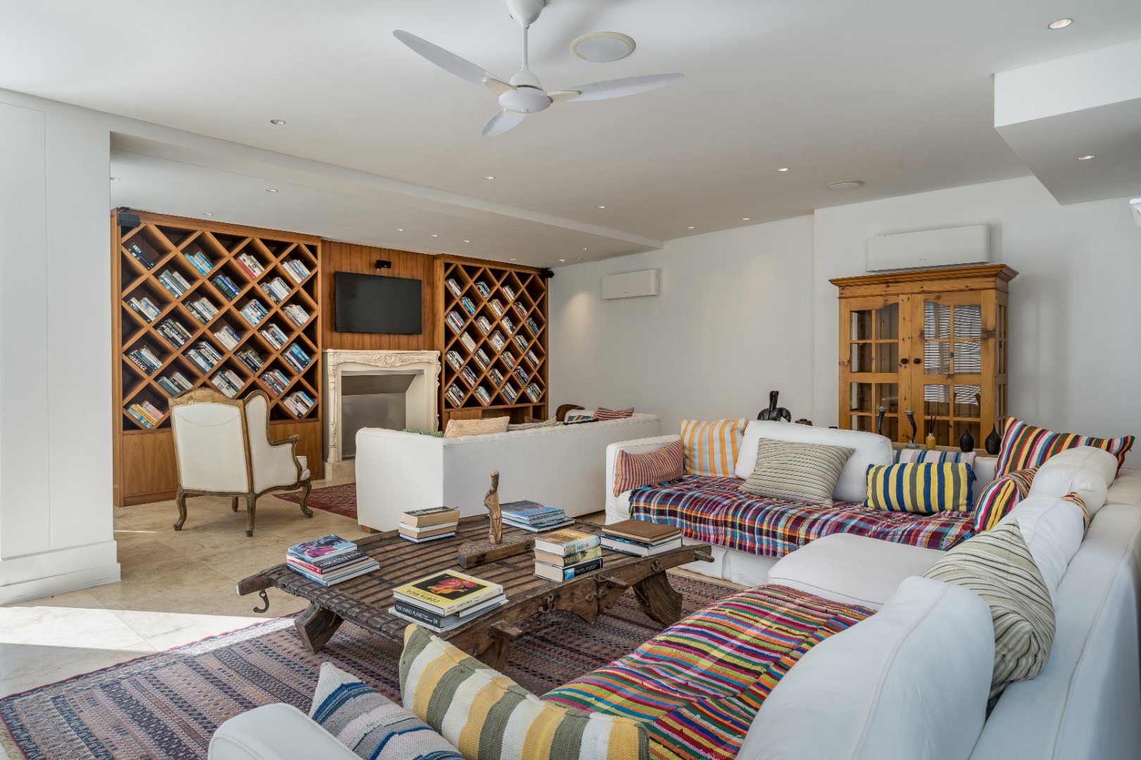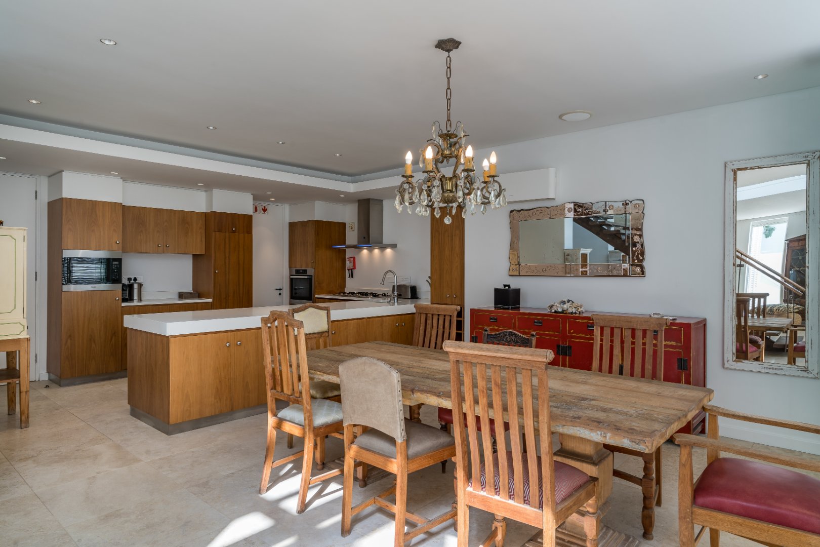 Downstairs there is an open plan lounge/library, dining room, kitchen with small scullery & guest loo, which open up on to a spacious entertainment terrace with private pool.