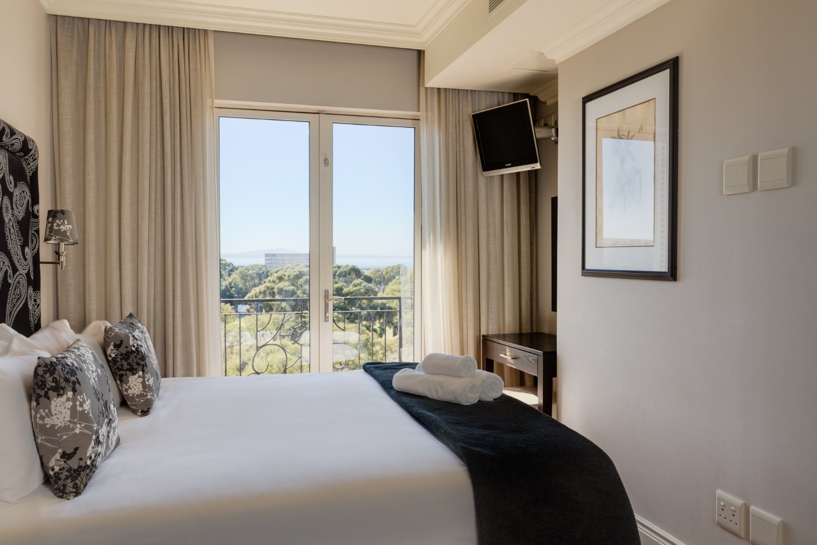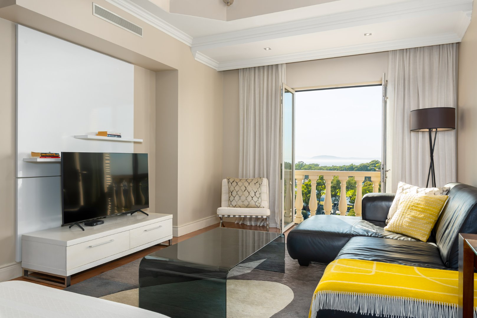 – Plasma TV, sliding doors leading to small balcony with sea views