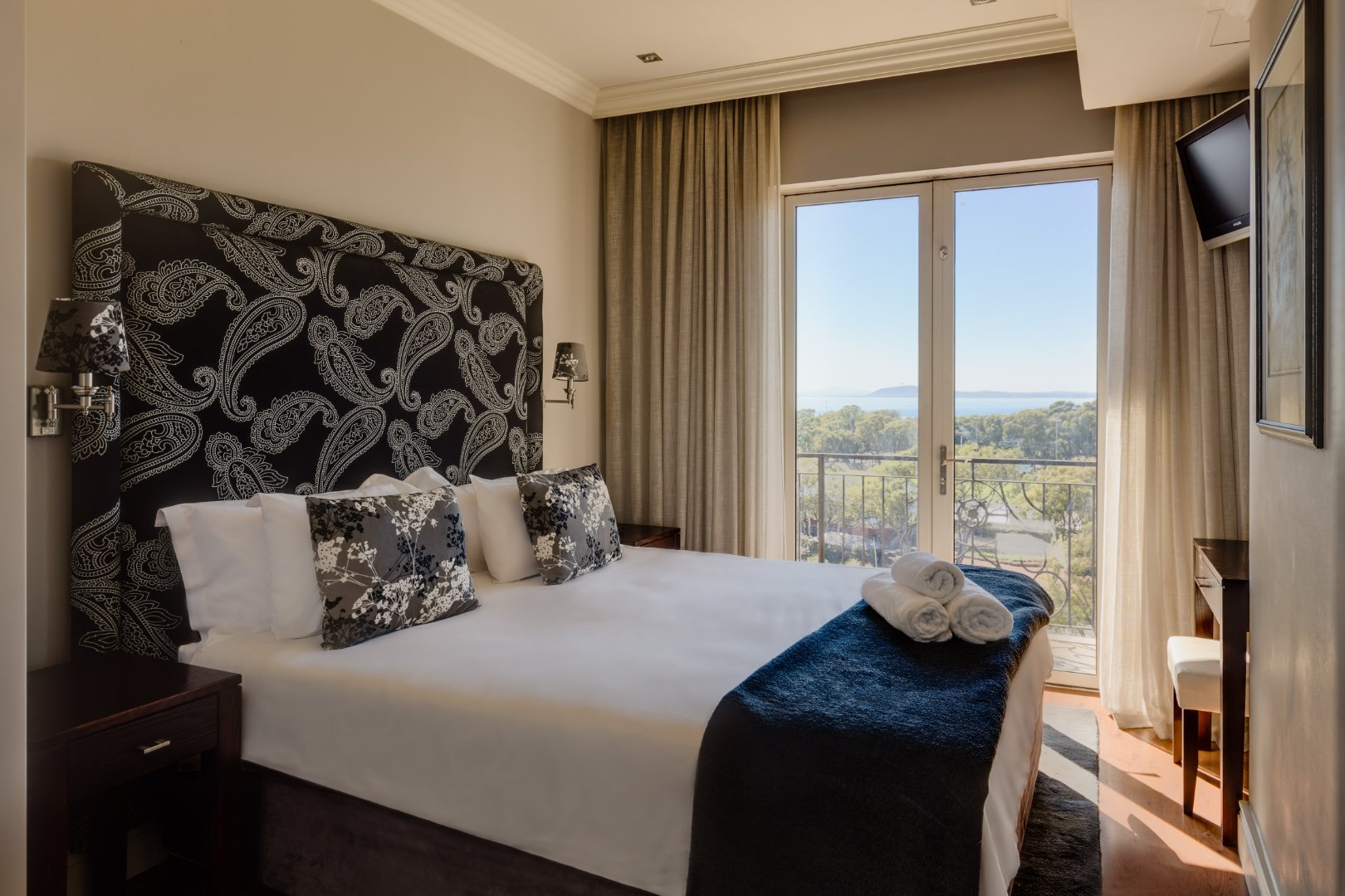 – Kingsize bed, sliding doors leading to small balcony with sea views