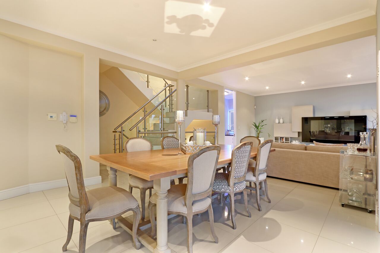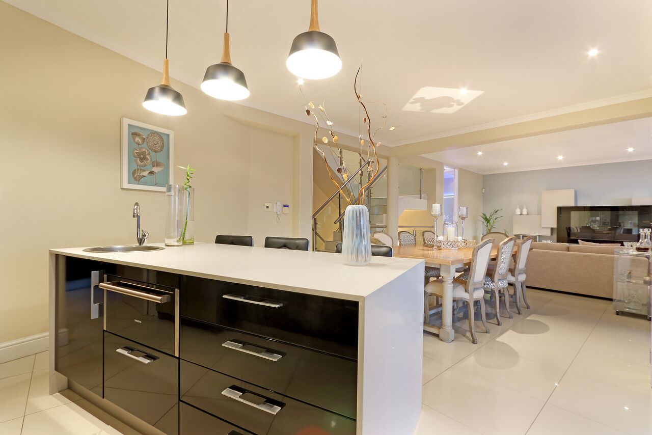 On the middle level, one floor down is the spacious living area with open plan dining room and kitchen. This leads out to a terrace with sparkling pool. The kitchen has been fitted with all the modern conveniences, making use of mainly SMEG appliances, Nespresso Machine, dishwasher etc.