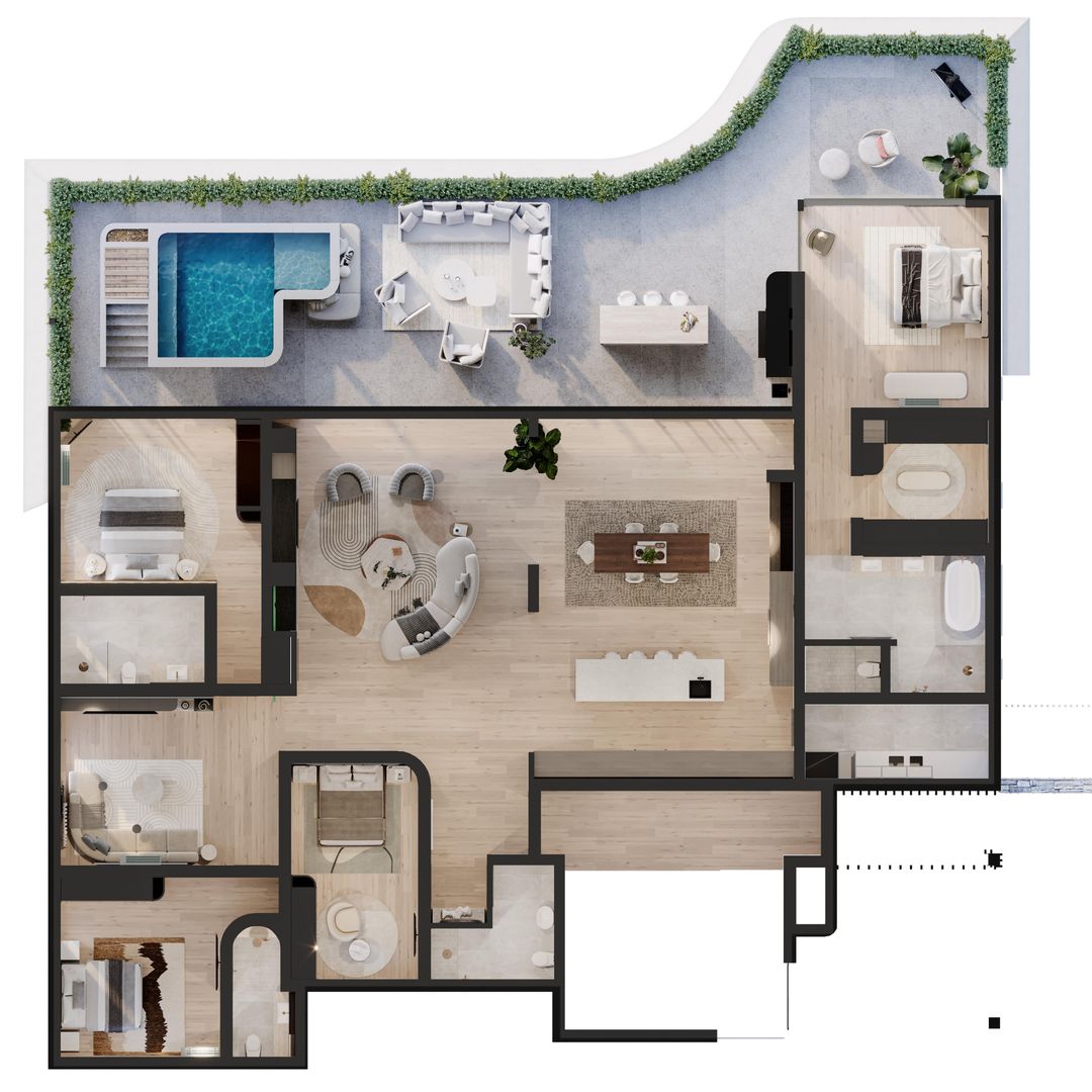 The first-floor residence elevates coastal living with panoramic ocean views and abundant natural light. Featuring four bedrooms, three en-suite, each curated for comfort and sophistication, with the primary suite evoking a spa-like retreat for ultimate relaxation. A generous open-plan living space flows seamlessly onto a private terrace and pool, while the modern, fully appointed kitchen offers a flawless environment for effortless entertaining.