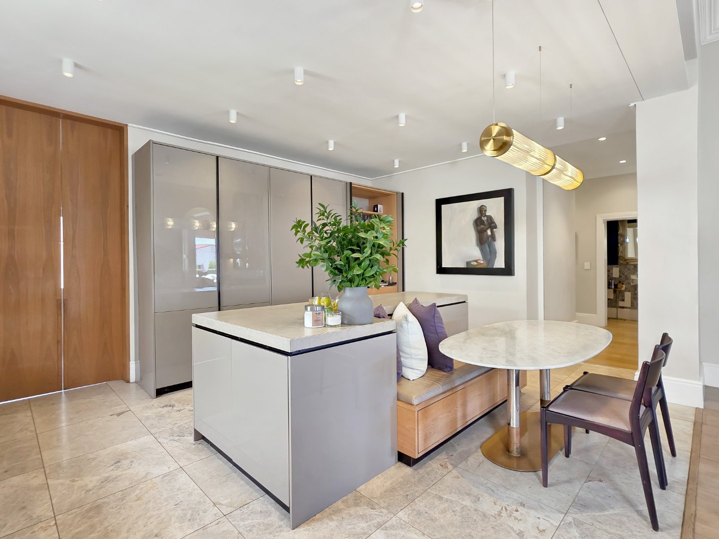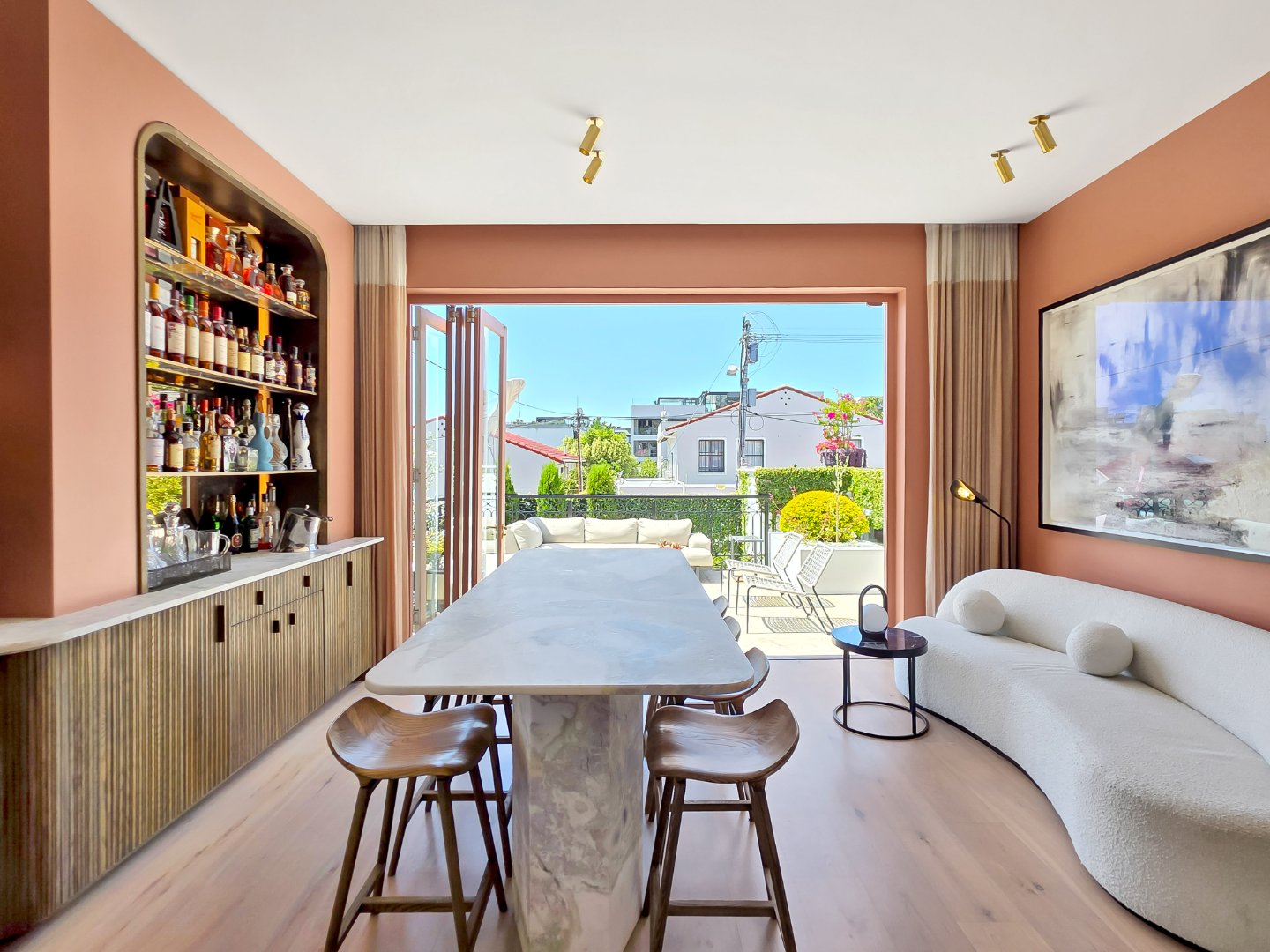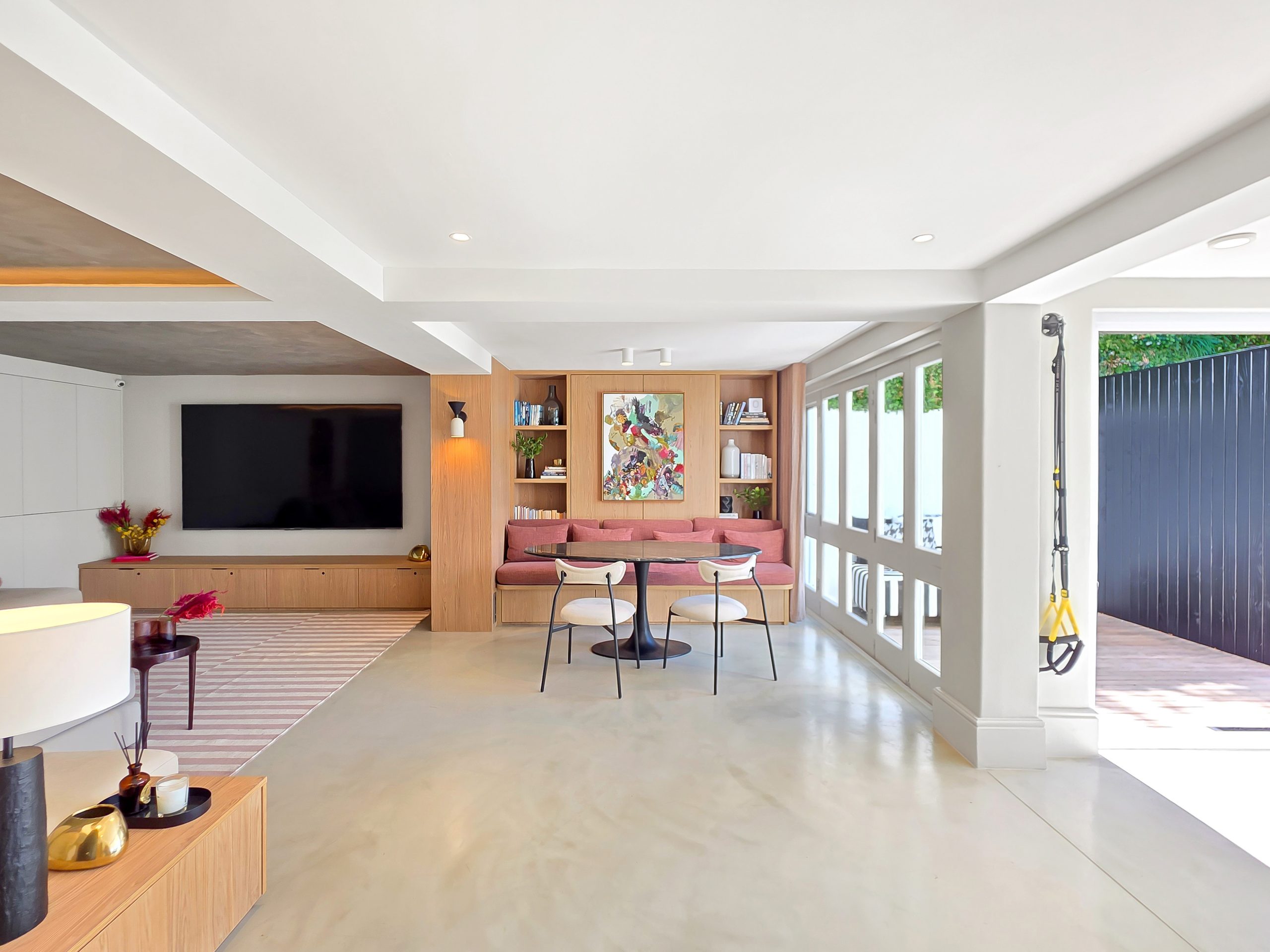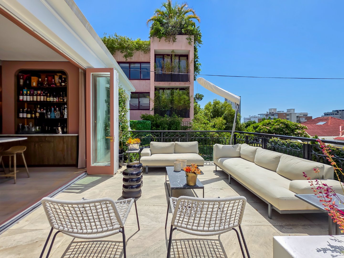 The villa features four spacious en-suite bedrooms, each thoughtfully styled to provide comfort, privacy, and a restful retreat after a day spent exploring the city. Elegant interiors with high ceilings, soft neutral tones, and carefully considered finishes flow seamlessly through the open-plan living and dining areas, which connect directly to covered verandas and outdoor lounges. A stylish entertainment area with a built-in bar enhances the home’s appeal, while a private gym and sauna elevate the experience, allowing guests to maintain wellness routines or unwind in complete privacy.