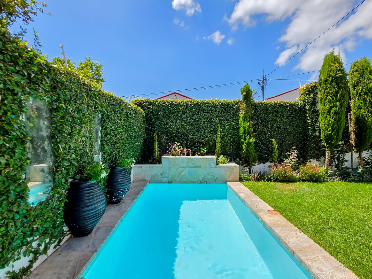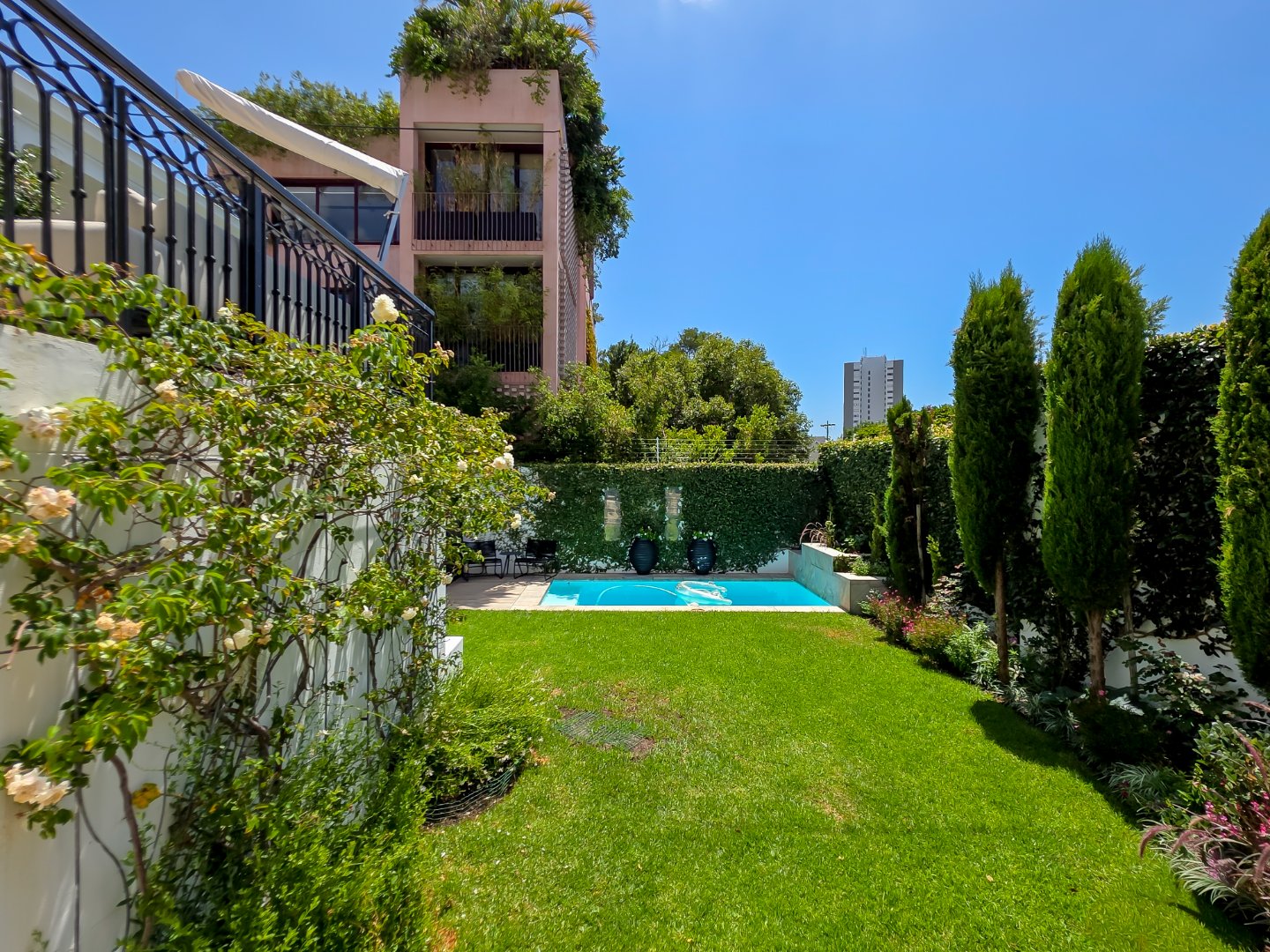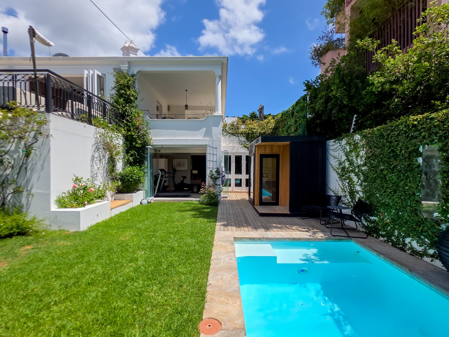 Outdoors, the manicured garden and lawn offer a rare sense of tranquillity, while the sparkling swimming pool is framed by greenery and designed for relaxed days in the sun. Multiple alfresco seating and dining areas invite guests to enjoy morning coffee, leisurely lunches, or quiet moments in the shade, making the most of Cape Town’s renowned climate.