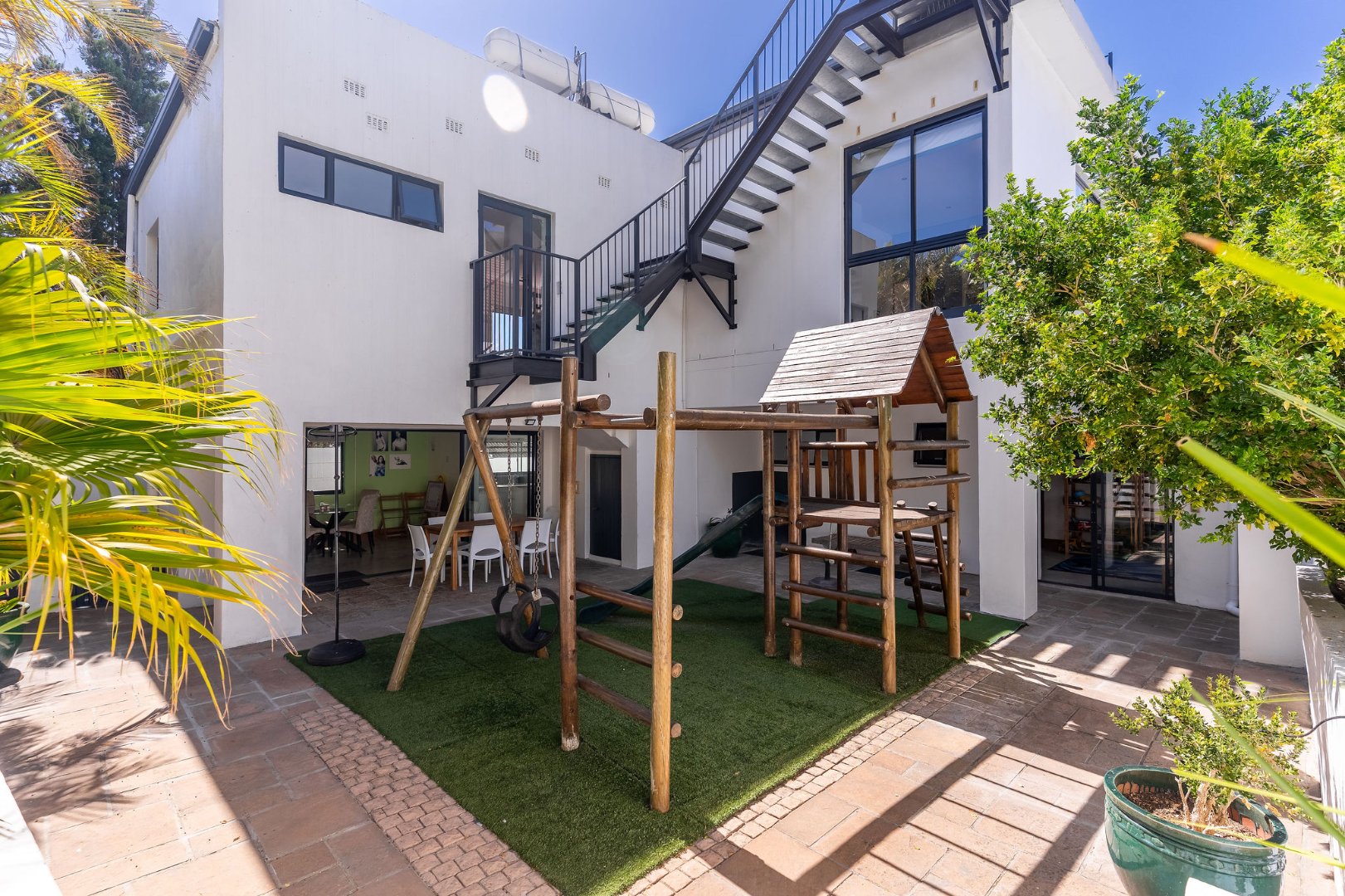 The property features five separate living areas, creating flexibility for both family living and entertaining. The main lounge includes a cosy fireplace, while an upstairs TV lounge provides a relaxed additional living space. A large, well-appointed kitchen with extensive cabinetry and a separate scullery is perfectly suited for everyday family living as well as entertaining. A shaded front entertainment area creates an inviting outdoor space ideal for relaxed dining and gatherings. The low-maintenance splash pool warms efficiently with a solar blanket, while the back garden, complete with a jungle gym and pleasant afternoon shade, provides the perfect area for children to play.