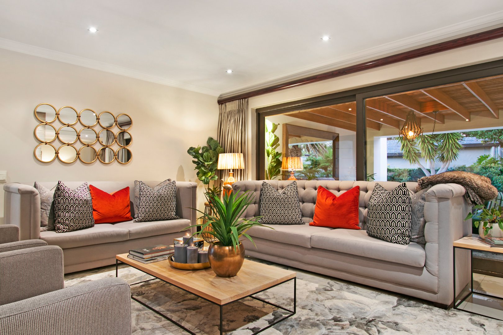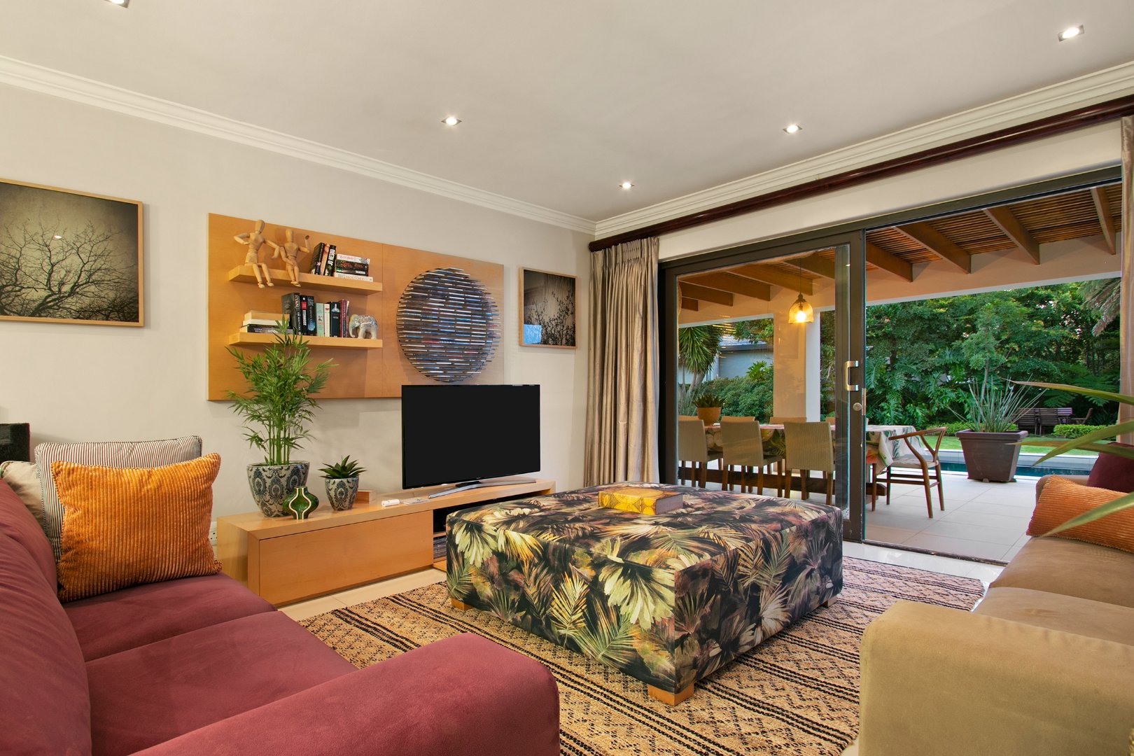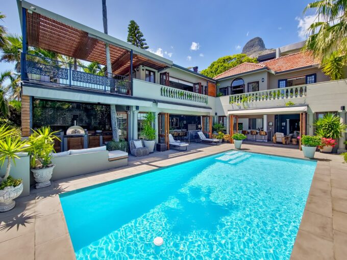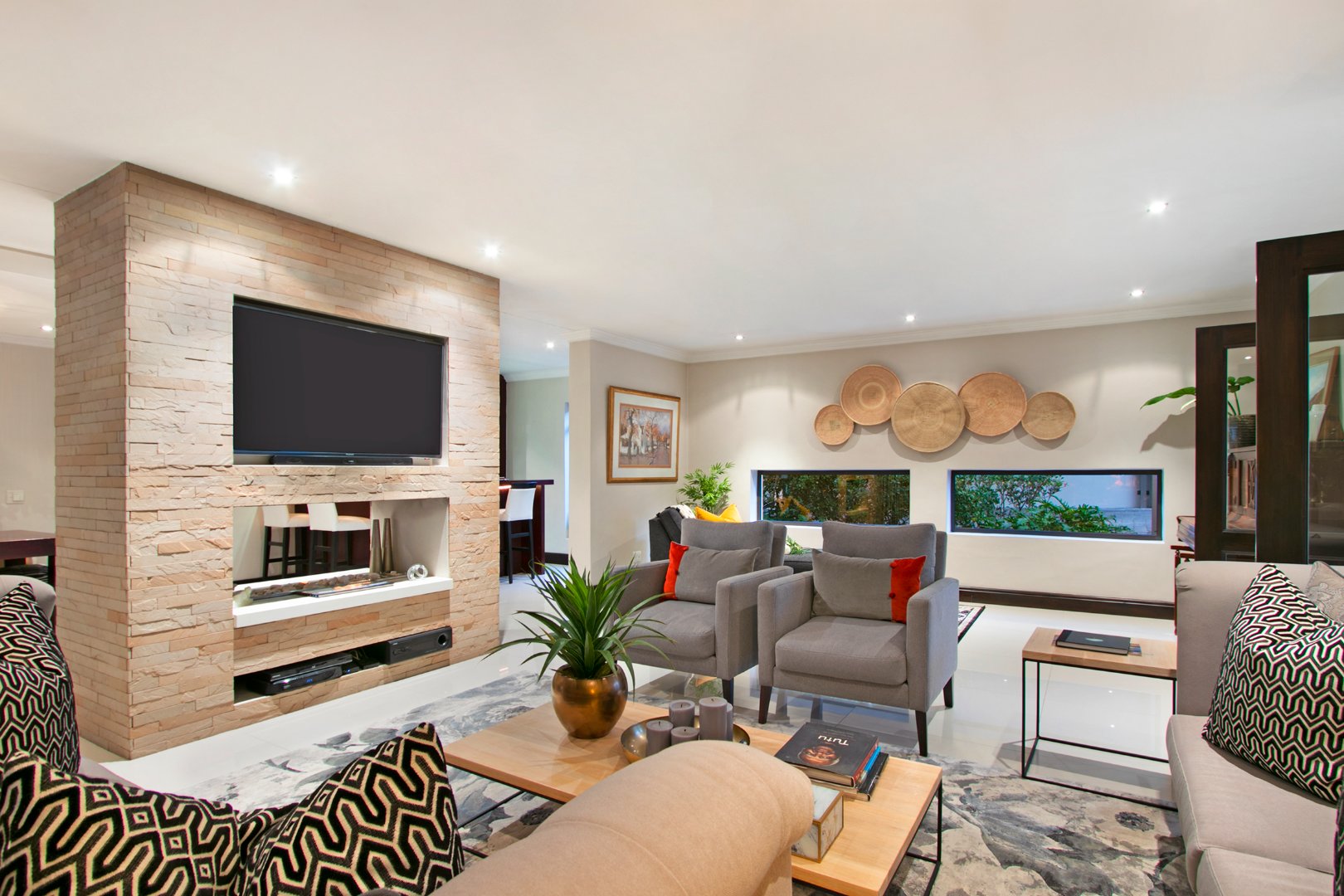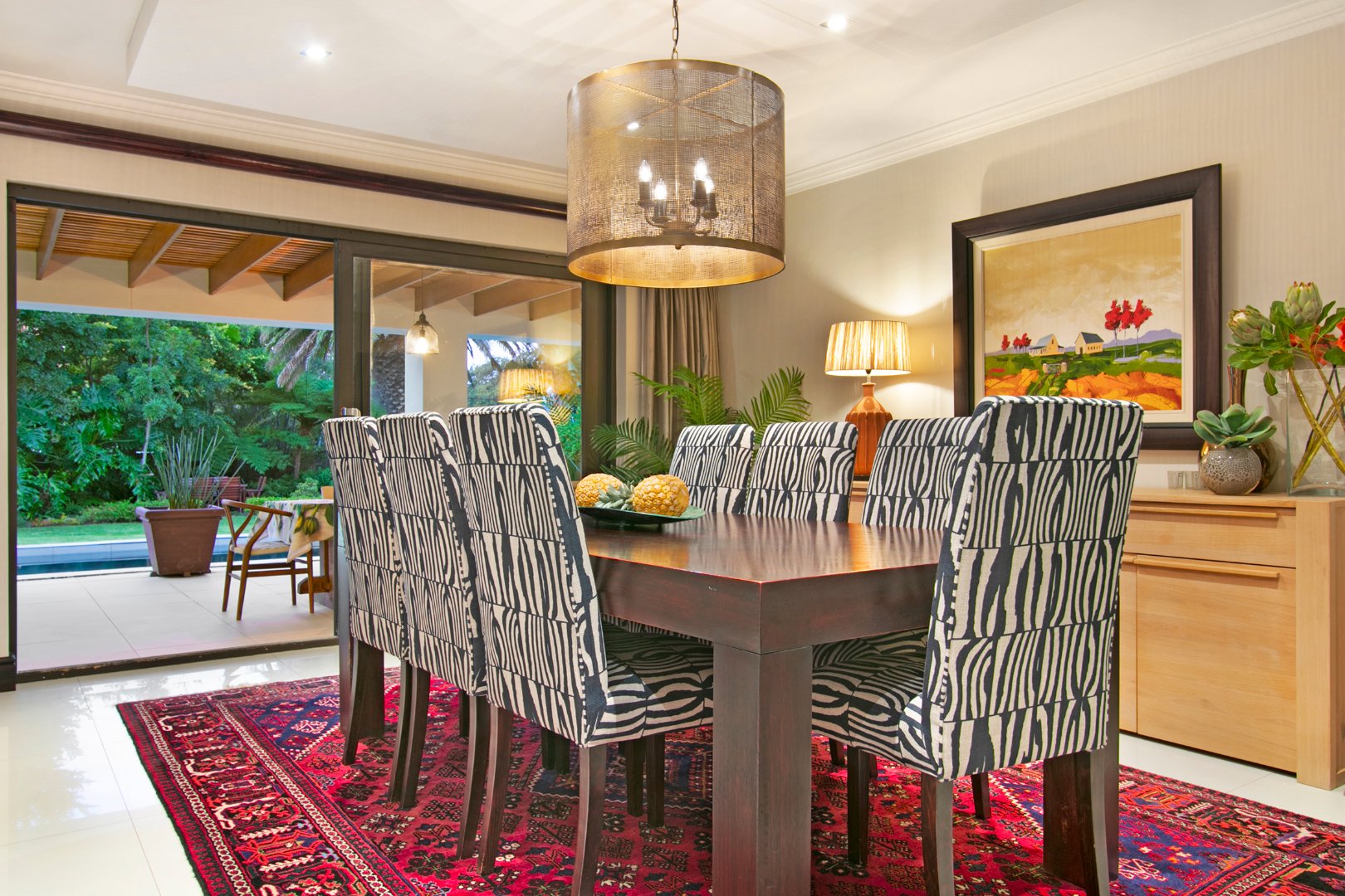 Inside, the villa features multiple lounges, including a cosy TV room near the kitchen and a main lounge with a centrally positioned fireplace shared with the dining area. A bar and piano add character and warmth, making the space ideal for relaxed evenings at home. An office and additional study space provide flexibility for remote work or quiet downtime.