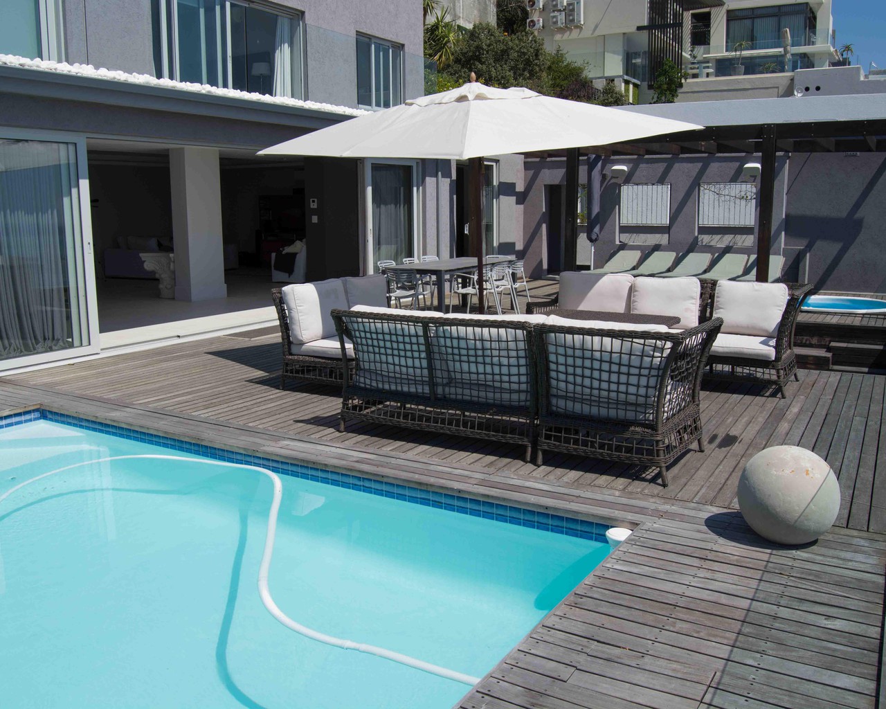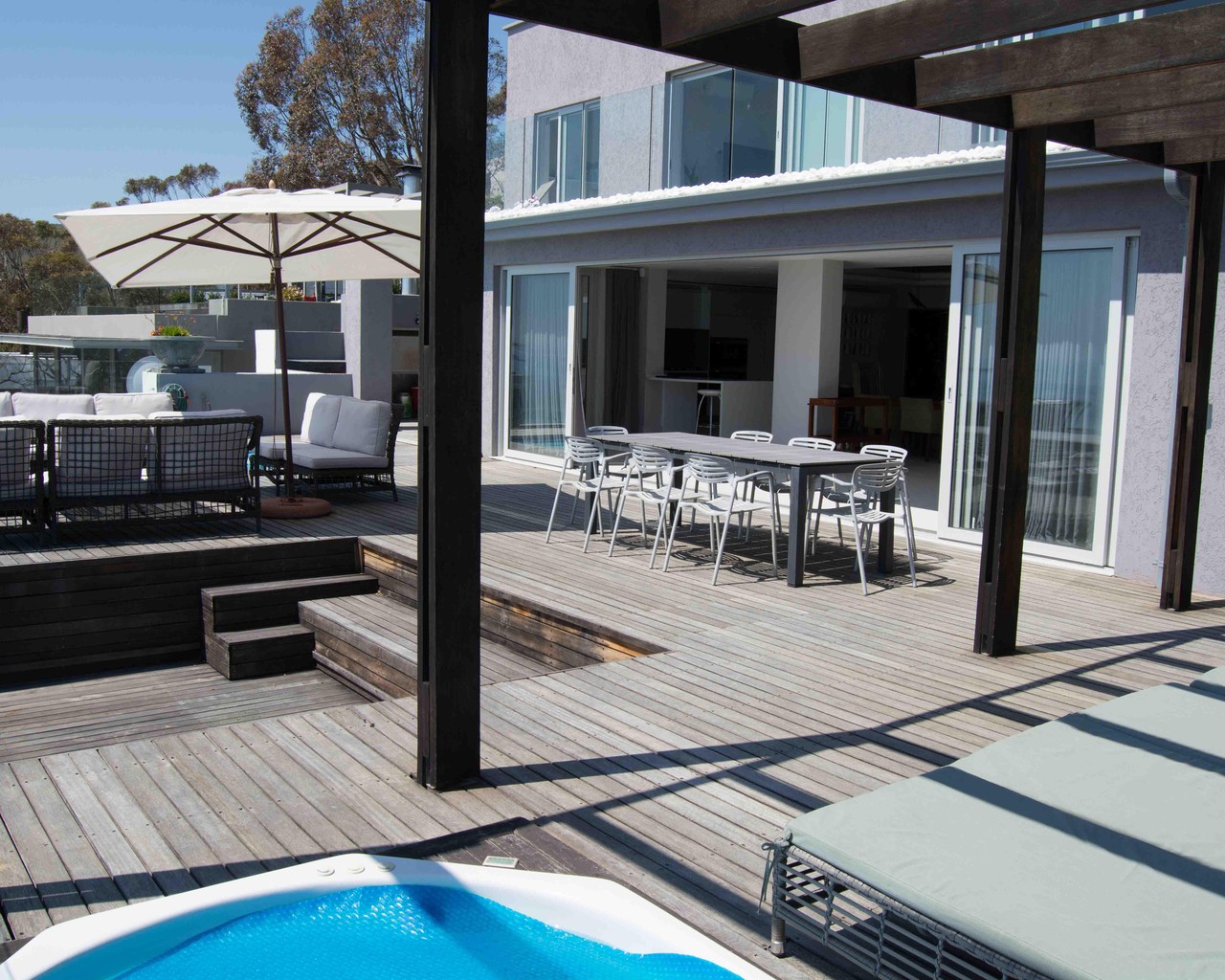 The property has an open plan kitchen, lounge and dining area which flow onto a large outdoor terrace with sunken lounge, pool and jacuzzi, perfect for entertaining family and friends.