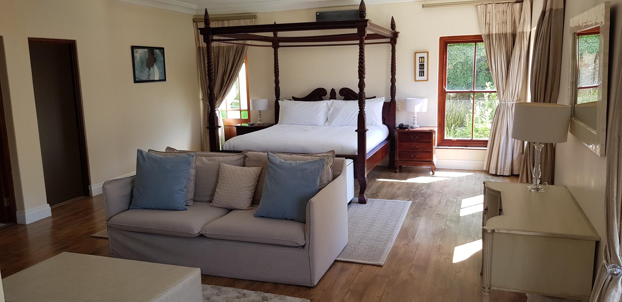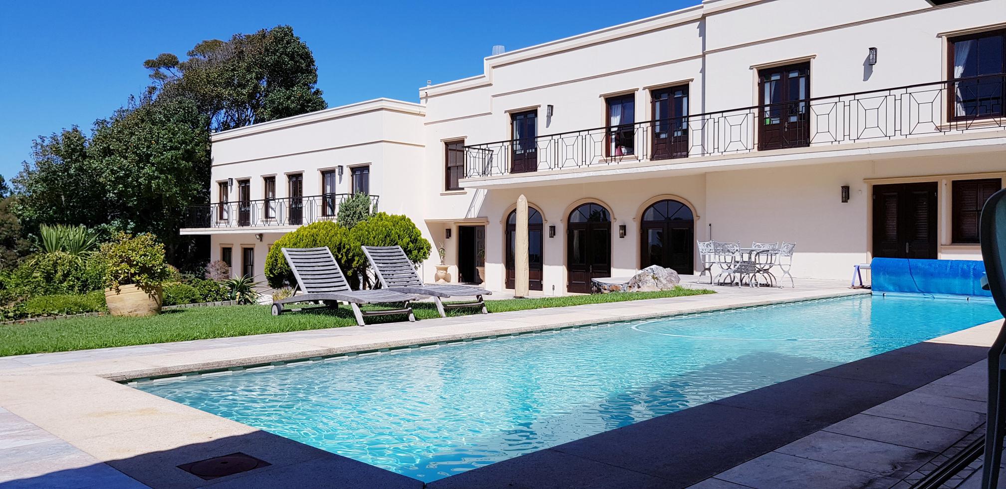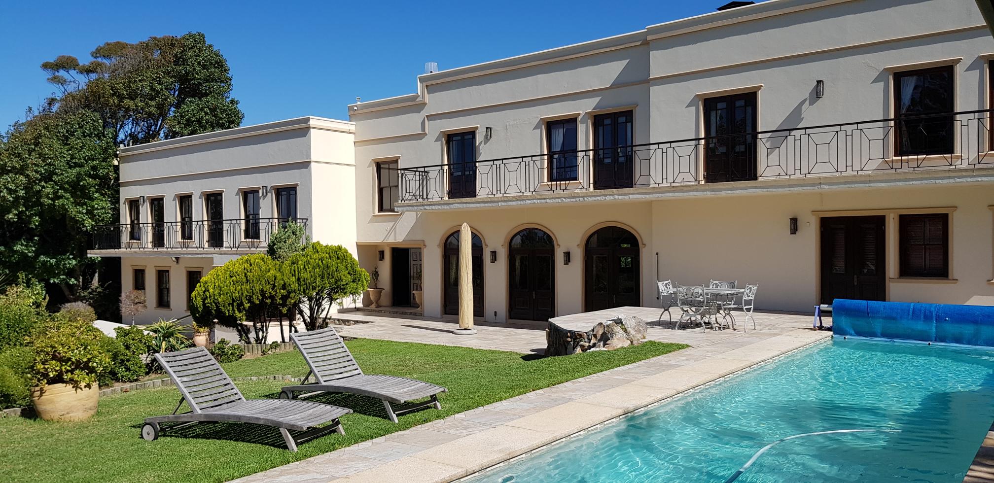 A peaceful and tranquil atmosphere greets you at Lyonesse. This 900 sqm mansion is situated on two acres of pristine indigenous gardens on the slopes of Table Mountain National park in the upmarket leafy suburb of Constantia, one of the oldest wine regions in the Cape. It is close to modern shopping malls and world class restaurants. With easy access to the freeways, allowing visitors access to all the attractions the Cape has to offer.