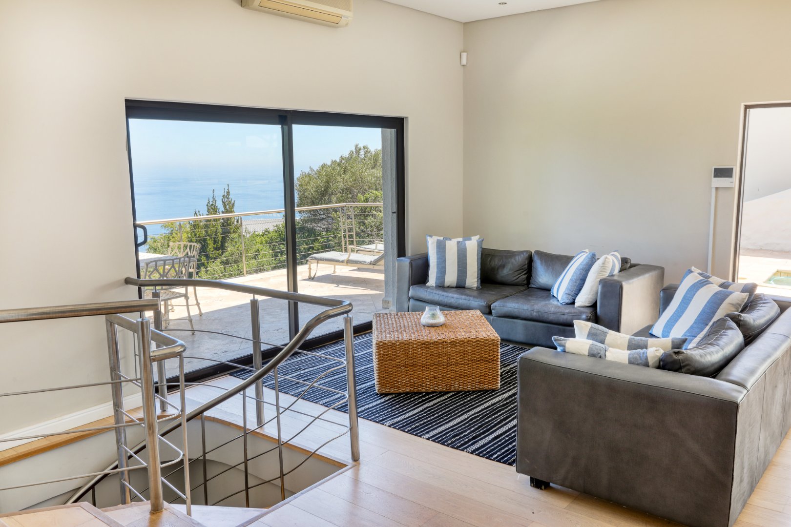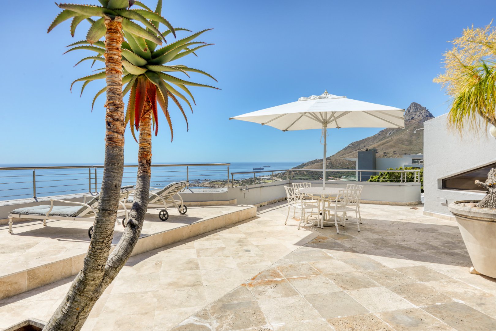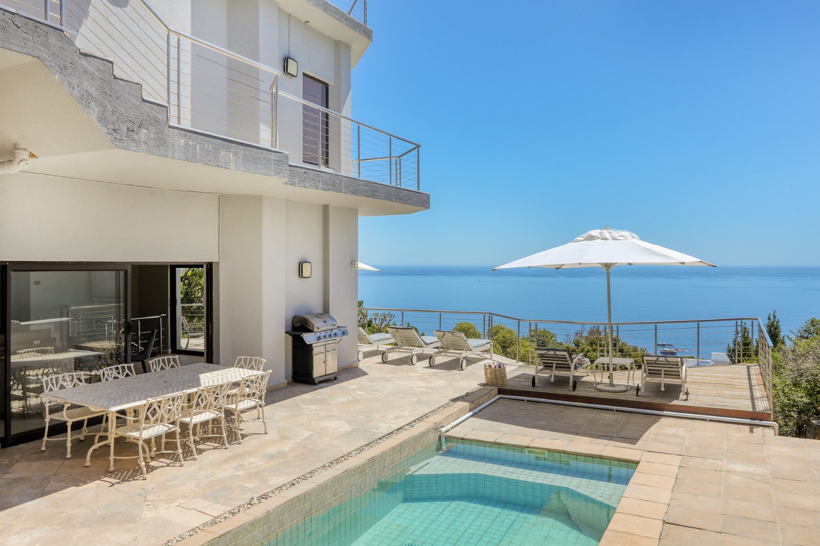 Five en-suite bedrooms with sea views, air-conditioning, satellite TV, and patio access