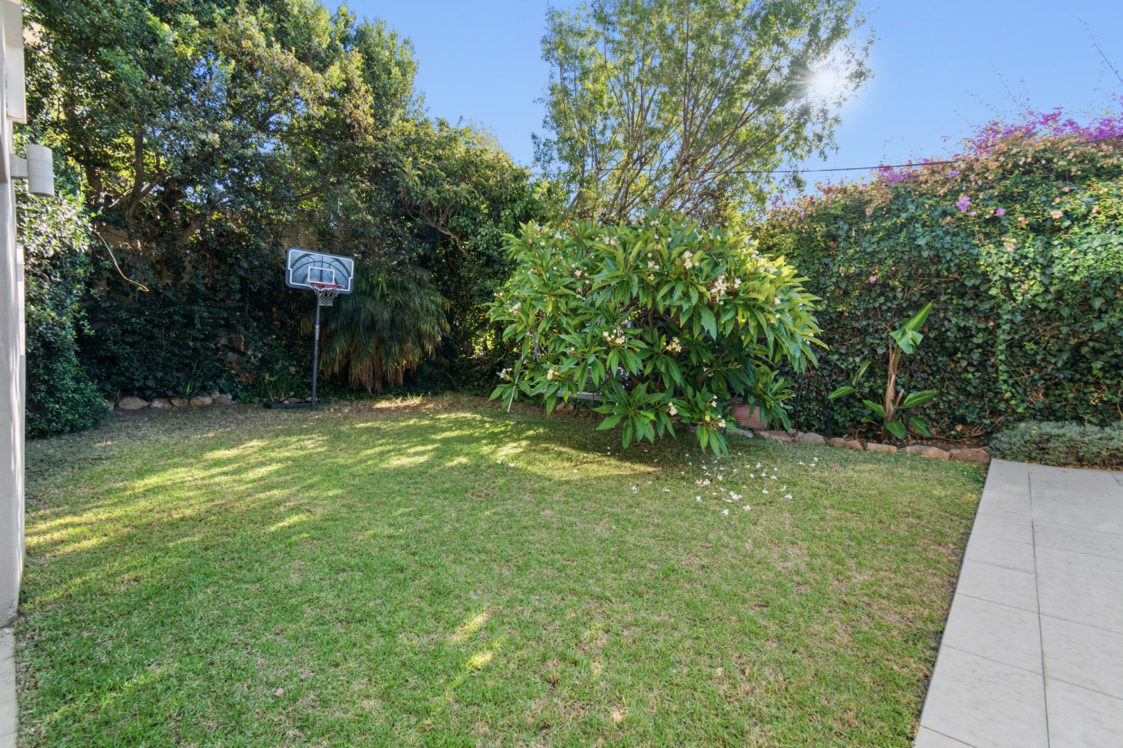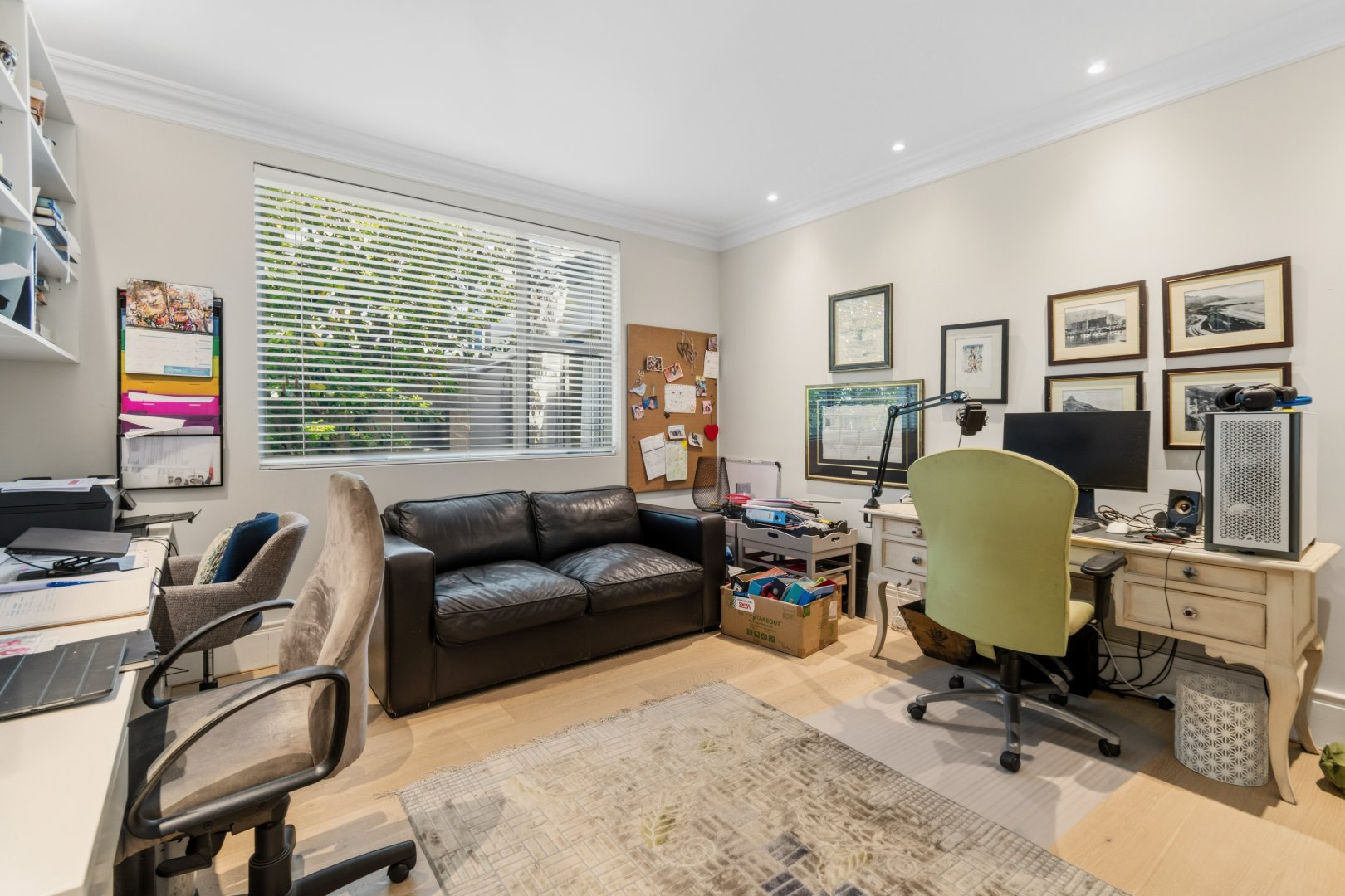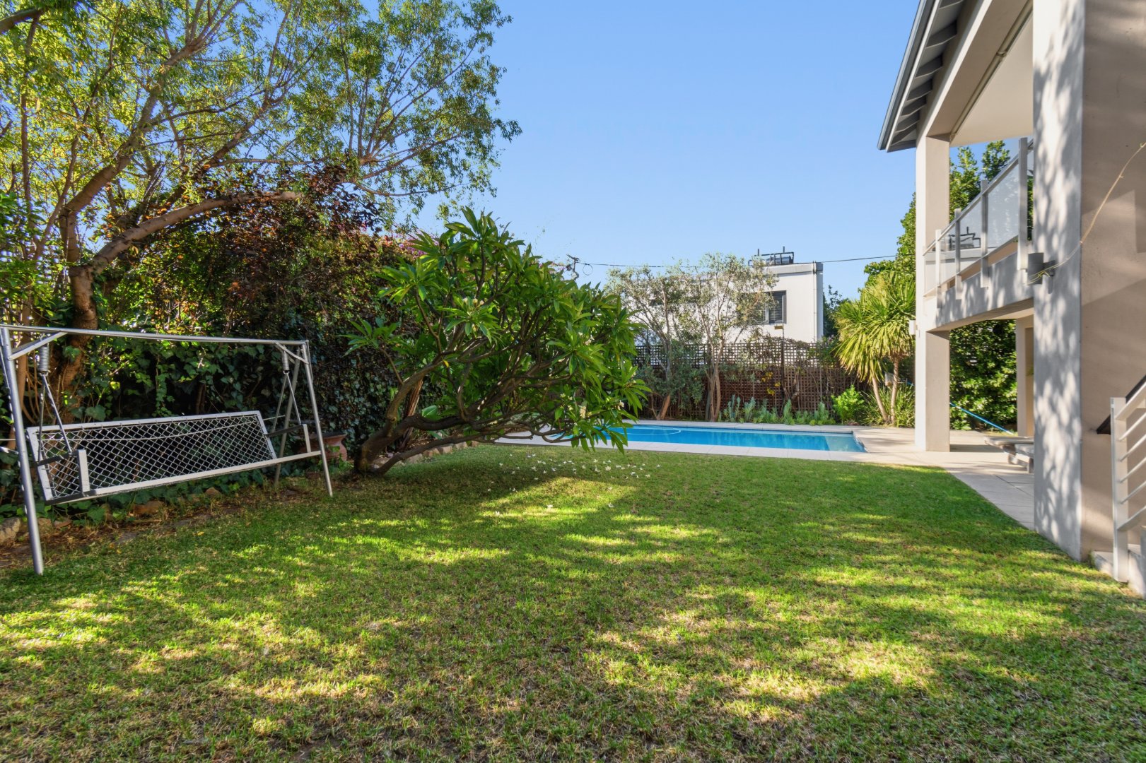 The main living level is designed with entertaining in mind. Expansive open-plan living and dining areas connect effortlessly to a large outdoor terrace, creating an ideal setting for gatherings. From here, the space extends down to a verdant garden and sparkling pool, offering a tranquil retreat. A separate playroom on this level adds versatility, particularly suited to families with younger children.