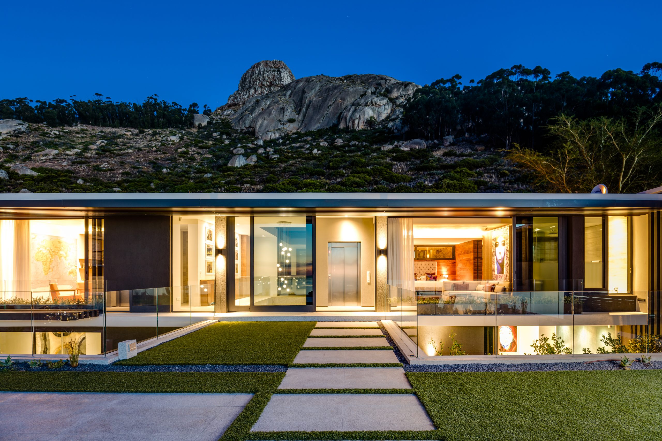 A Greg Wright designed architectural masterpiece that has featured in several magazines, this Villa is one of Cape Town’s exceptional luxury villas. Located in “wind free” Fresnaye, one of Cape Town’s most prestigious neighborhoods, it sits on the very edge of Lion’s Head National Reserve with unparalleled views of the Atlantic Ocean & Robben Island from every single room.