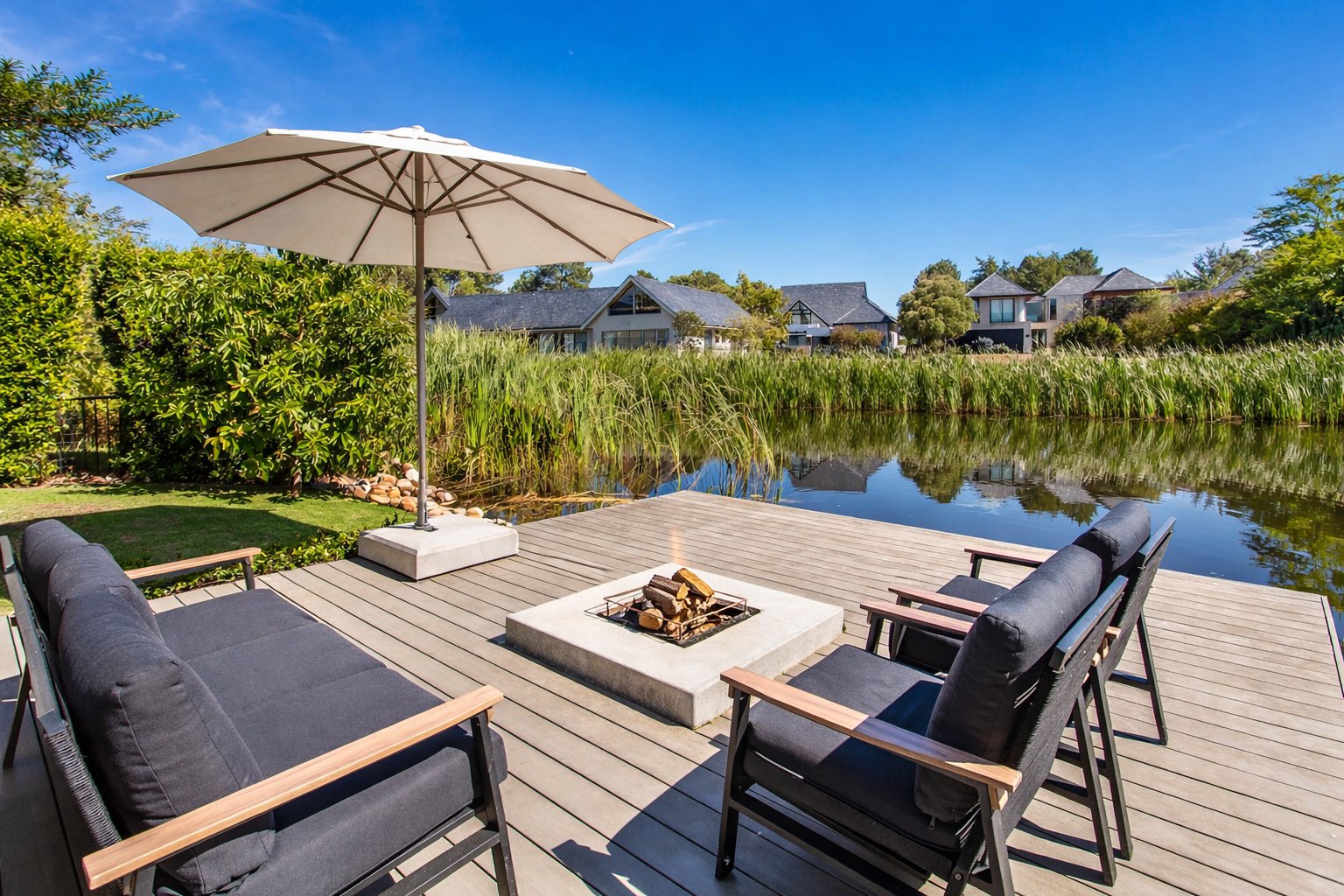 Large sliding glass doors open onto a private patio and beautifully maintained garden, creating effortless indoor-outdoor living — perfect for entertaining guests, enjoying quiet evenings, or simply embracing the tranquil surroundings of the estate.