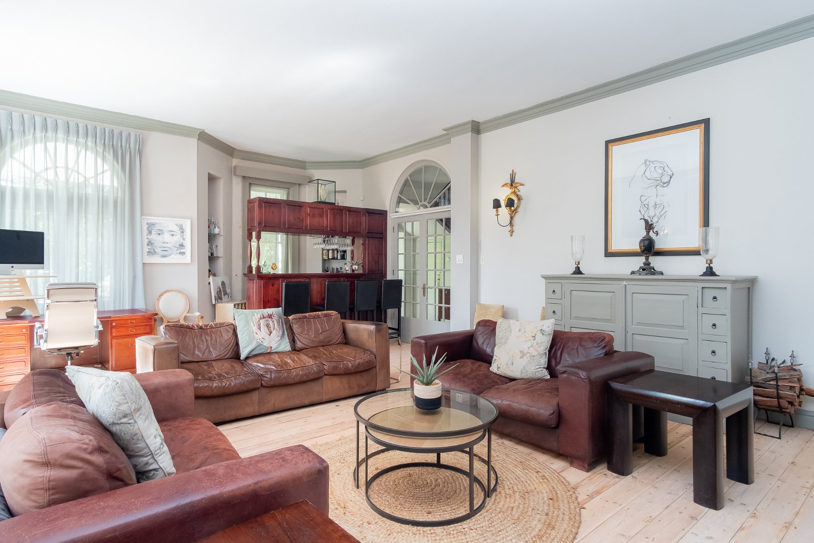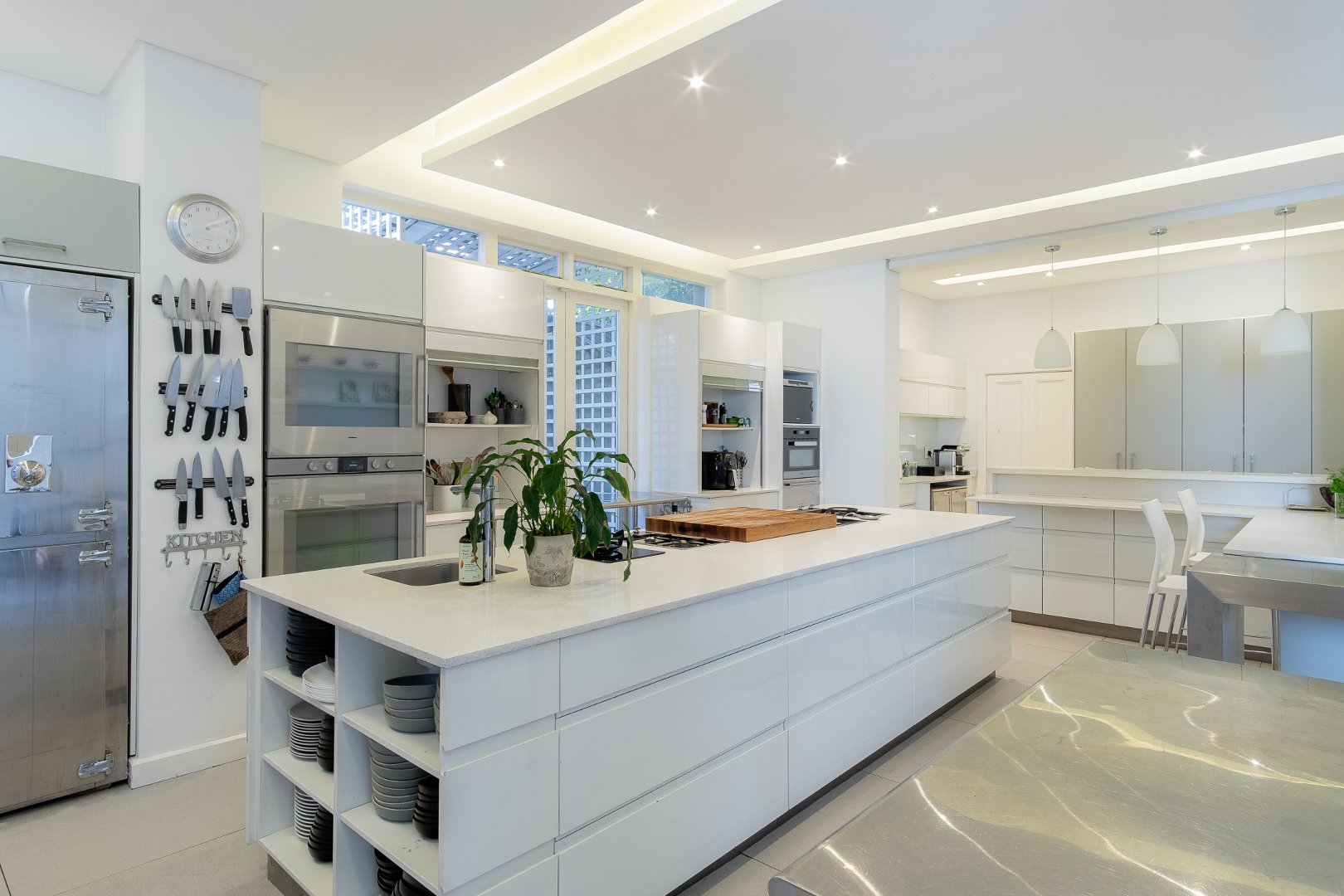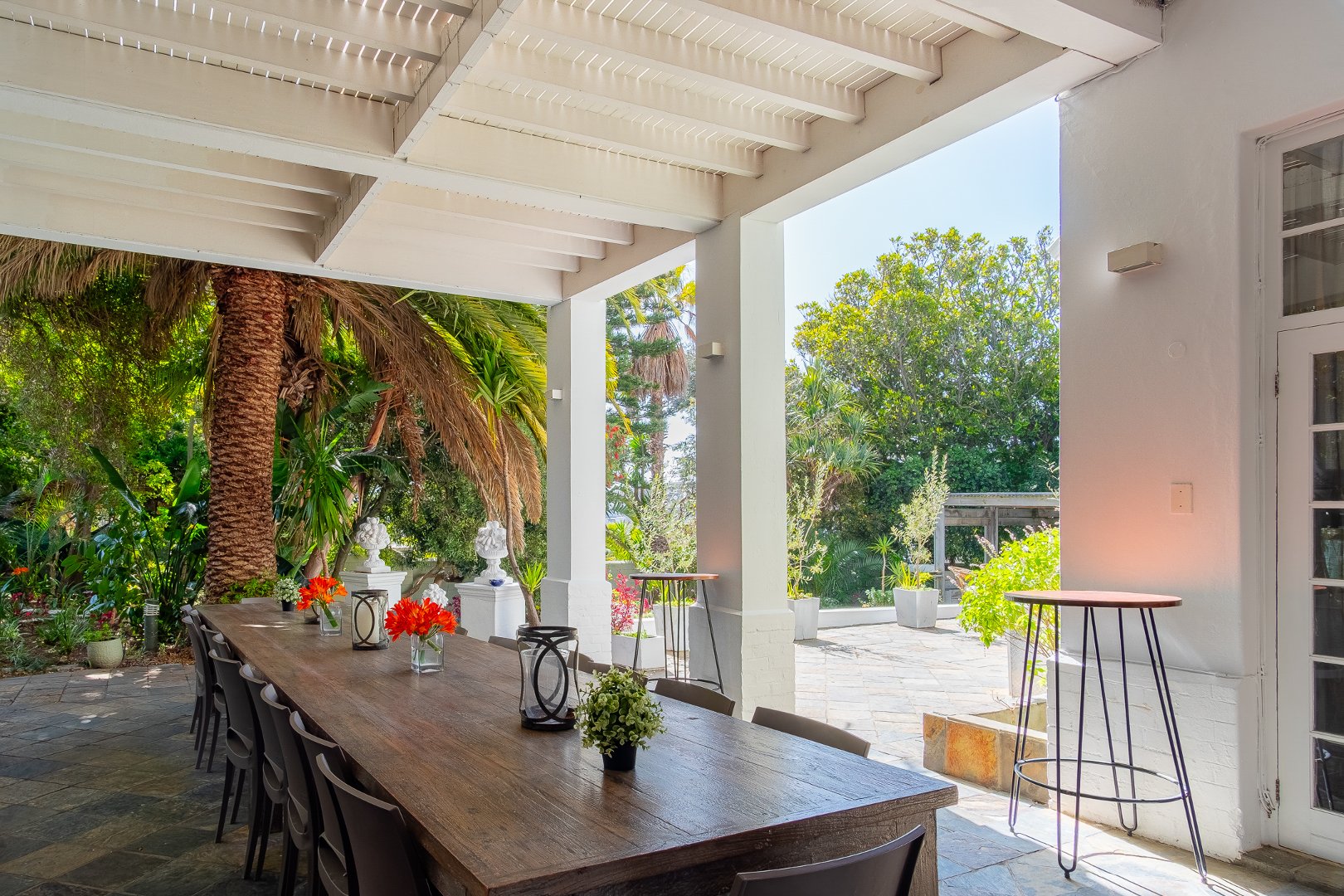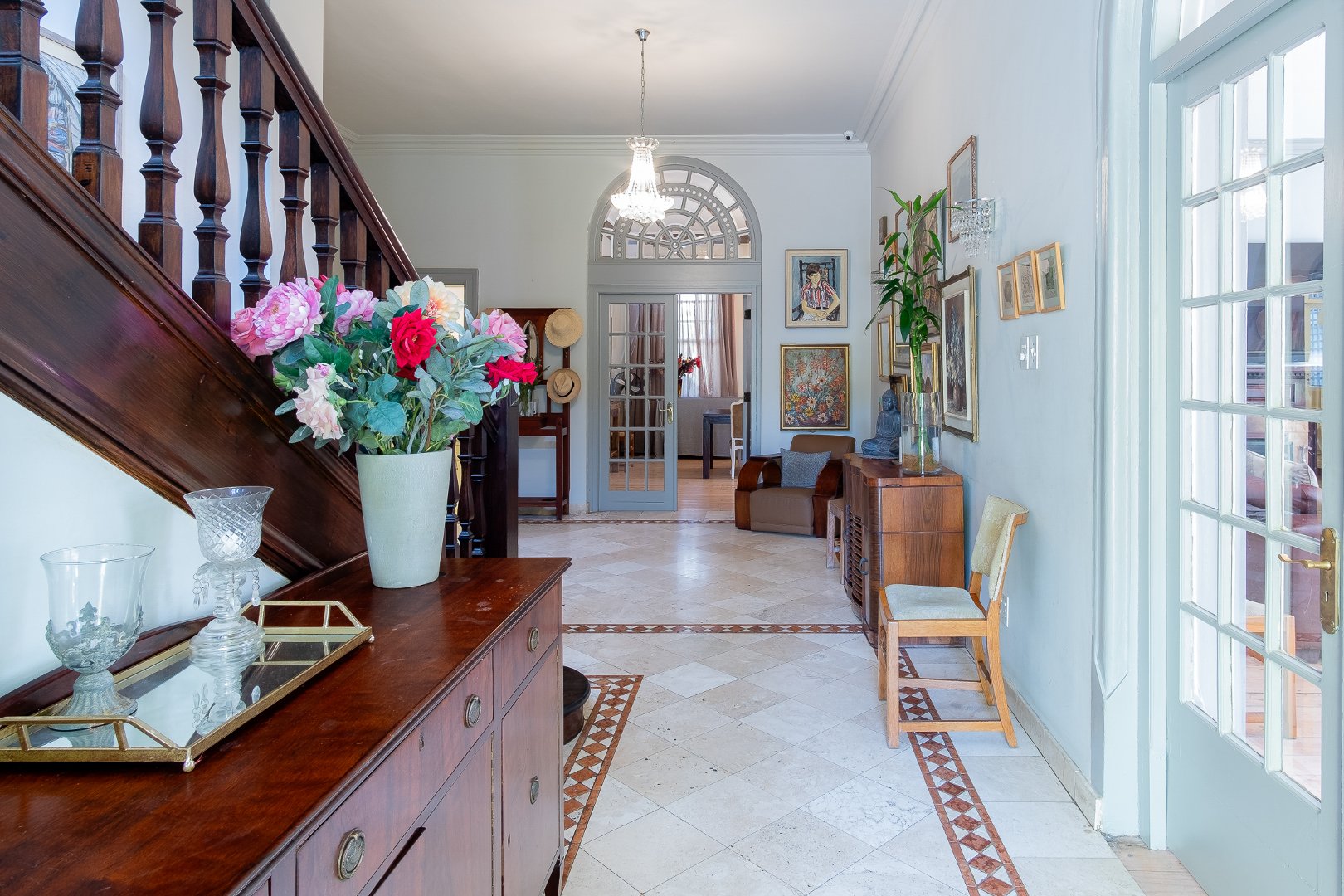 Enter the grand foyer, featuring a lounge area complete with a bar and a classic fireplace, perfect for cozy evenings. Additional highlights include a guest cloakroom and an office. The spacious dining room, adorned with high ceilings, sets the stage for elegant gatherings and cherished memories. It seamlessly extends to a covered entertainment terrace, ideal for alfresco dining, and an adjacent sunlit patio with captivating garden and pool vistas. The substantial chef’s kitchen is a culinary haven, where family and friends can come together to cook, dine, and create memorable feasts. Separate laundry and scullery areas lead to an exterior space with a restroom.