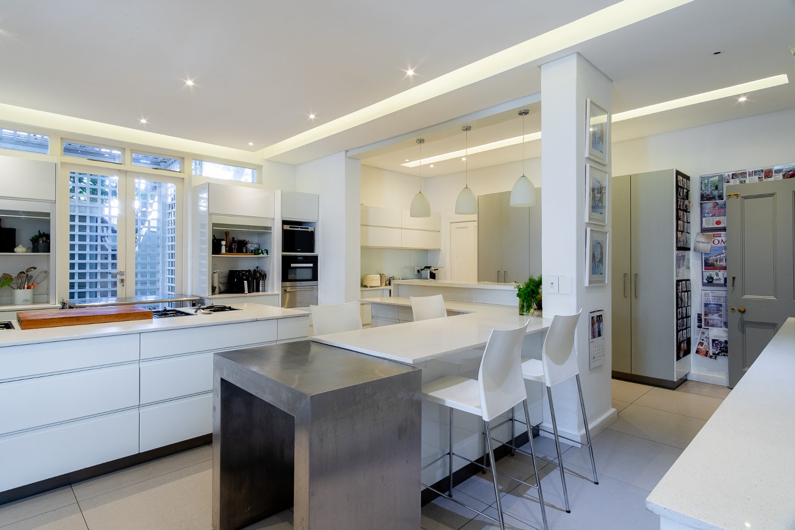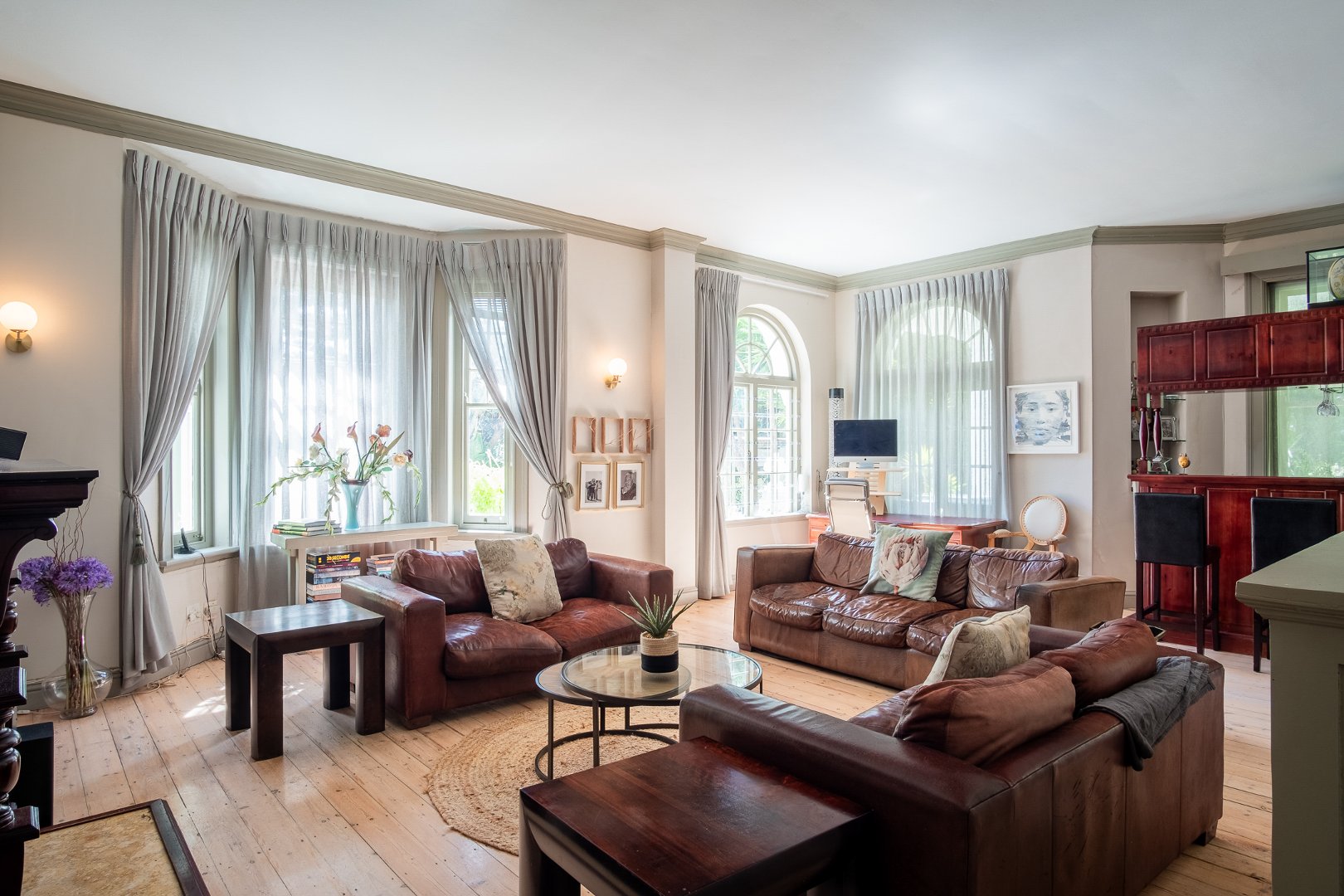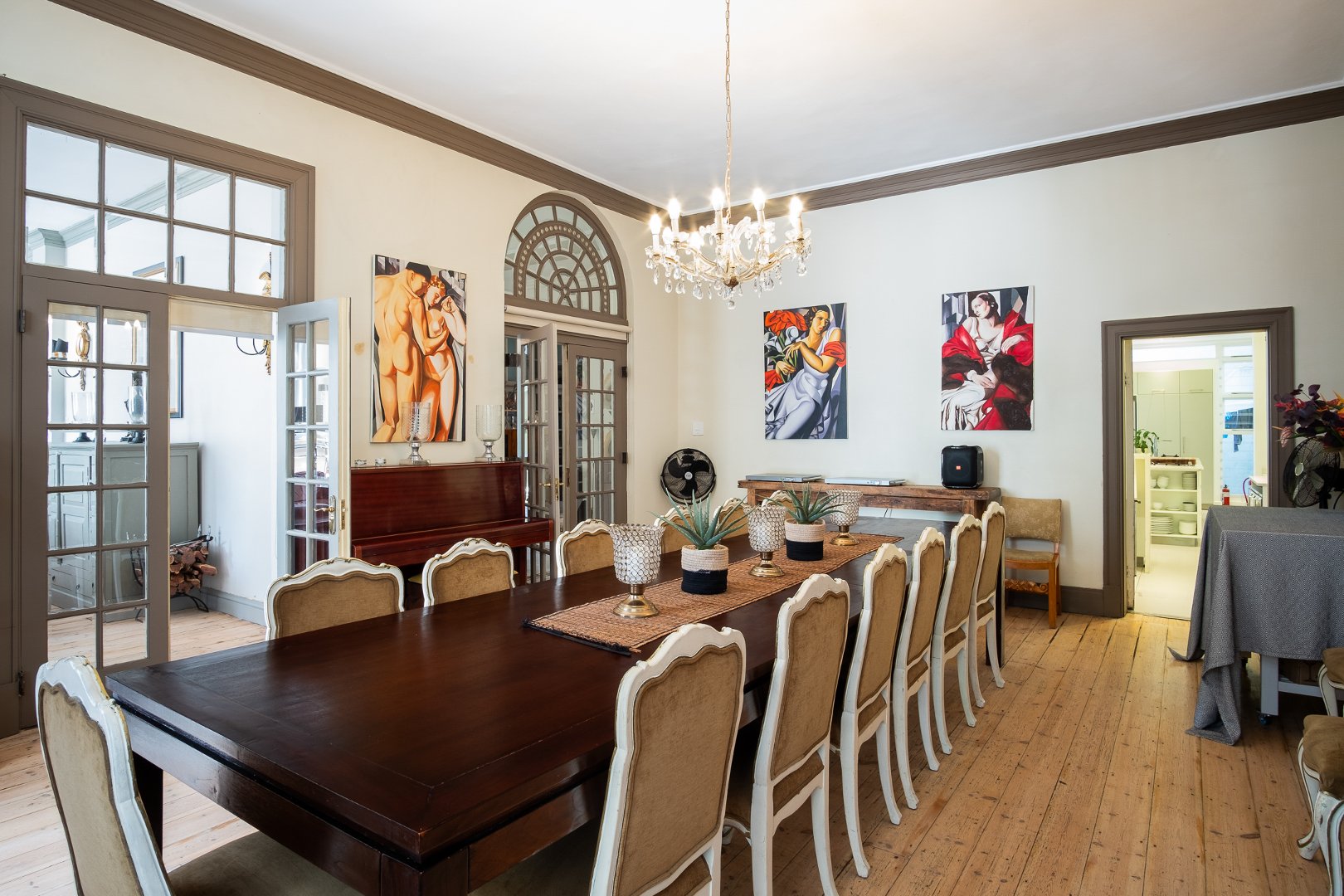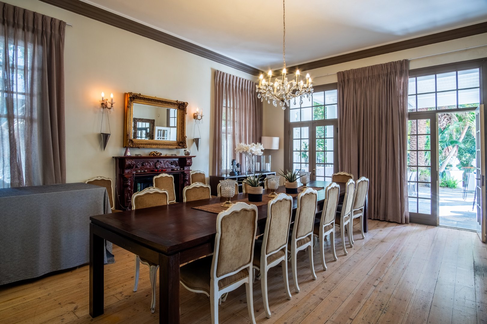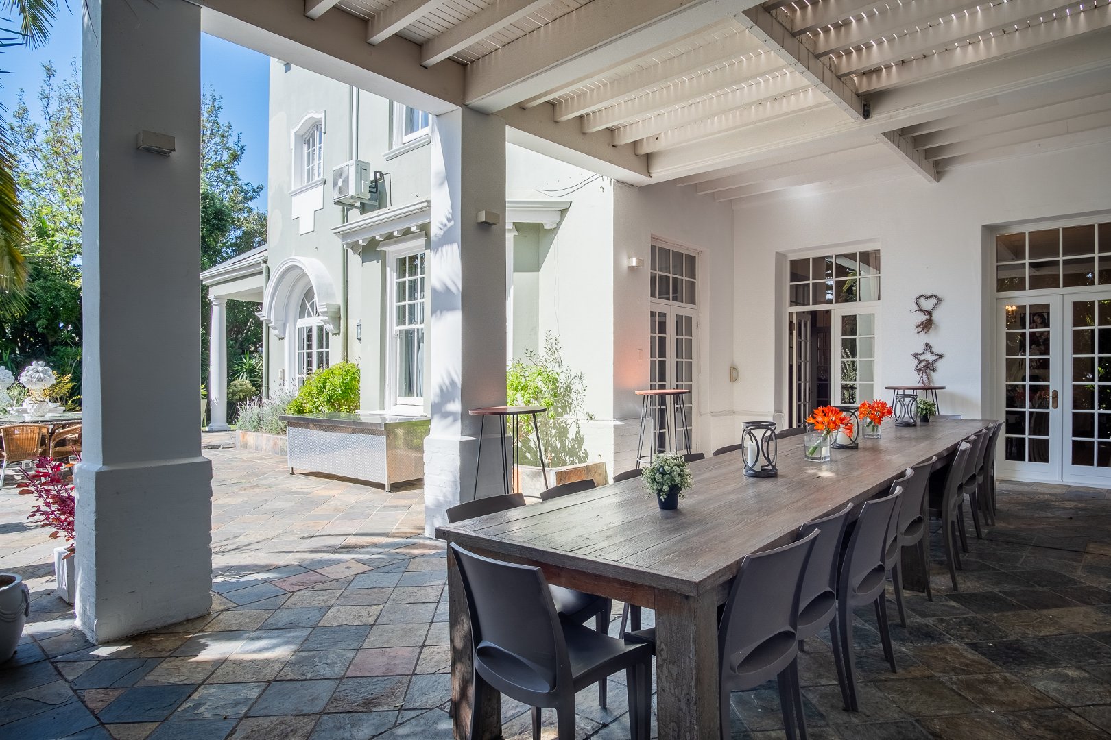 Enter the grand foyer, featuring a lounge area complete with a bar and a classic fireplace, perfect for cozy evenings. Additional highlights include a guest cloakroom and an office. The spacious dining room, adorned with high ceilings, sets the stage for elegant gatherings and cherished memories. It seamlessly extends to a covered entertainment terrace, ideal for alfresco dining, and an adjacent sunlit patio with captivating garden and pool vistas. The substantial chef’s kitchen is a culinary haven, where family and friends can come together to cook, dine, and create memorable feasts. Separate laundry and scullery areas lead to an exterior space with a restroom.