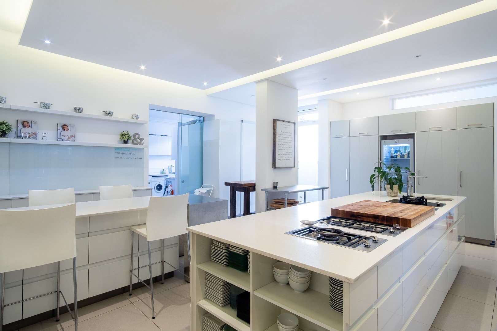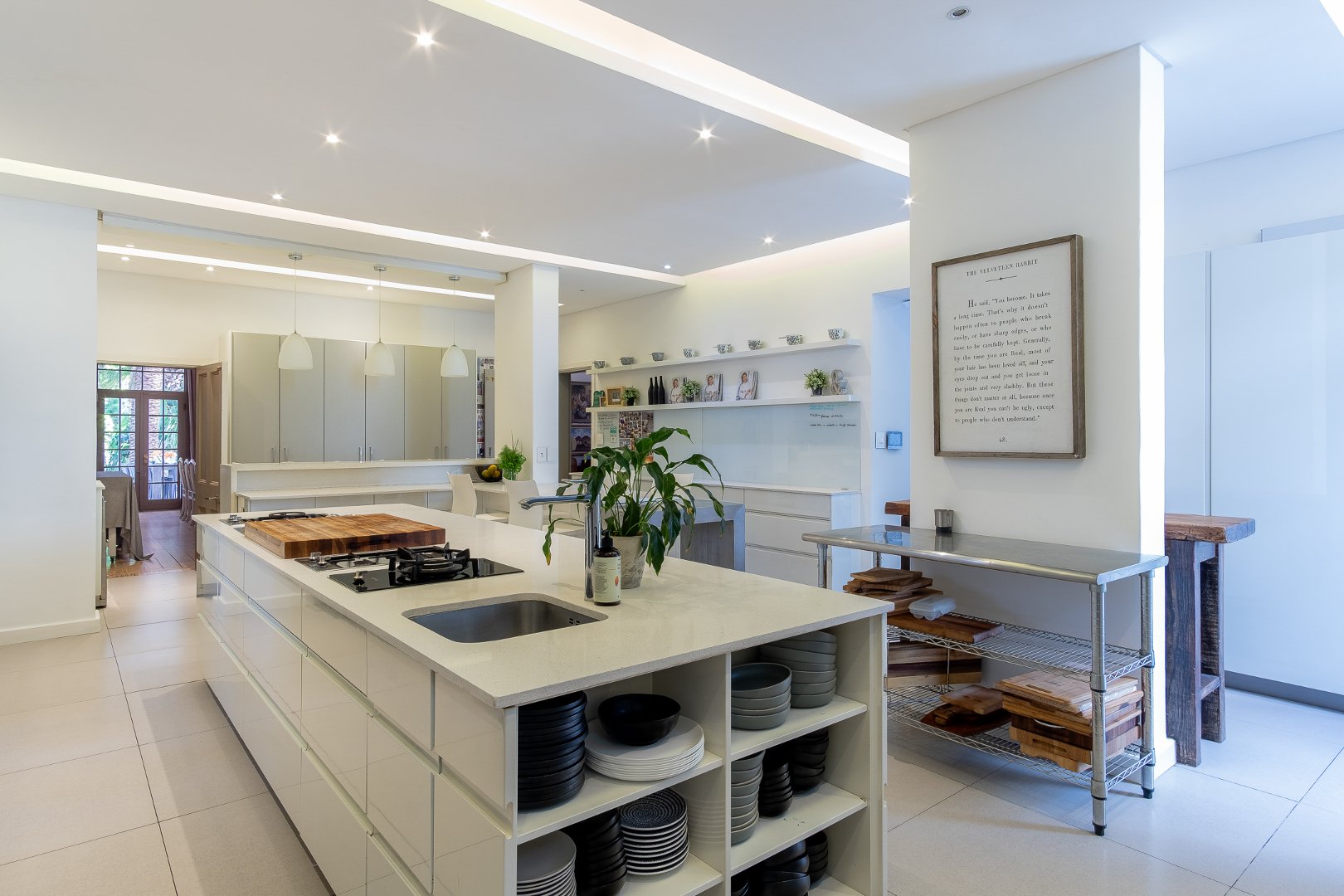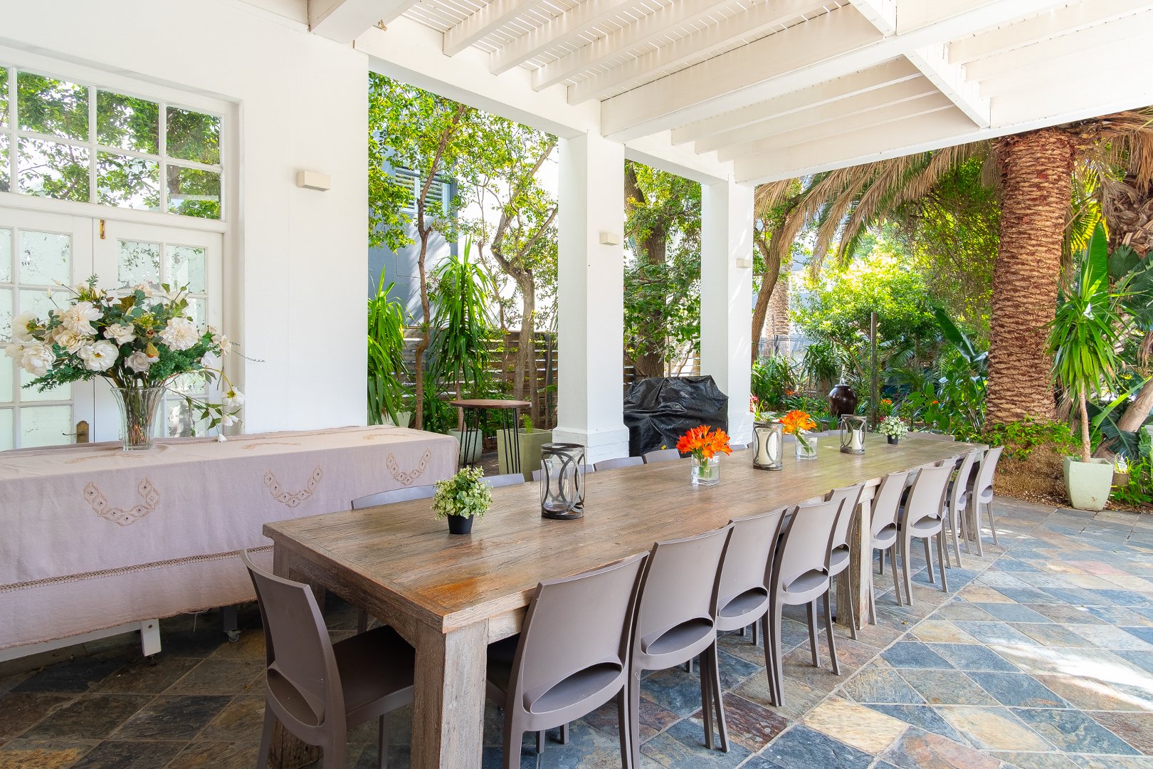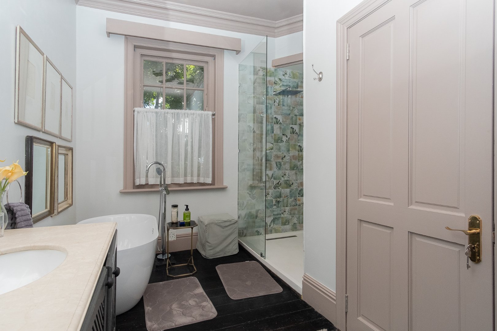 Enter the grand foyer, featuring a lounge area complete with a bar and a classic fireplace, perfect for cozy evenings. Additional highlights include a guest cloakroom and an office. The spacious dining room, adorned with high ceilings, sets the stage for elegant gatherings and cherished memories. It seamlessly extends to a covered entertainment terrace, ideal for alfresco dining, and an adjacent sunlit patio with captivating garden and pool vistas. The substantial chef’s kitchen is a culinary haven, where family and friends can come together to cook, dine, and create memorable feasts. Separate laundry and scullery areas lead to an exterior space with a restroom.