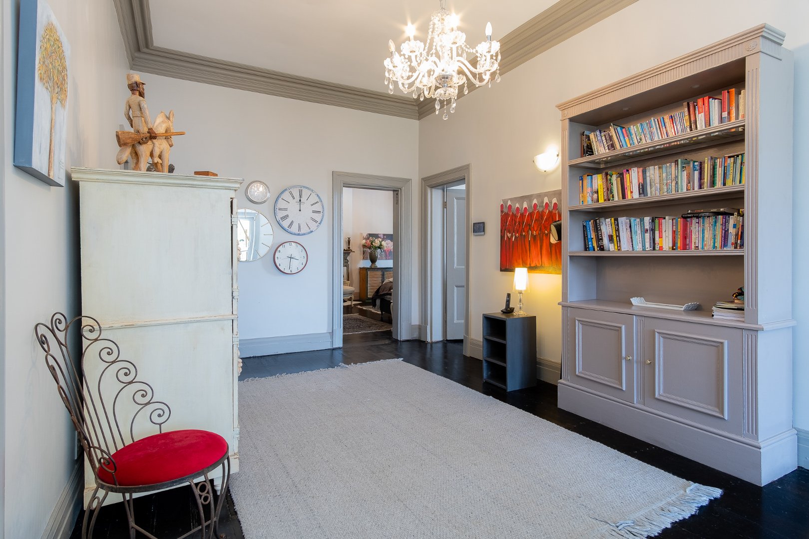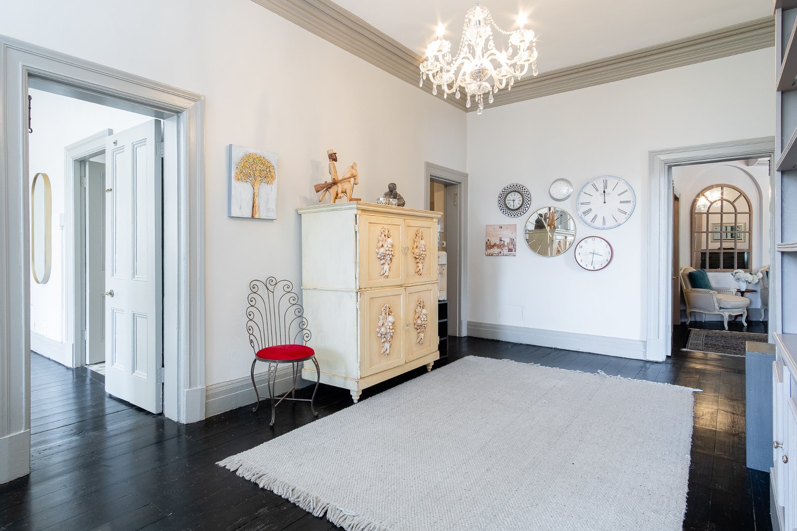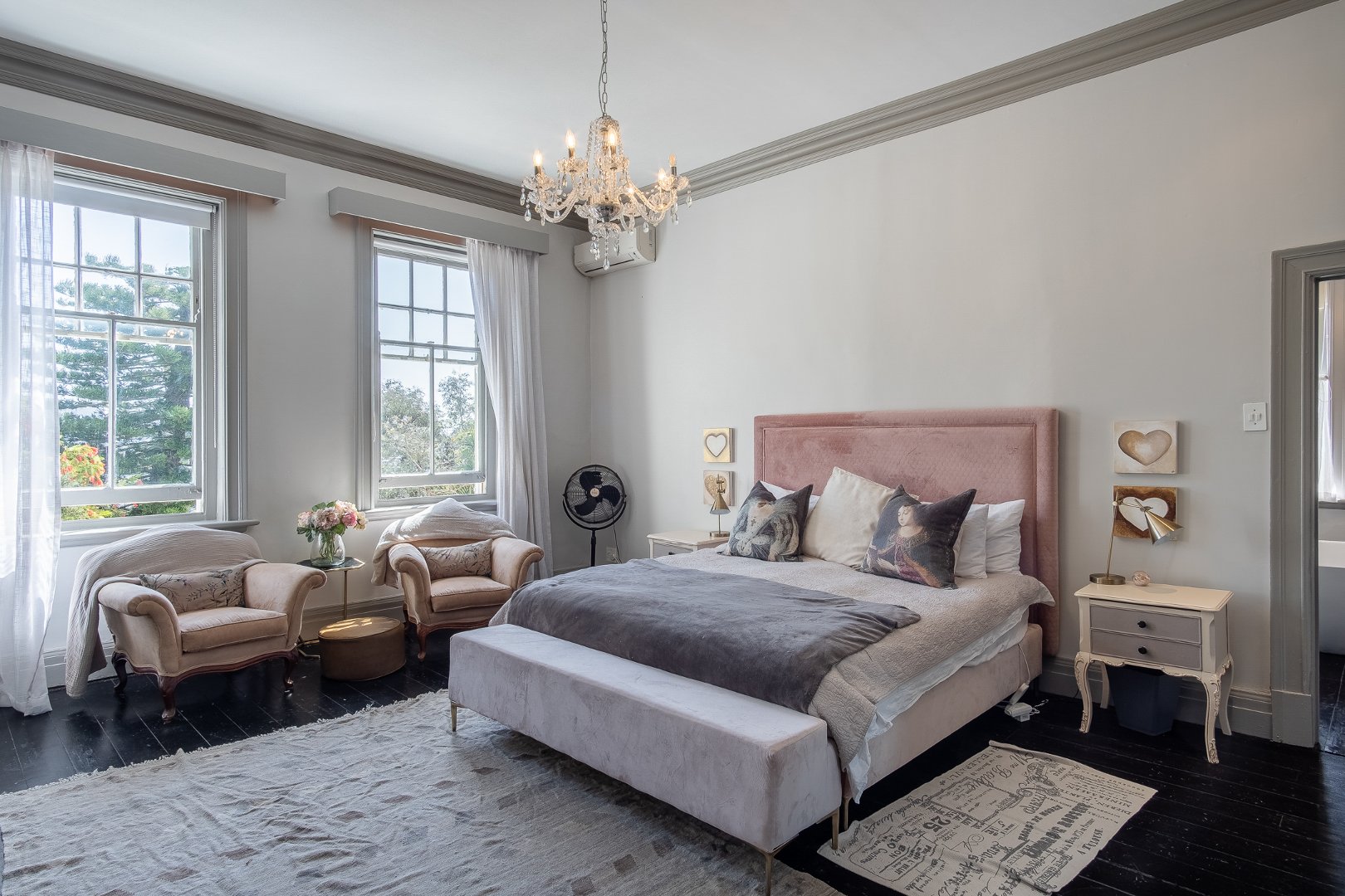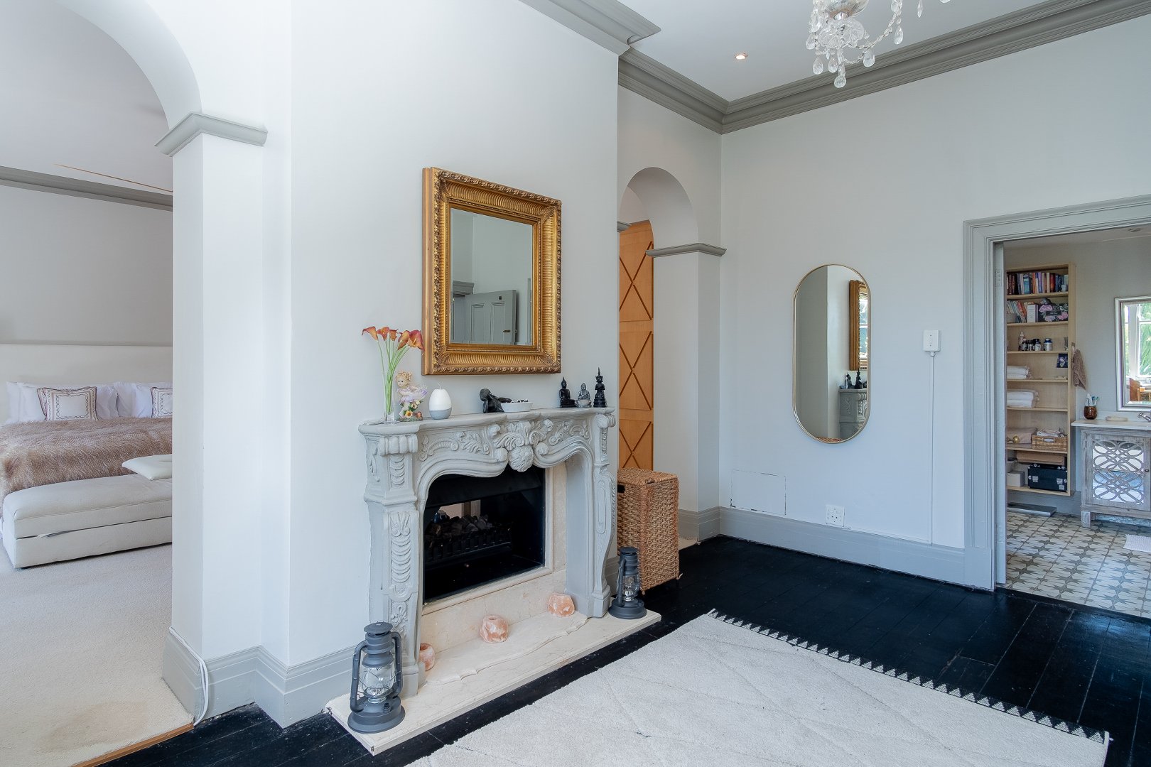 Ascend the staircase to the upper-level accommodations, where a generous landing connects to four generously sized bedrooms, each boasting its own en-suite bathroom and fireplace, along with ample built-in storage. Two of these bedrooms open onto private sunlit balconies, offering a tranquil spot for morning coffee or evening breezes.