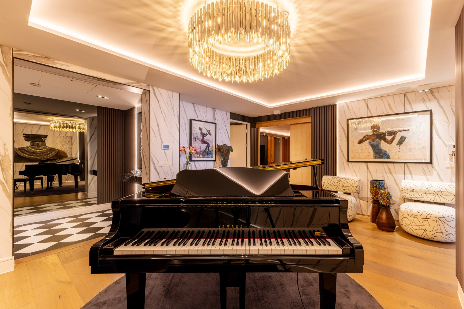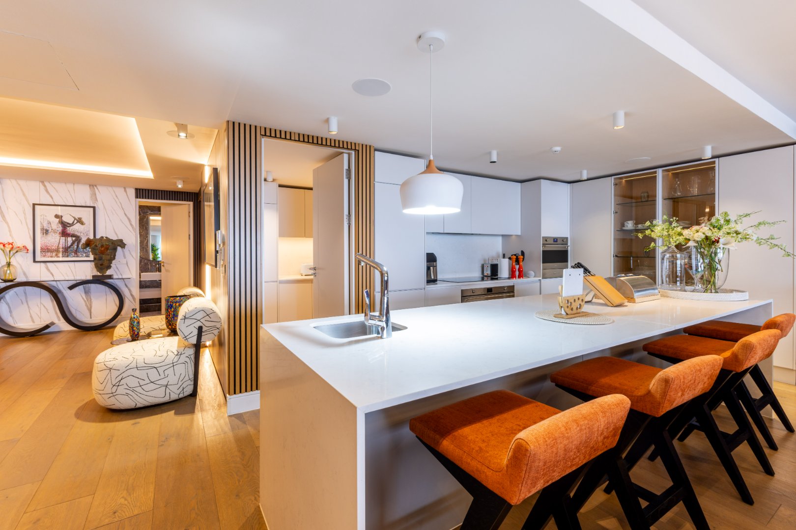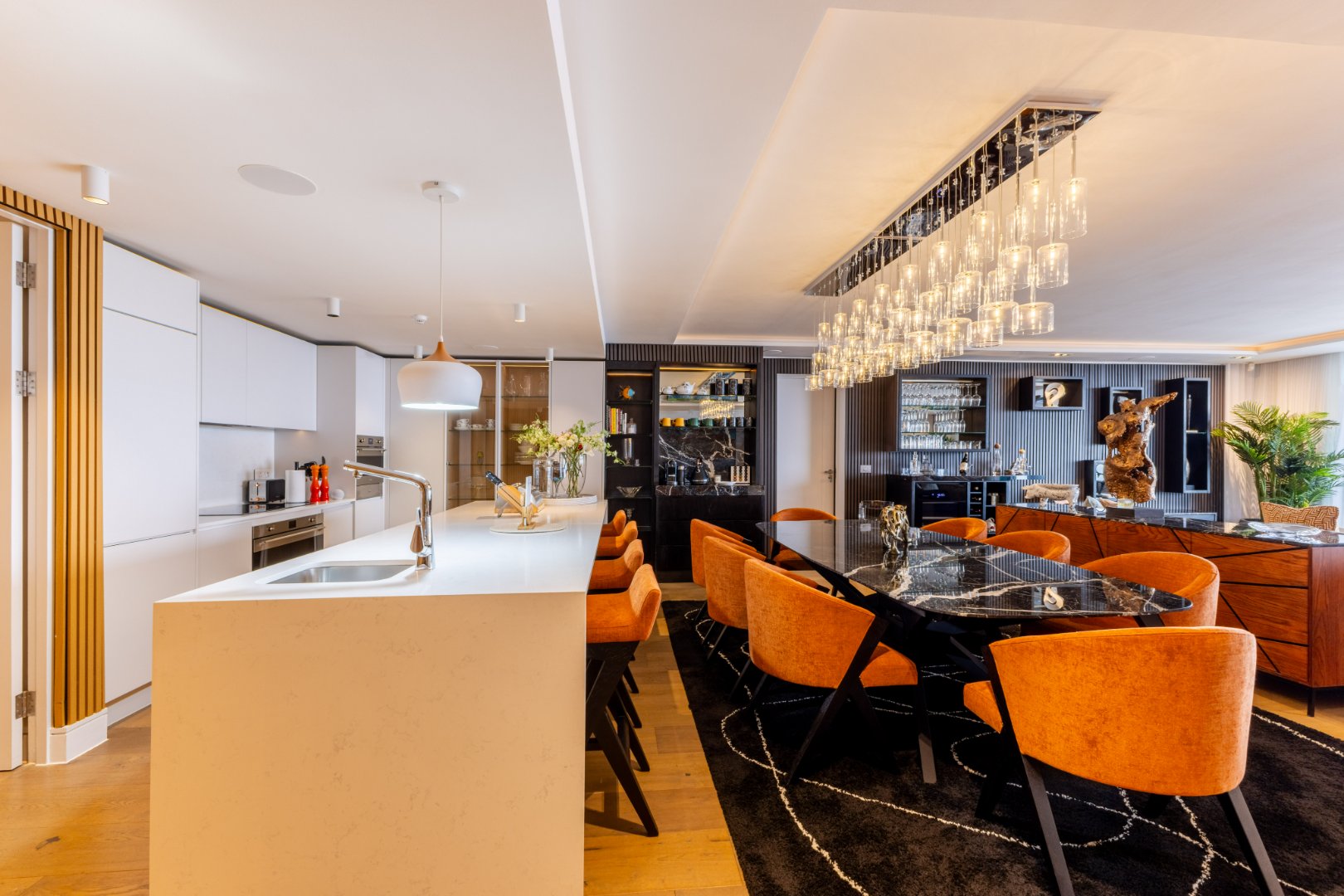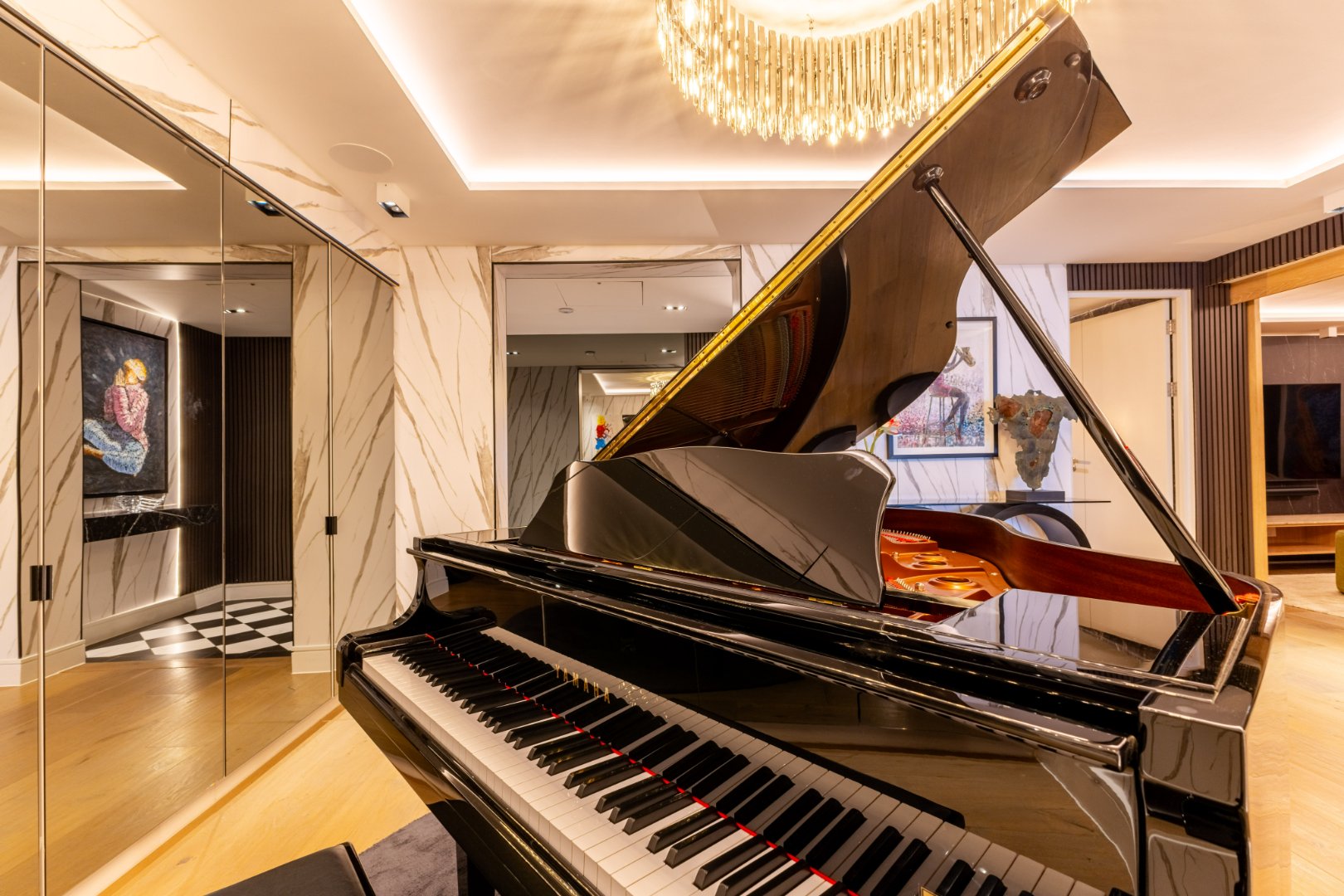 The layout has been thoughtfully composed for both grand entertaining and private retreat. Three spacious en-suite bedrooms include a magnificent master suite, complete with its own gym and walk-in dressing room. A guest cloakroom and impeccably detailed bathrooms showcase finishes of the highest calibre.