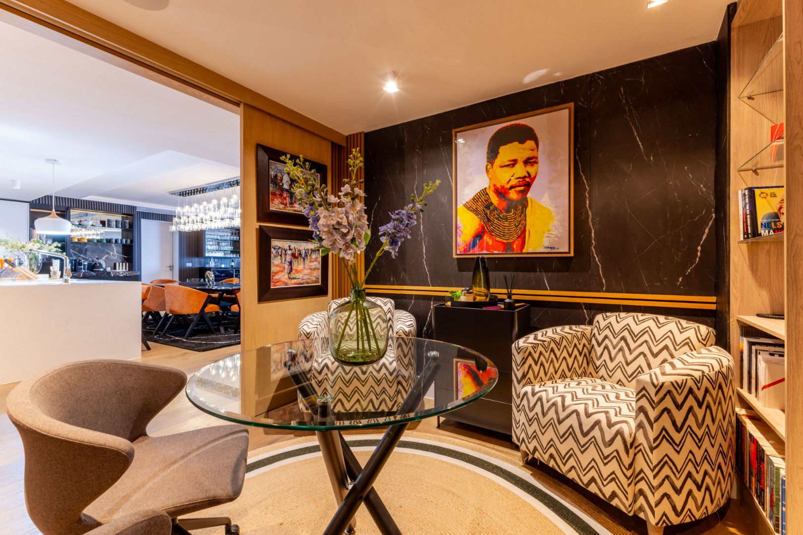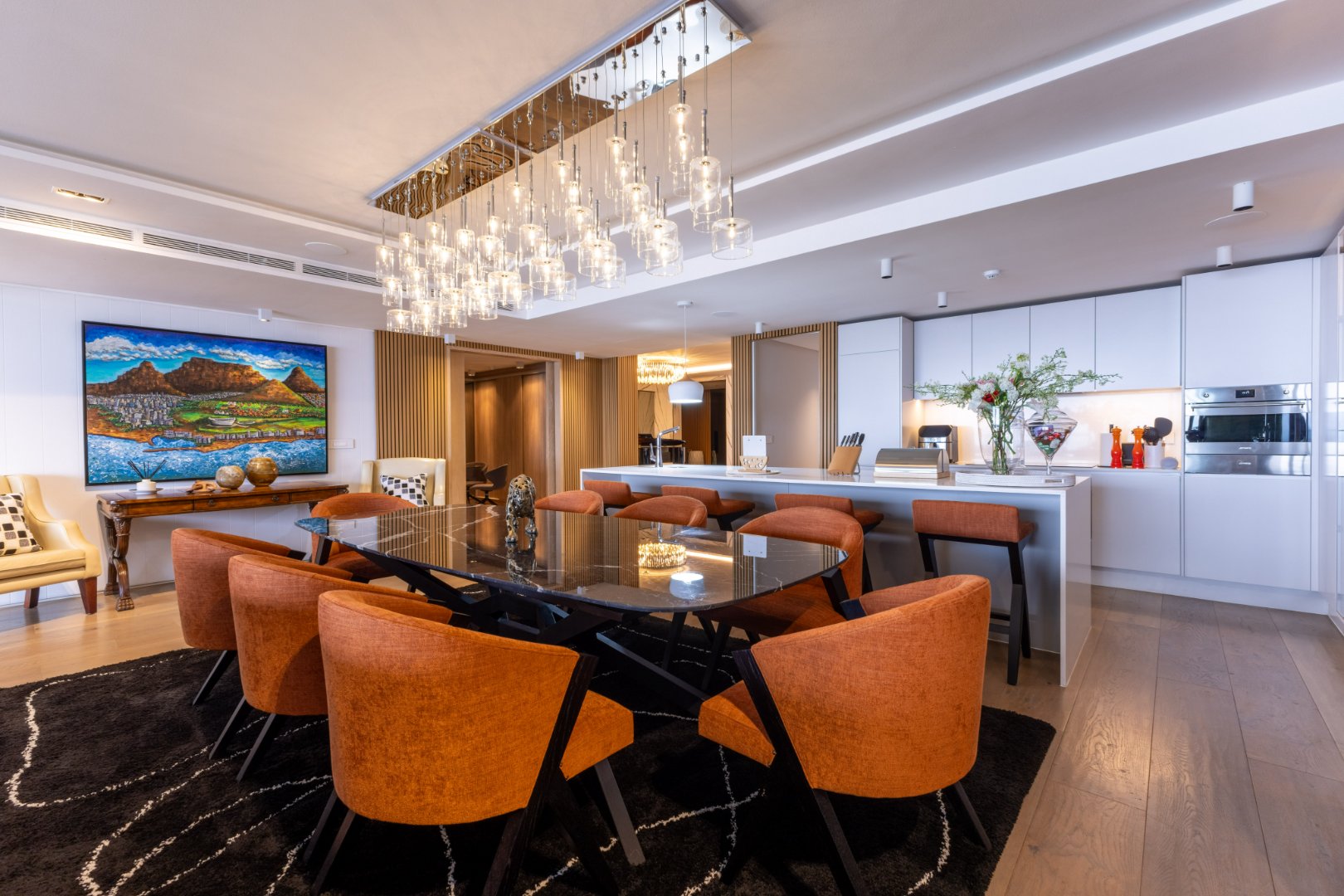 The culinary heart of the home features a gourmet kitchen with integrated appliances, scullery, and pantry — a seamless extension to the expansive dining and lounge areas. Floor-to-ceiling glass doors dissolve boundaries, opening to a wraparound balcony that captures Cape Town’s ever-changing horizon.