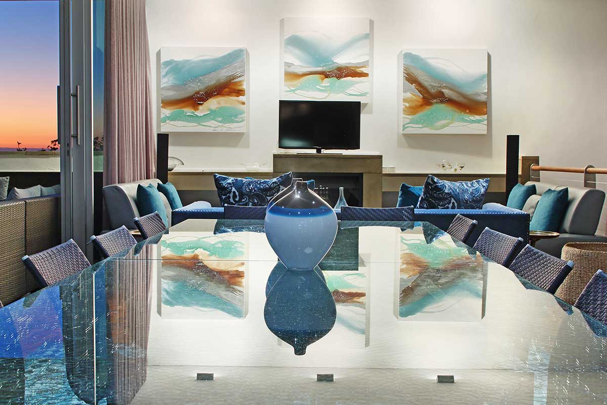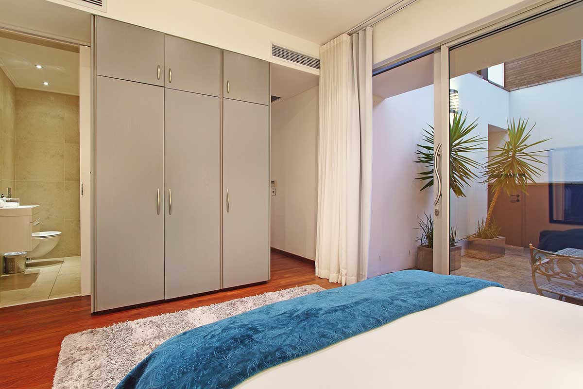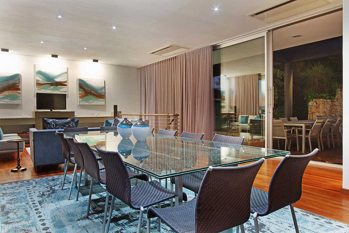 The heart of the villa is upstairs where you will find a spacious open plan living area with wall to wall glass doors spilling onto the sheltered back terrace and the large sparkling pool. The dining area flows naturally onto the covered front terrace with the BBQ and comfortable outdoor furniture for those ample days of sunshine, sundowner sessions and wonderful sea and mountain views.