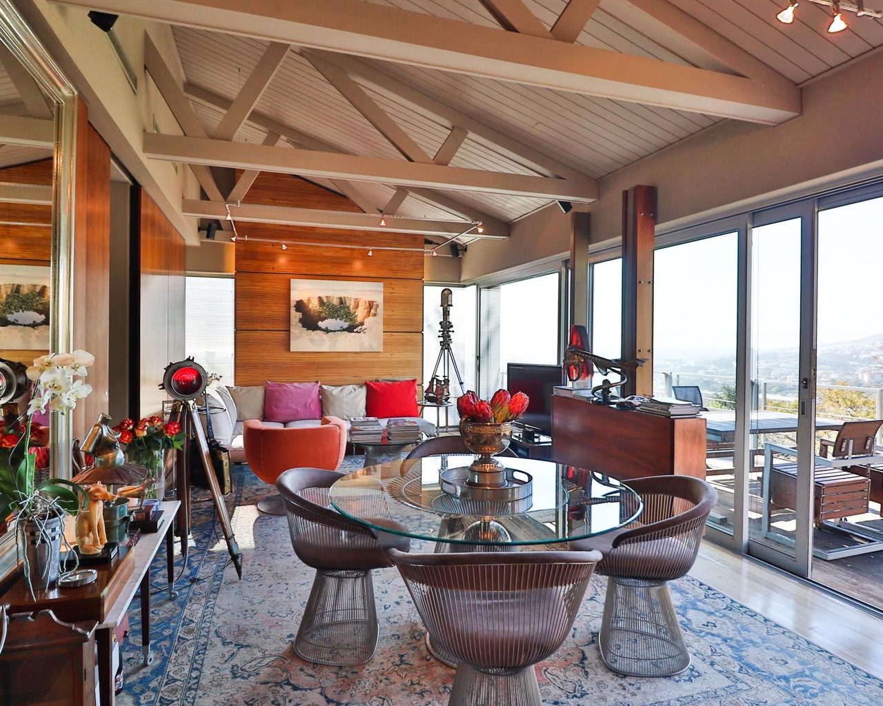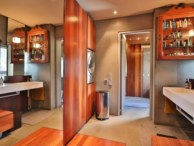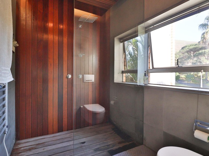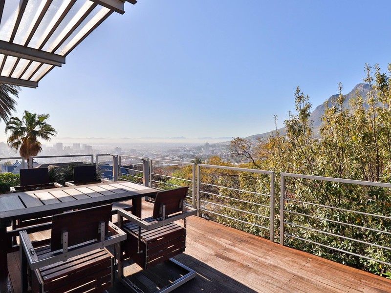 The open kitchen is fitted with integrated fridge, fitted with Jarrah wood, Bosch dishwasher, microwave and oven. The dining and lounge area is light and bright and leads out to a large entertainment deck area overlooking the majestic Table Mountain and blossoming Jacaranda trees. Currently there is a solid wood outside dining table and chairs with a gas braai. The deck area has security cameras and has a built in alarm system.