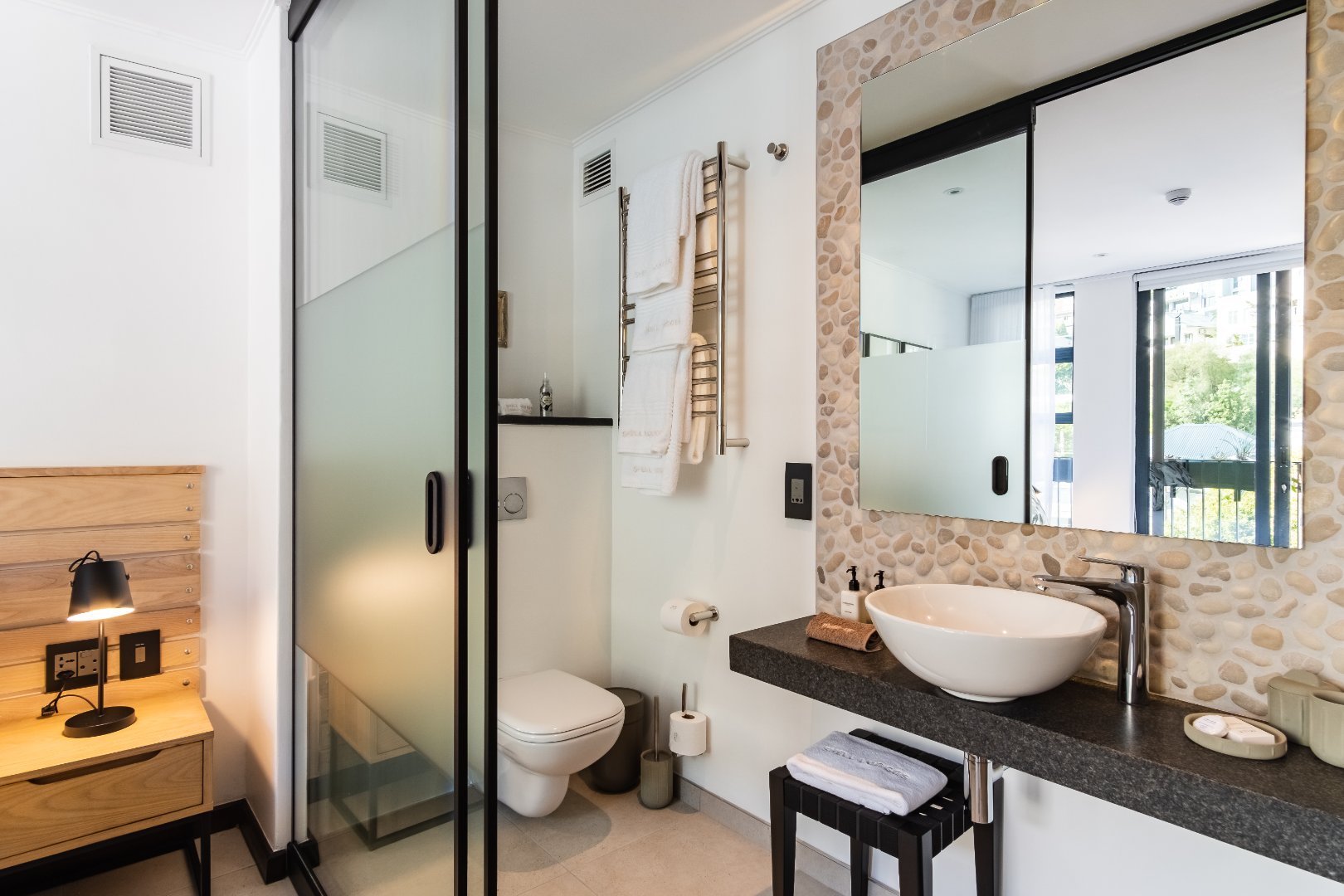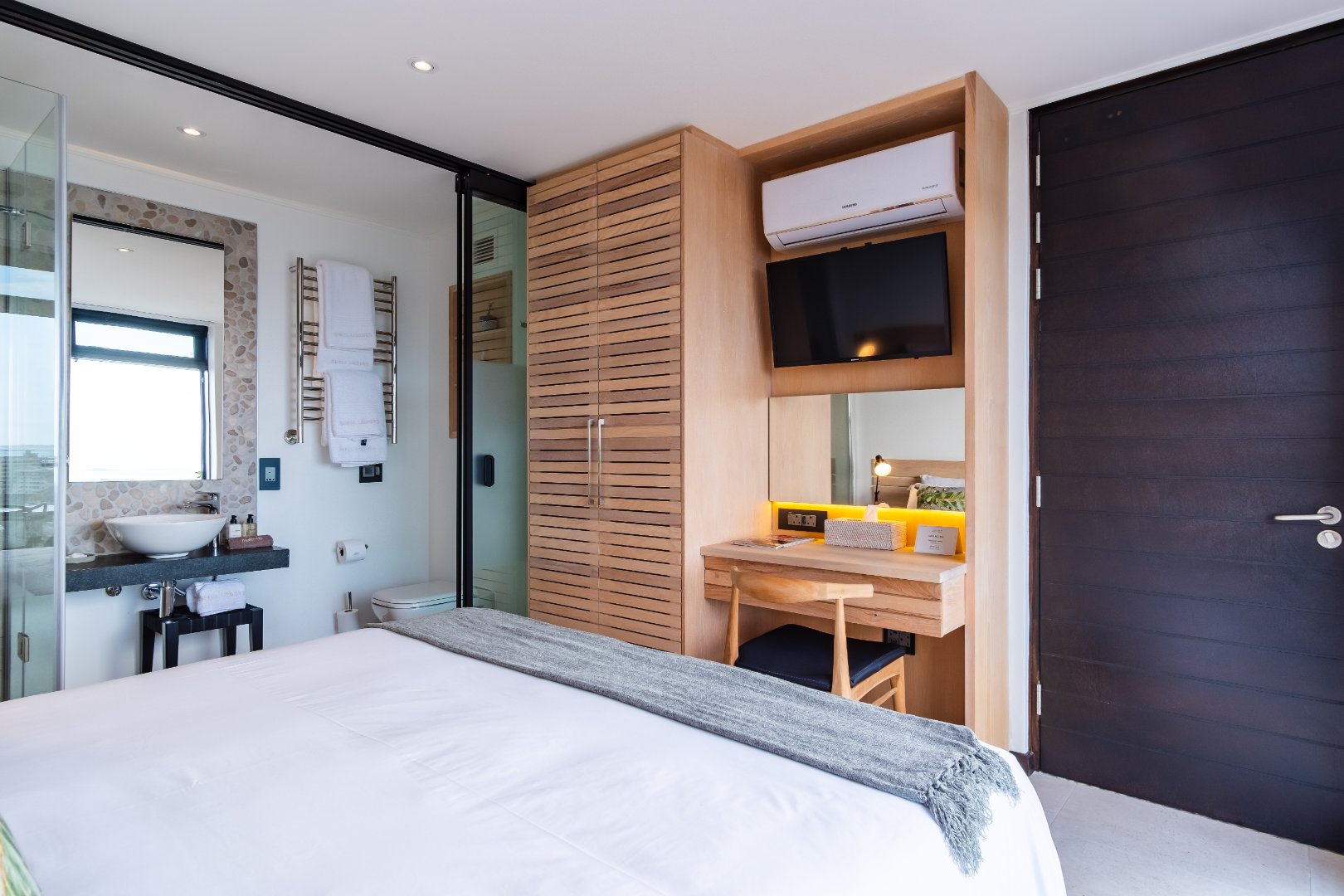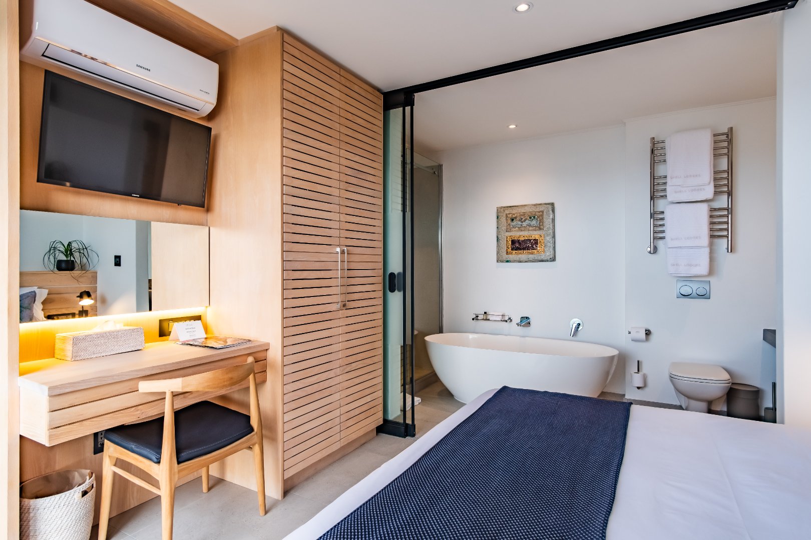 Room No 2 – is a King / Twin bedded room with en-suite bathroom with walk in shower, heated towel rail and shaving plug. There is a television with Netflix, a digital safety deposit box, vanity mirror, emergency light, air conditioner and underfloor heating. Hairdryer by the dresser as well as enough space for your luggage. View of the iconic Signal Hill.