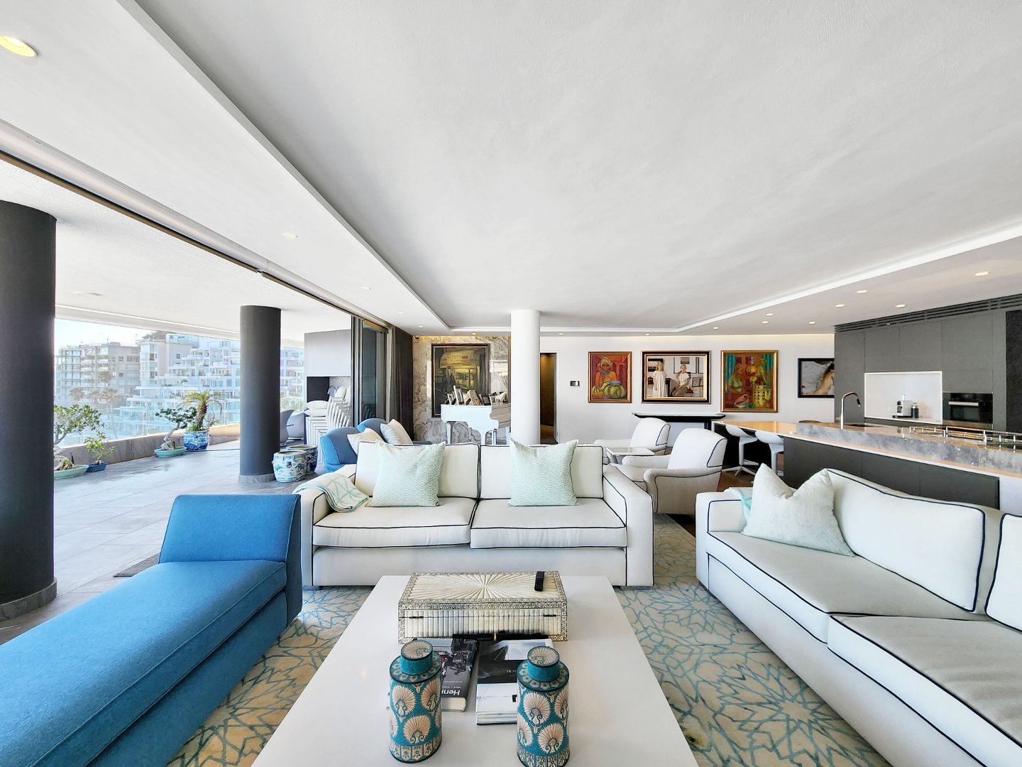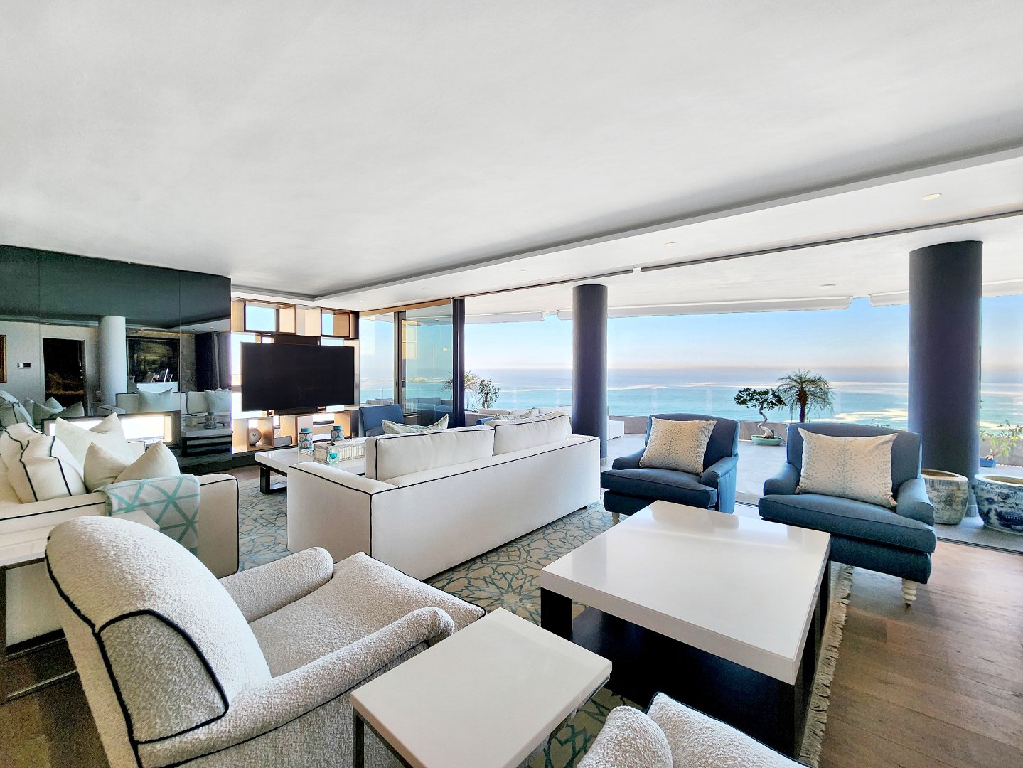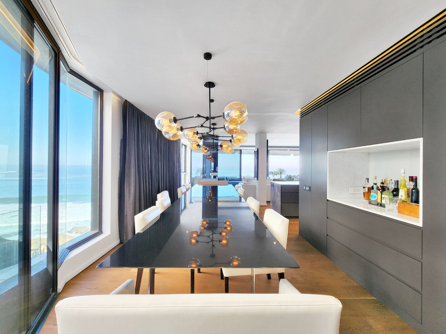The open-plan designer kitchen features integrated appliances. An extra-large TV room and a spacious dining room lead to an expansive terrace with ample space for watching the ocean roll in, perfect for alfresco entertaining.