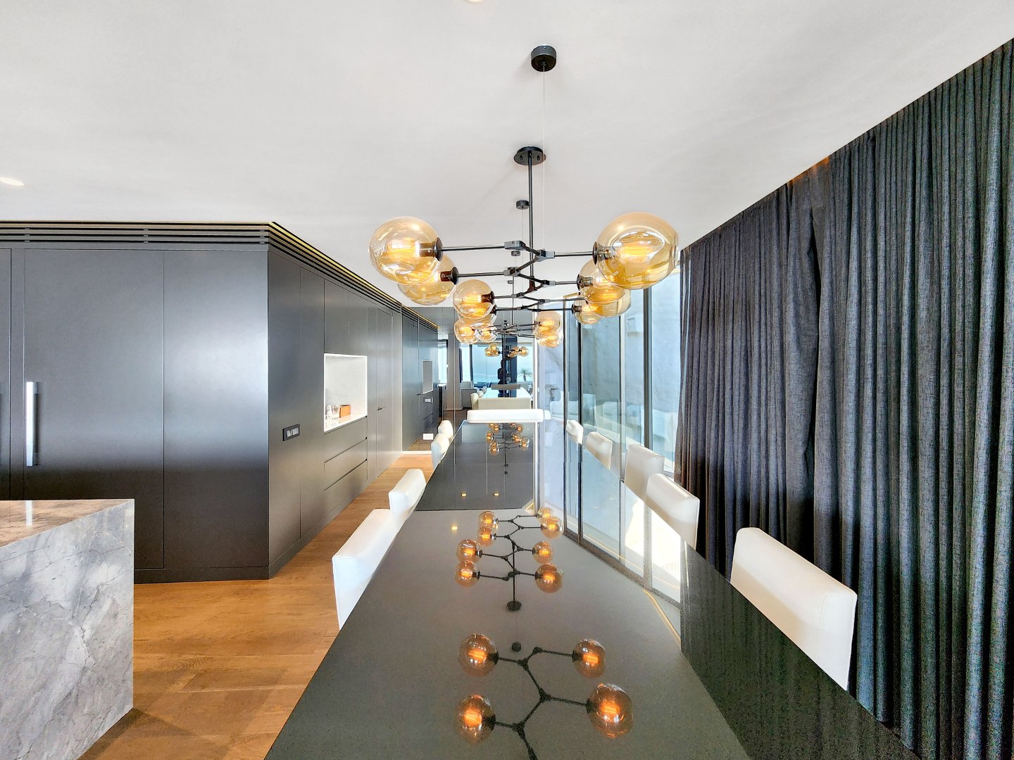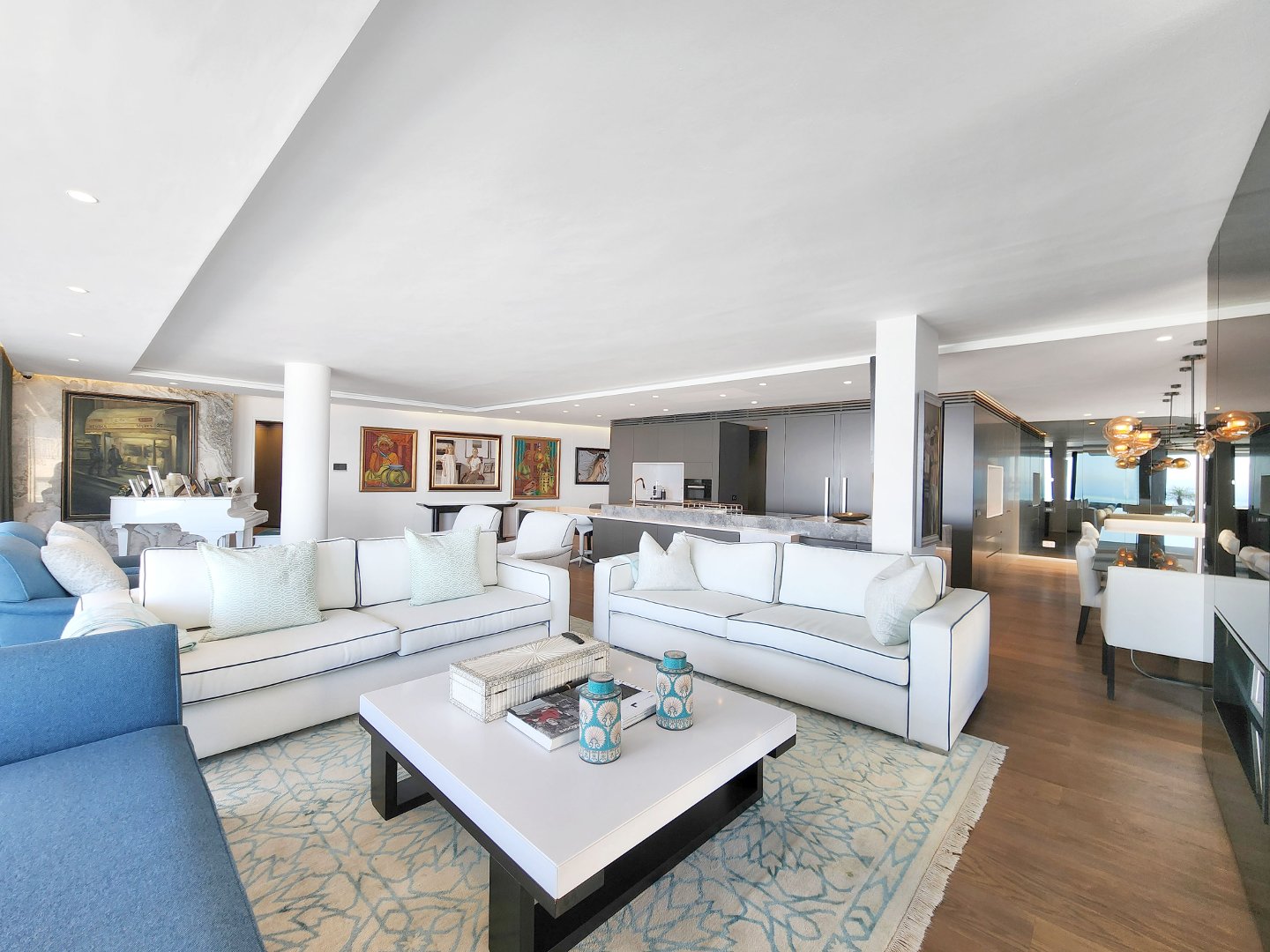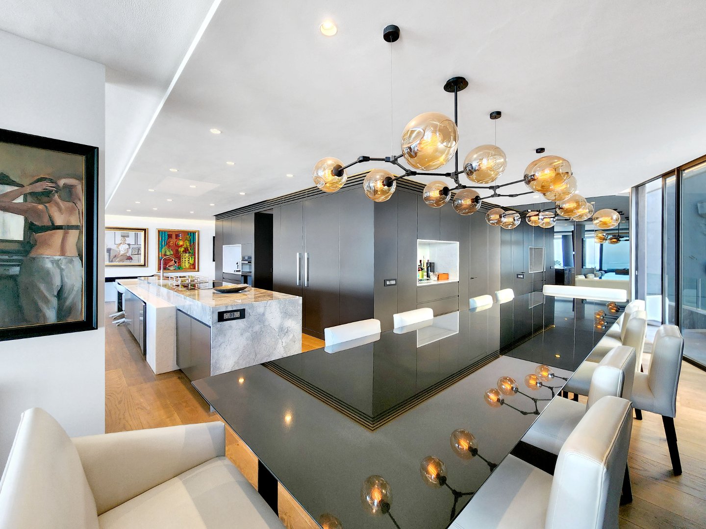 The open-plan designer kitchen features integrated appliances. An extra-large TV room and a spacious dining room lead to an expansive terrace with ample space for watching the ocean roll in, perfect for alfresco entertaining.