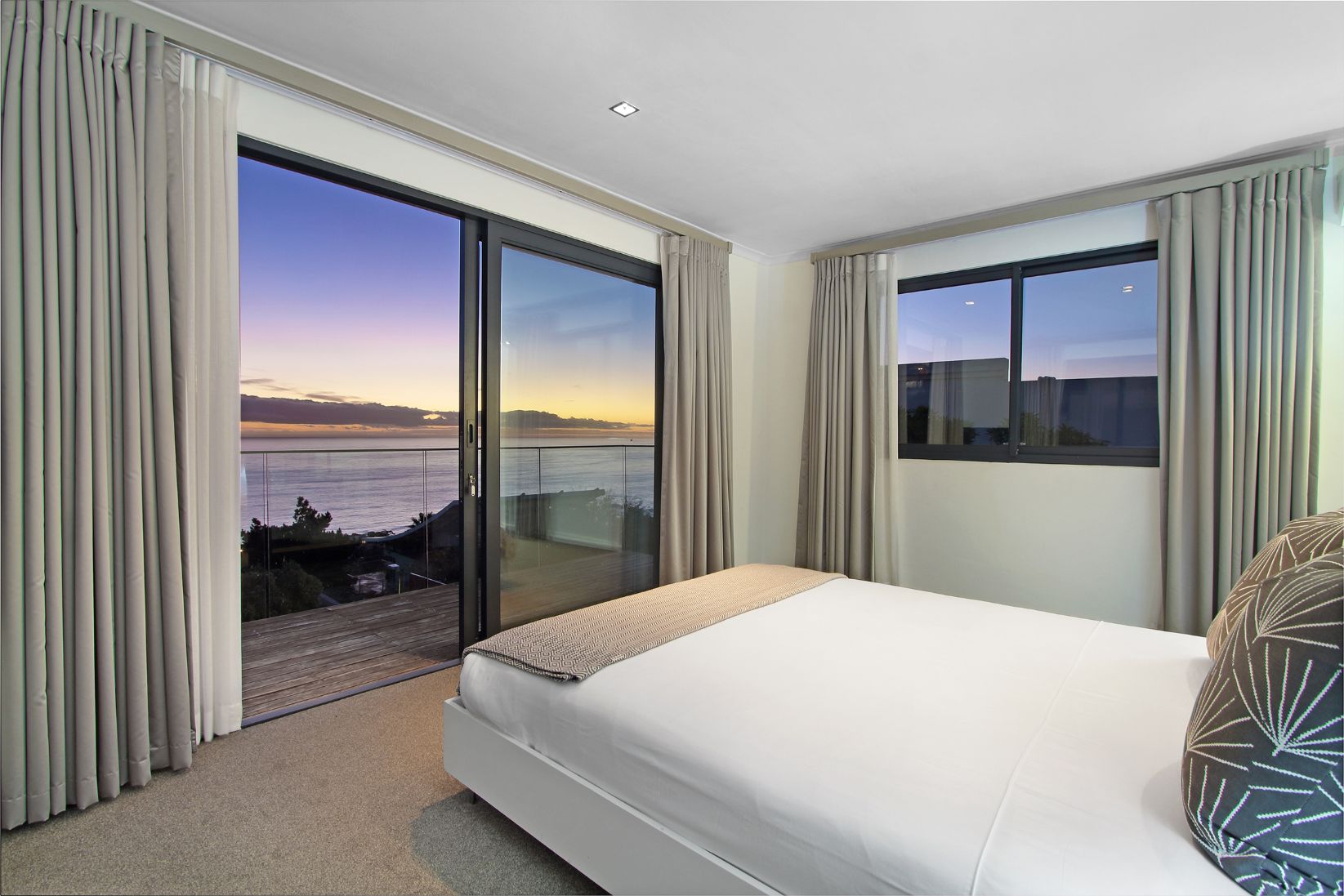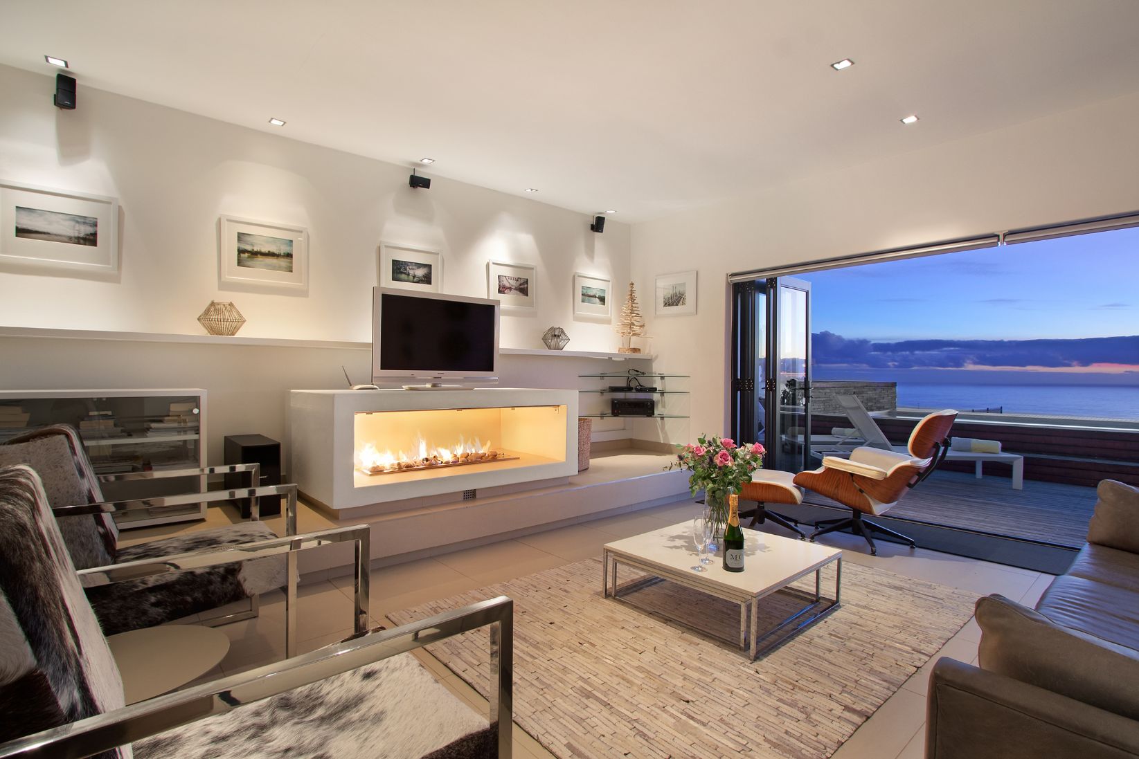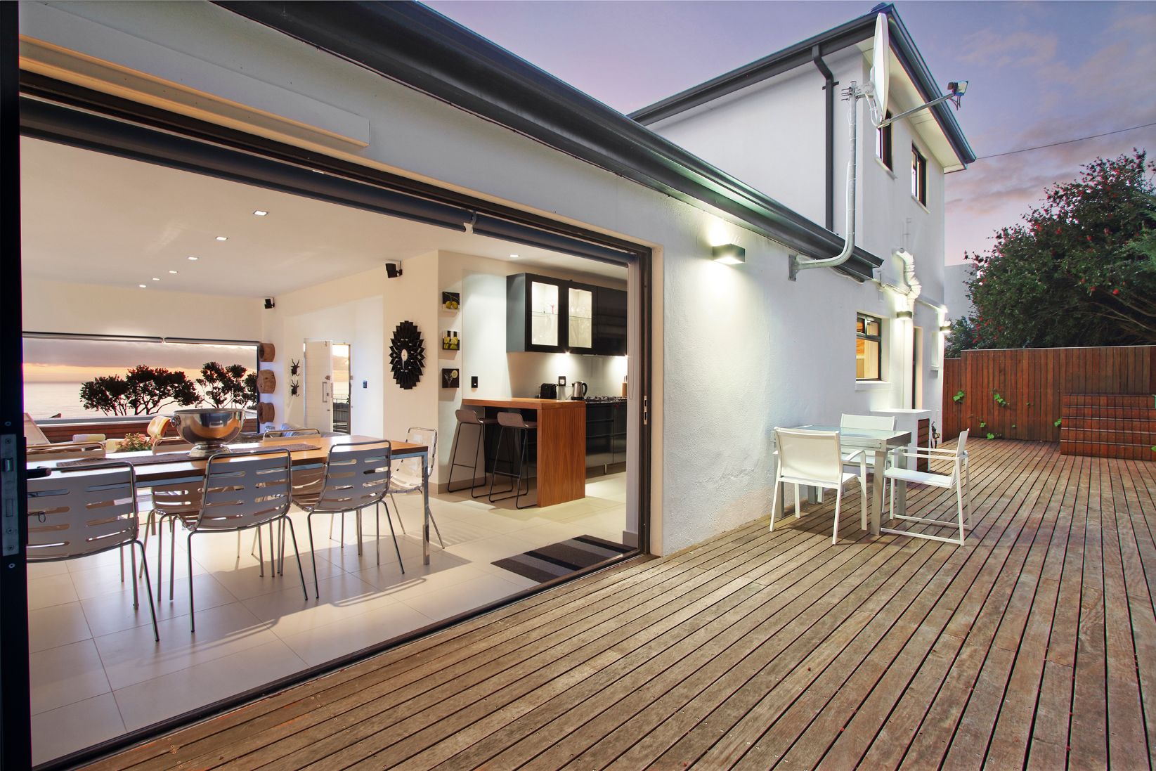 The lounge has a lovely large plasma TV and big comfy couches to relax in. A pebble fireplace makes it an ideal space for those cold winter nights. All three double bedrooms are sea-facing. Two bedrooms are located downstairs (one of which has an en-suite bathroom) and the master bedroom is located on the upper level (also with en-suite bathroom). The outdoor area has a large private deck that is ideal for those that love entertaining and is the perfect sundowner spot.