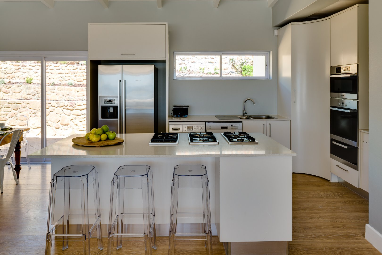 – Open plan with gas stove, combo oven/microwave and separate oven